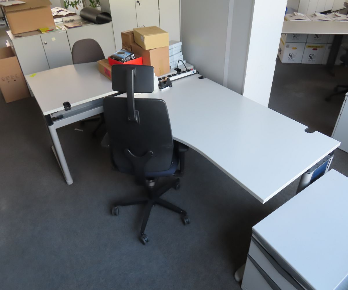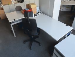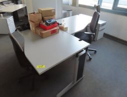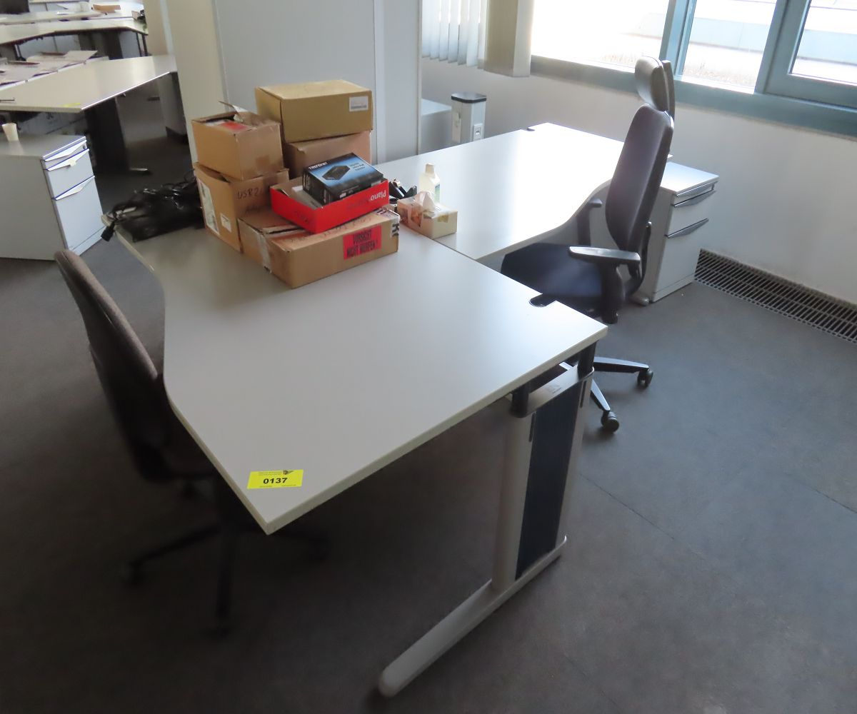 1 Doppelschreibtisch-Arbeitsplatz, bestehend aus 2 x Schreibtisch, geschwungene Form, 1 x Rollcontainer, 2 x Bürodrehstuhl, Stoffbezug