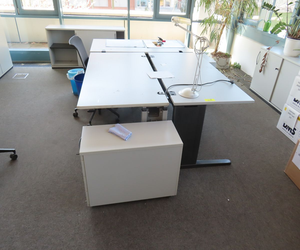1 3er-Schreibtisch-Arbeitsplatz, bestehend aus 3 x Schreibtisch, 3 x Rollcontainer, 2 x Bürodrehstuhl sowie 1 x Schreibtischleuchte