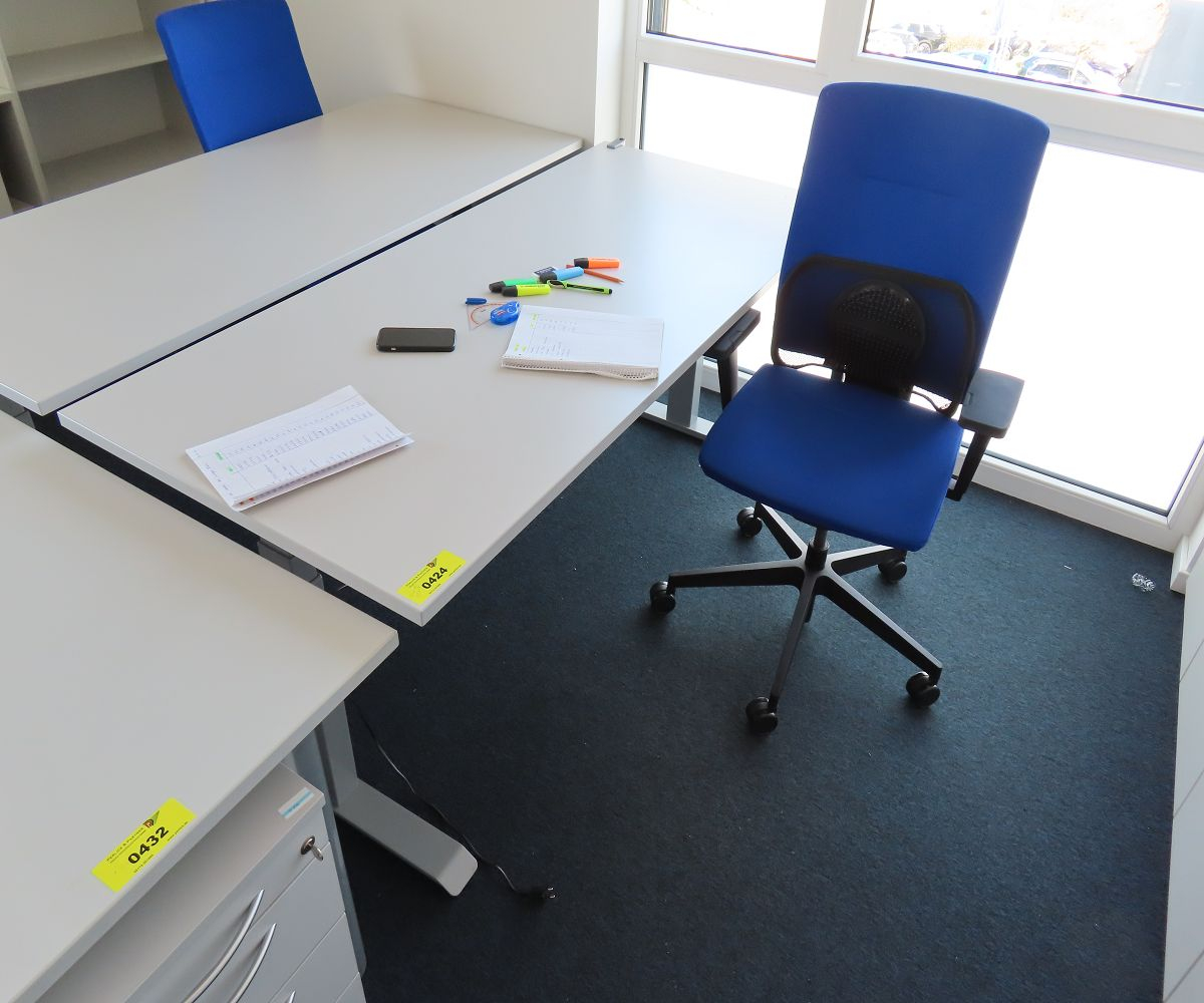 1 Schreibtisch, elektrisch höhenverstellbar, ca. 180 x 80 cm, 1 x Beistellcontainer, 1 x Bürodrehstuhl, Stoffbezug, Armlehne