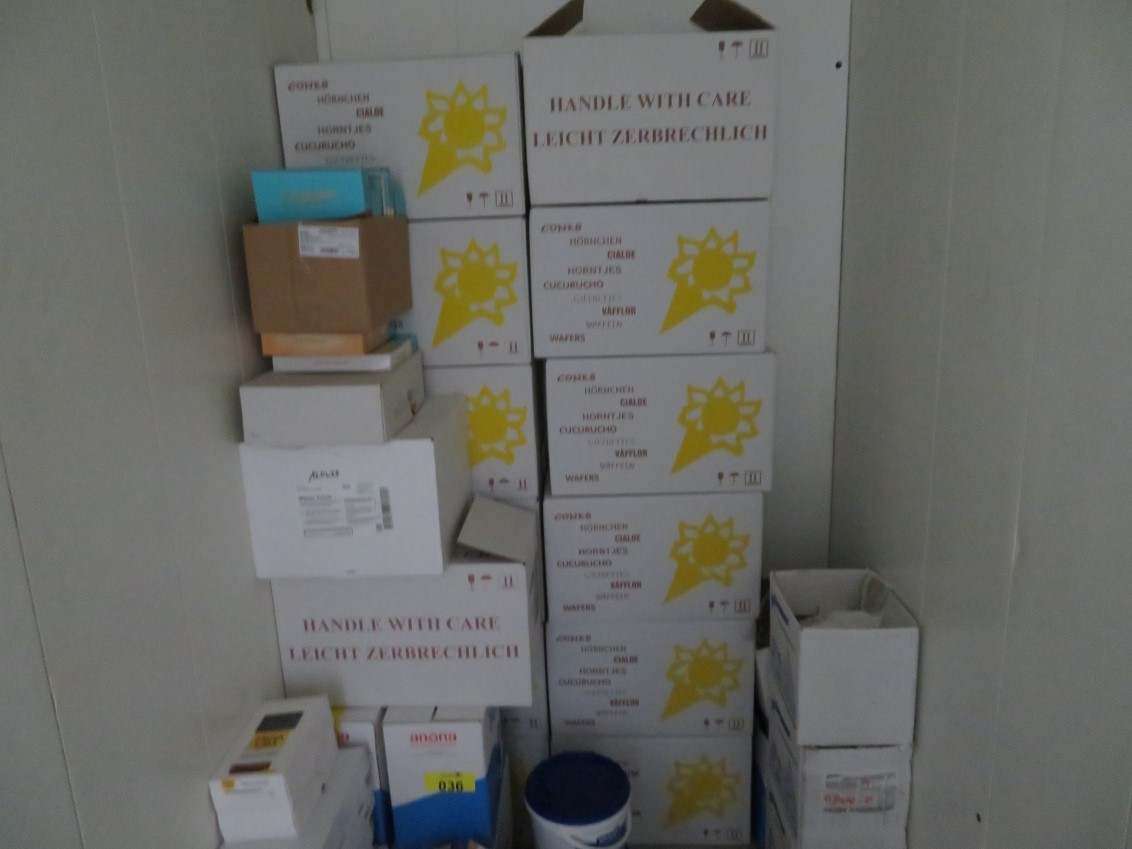 1 Posten Eiszutaten, bestehend aus: 4 Kartons Softeis-Pulver, Fabr. Anona, Softeispulver Eisfix, á 10 Beutel mit jeweils 1 kg, 11 Kartons mit Waffelbechern, Fabr. LaE Excellent, Typ Waffelbecher 060 EMU, Artikel-Nr. 1339, á 630 Stück