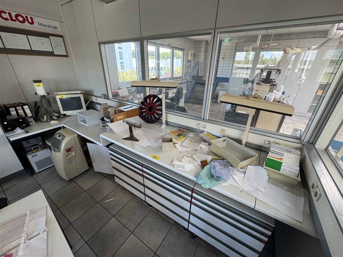 1 Arbeitsfläche, L-förmig, mit Höhenversatz, sowie rollbaren Materialcontainern