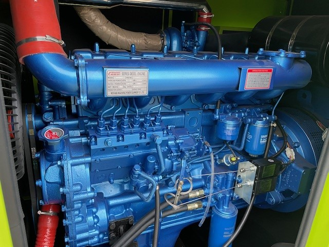 Generator, Fabr. WF HUAZHONG, Typ: HZ100GF, 100 KW, Größe: 2,80 x 1,10 x 1,50 m, Gewicht: 1.380kg, 6 Zylinder, wassergekühlter Diesel-Motor, Motor-Typ :R6105AZLD, jeweils 1 x 16 Ampere, Dose (blau), und 3 x 32 Ampere, Dose (rot)