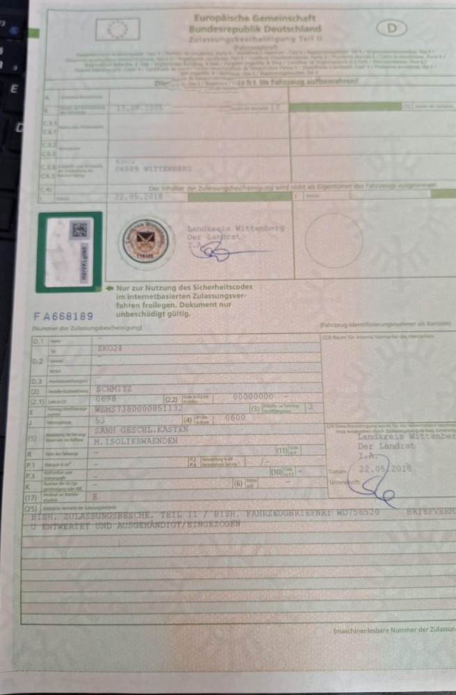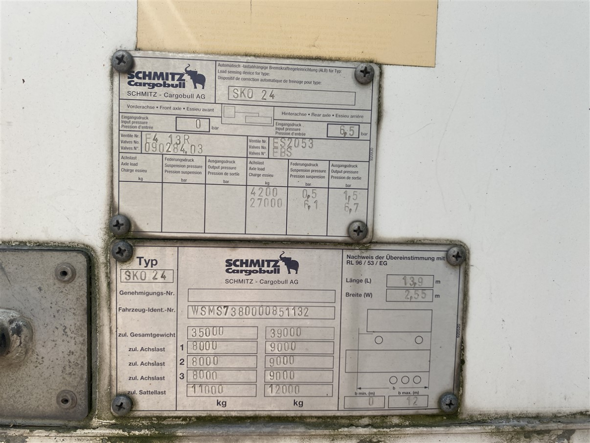 Sattelauflieger, Faltwandkoffer, 3-Achser, Fabr. Schmitz, Typ SKO24, Ident-Nr. WSMS7380000851132, Erstzulassung: 13.09.2005, Länge 13,90 m, Breite 2,55 m, zulässiges Gesamtgewicht 39.000 kg, starke Rostschäden hinten, Luftfederbälge defekt, TÜV bis 03/25