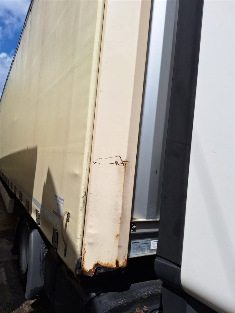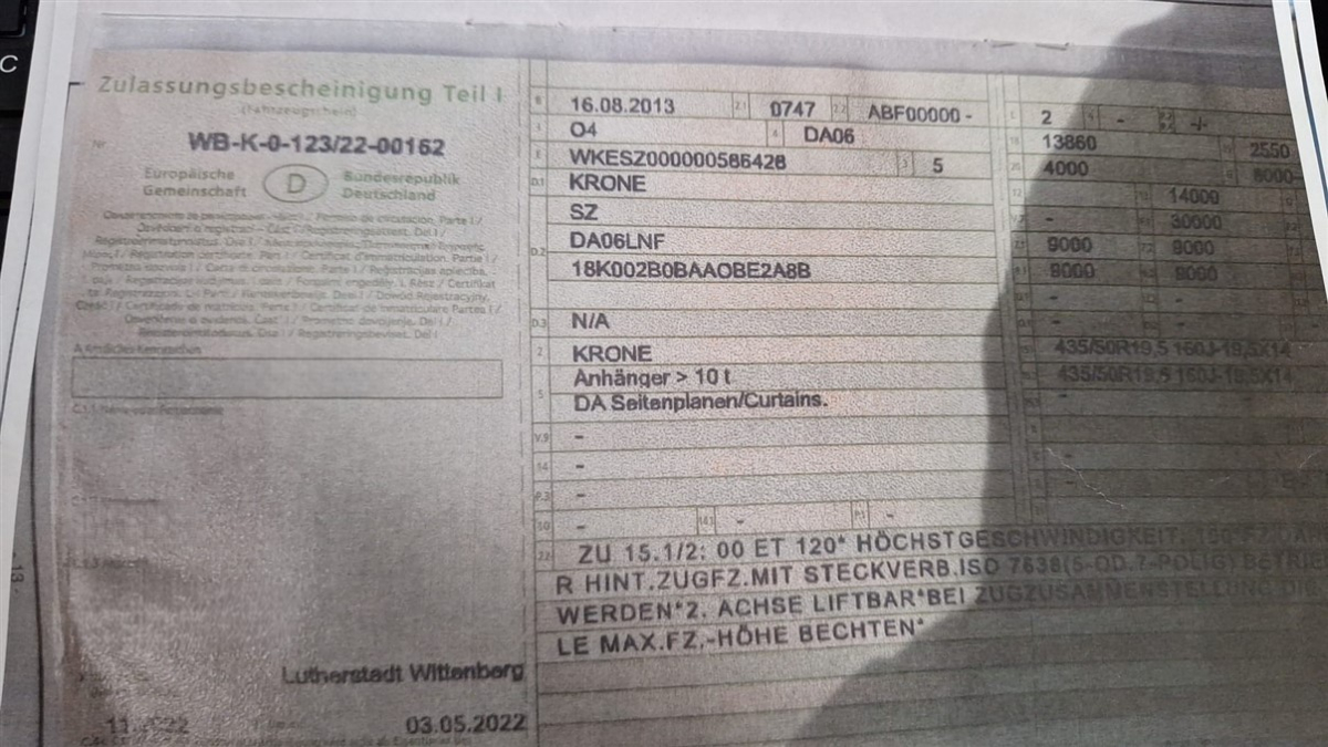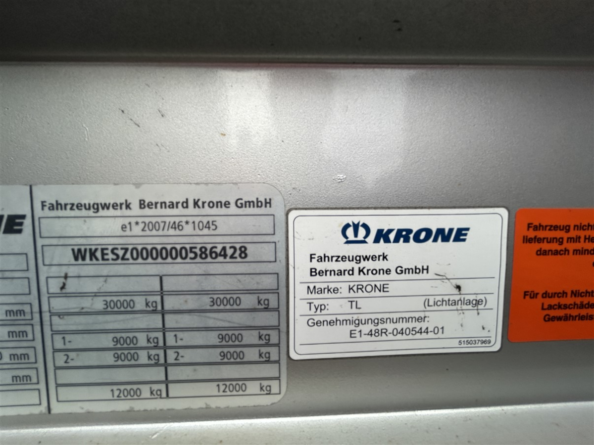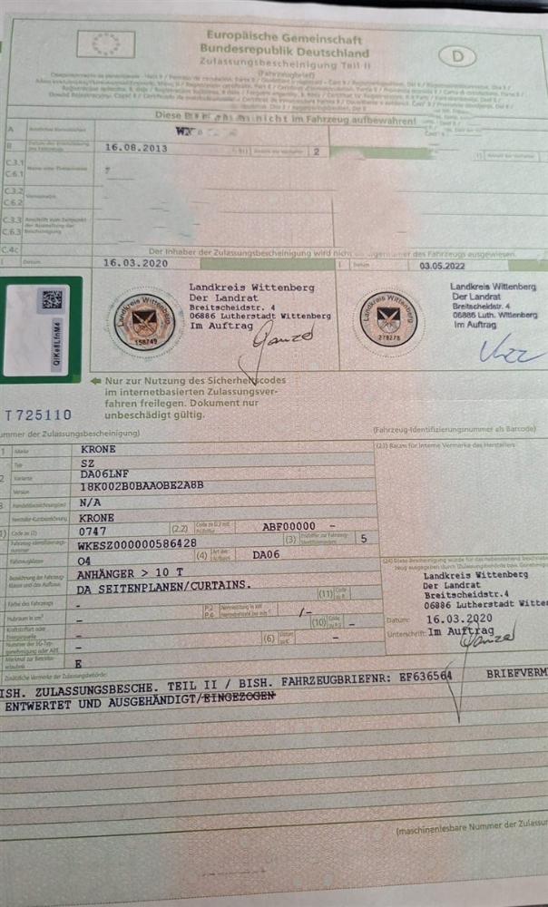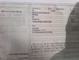 Sattelauflieger mit Plane und Spriegel, Fabr. Krone, Typ DA06LNF, Ident-Nr. WKESZ000000586428, Erstzulassung: 16.08.2013, zulässiges Gesamtgewicht: 29.000 kg, div. Kratzer, Beulen und Korrosion