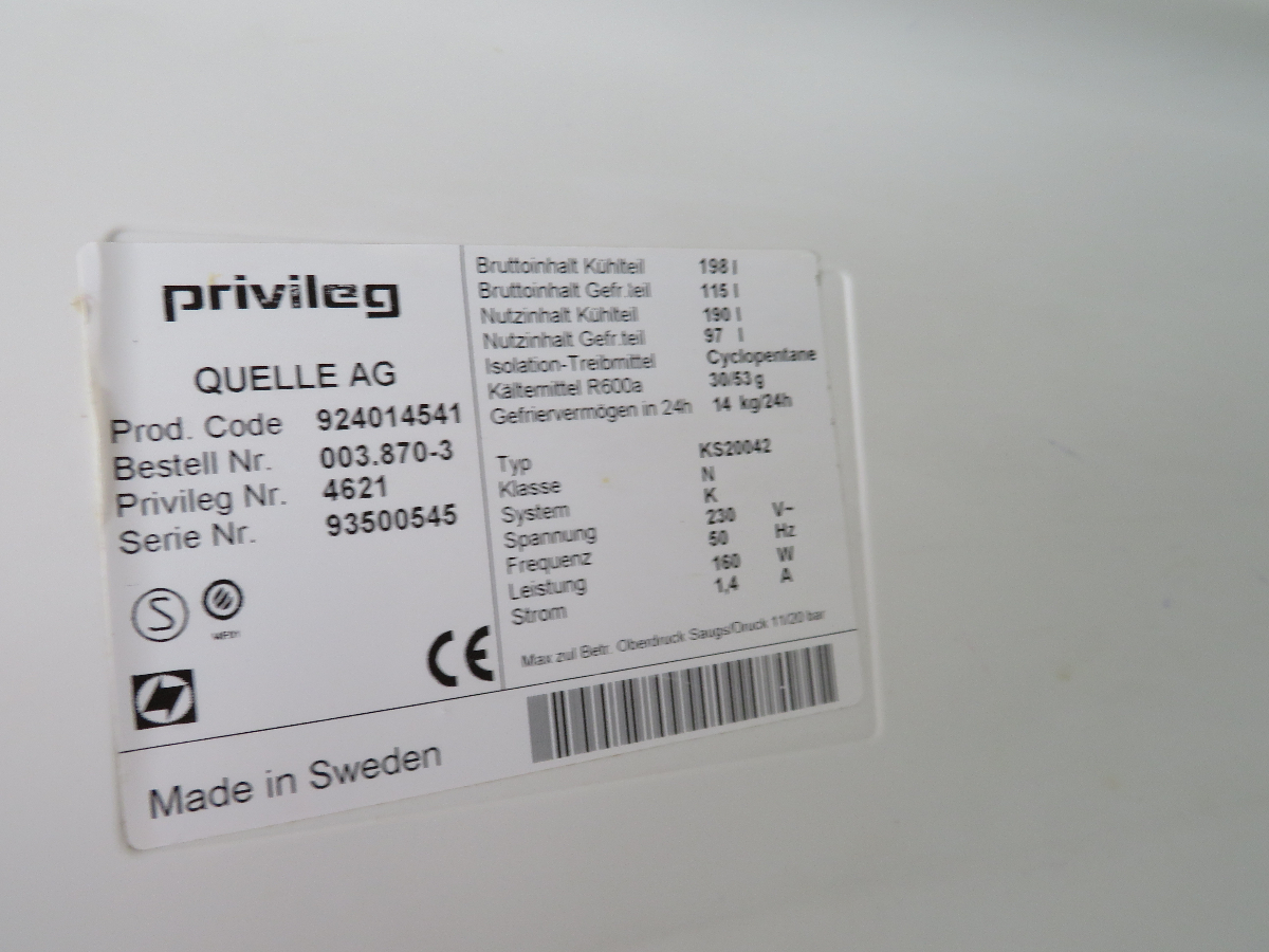 1 Kühl- und Gefrierkombination, Fabr. Privileg, Typ KS20042, Bruttoinhalt Kühlteil 198 l, Gefrierteil 115 l, Serien-Nr. 93500545