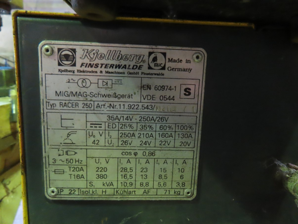 1 Schweißgerät, Fabr. Kjellberg, Typ Racer 250, mit Spulen-/Stabausgleich, 1 Schlauchpaket und 1 Handstück