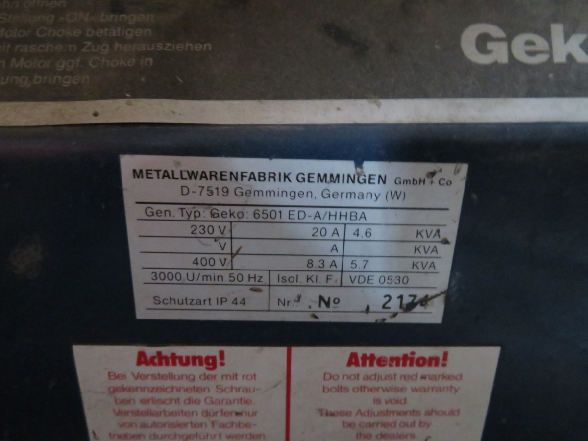 1 Notstromaggregat, Fabr. Metallwarenfabrik Gemmingen, Typ Geko 6501ED-A, ca. Gewicht 92,5 kg, Nr. 2174