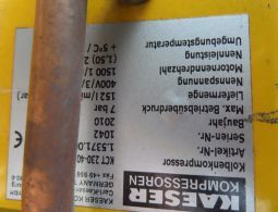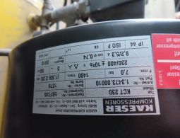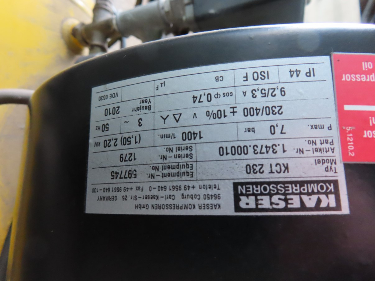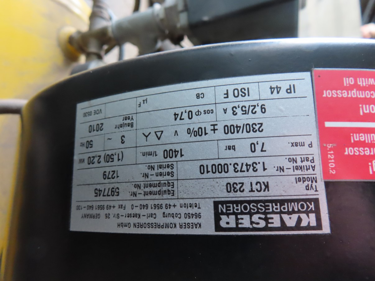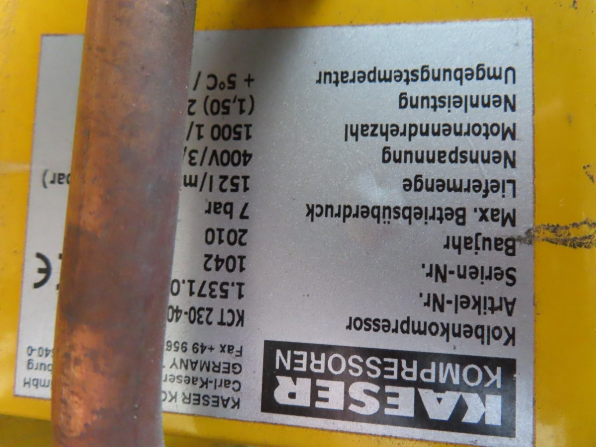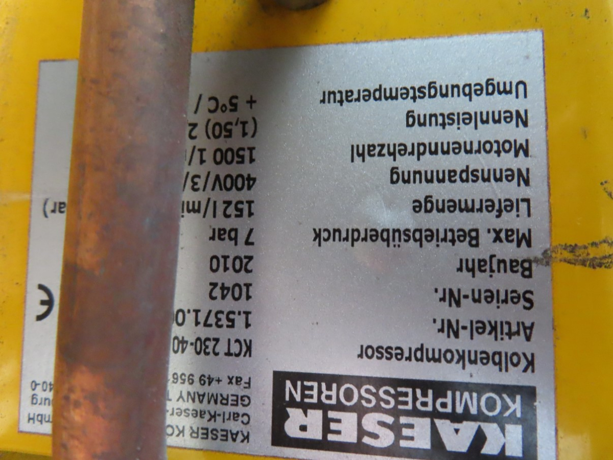 1 Industriekolbenkompressor, Fabr. Kaeser, Typ KCT 230-40, ölfrei, Serien-Nr. 1042, Baujahr 2010, max. 7 bar, 152 l/min, mit 1 Aggregat, Typ KCT 230, Serien-Nr. 1279, 7 bar, Baujahr 2010