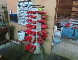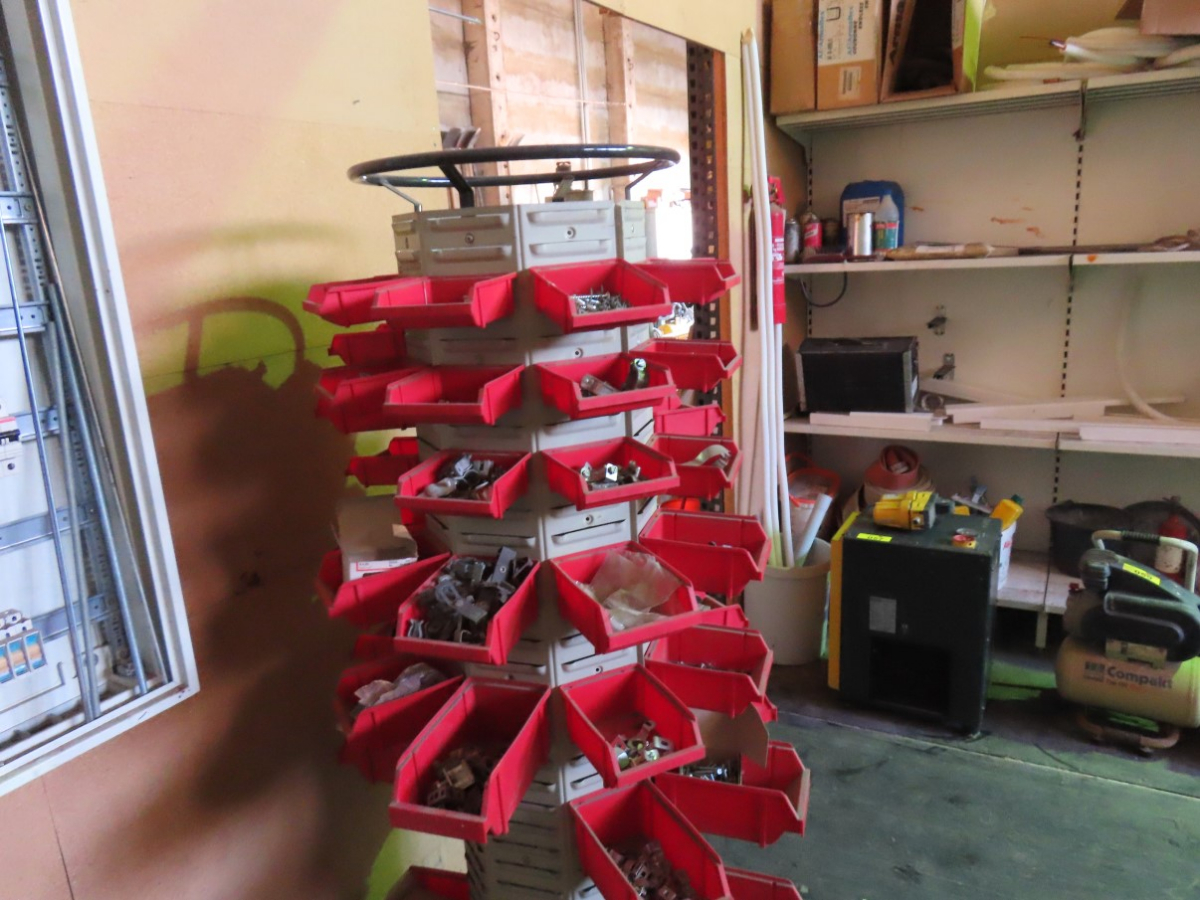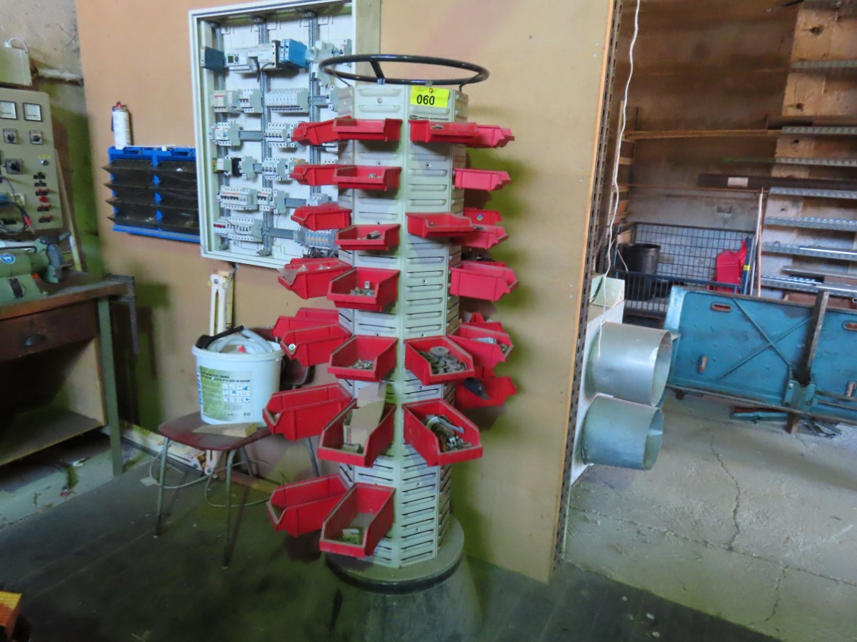 1 Kleinteilerondell mit Lagersichtkästen, Kunststoff rot, und 1 Restposten Verbindungsmaterial (Unterlegscheiben, Schellen, Schrauben, Listerklemmen, etc.)