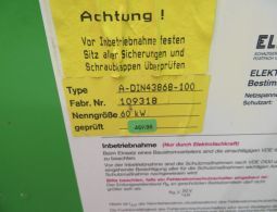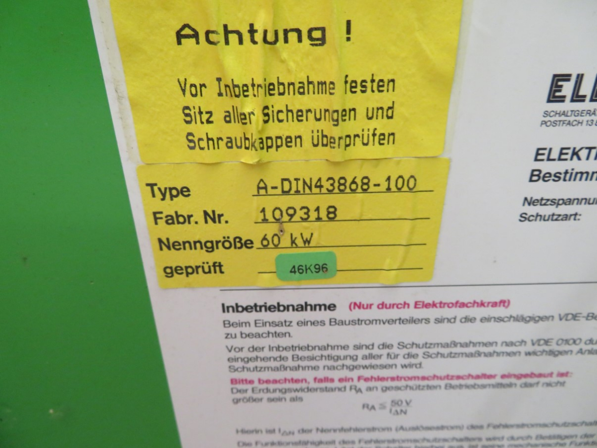 1 Baustromverteiler, Fabr. Elektra Tailfingen, Typ A-DIN43868-100, Fabrik-Nr. 109318, 60 kW, 3 x 400/230 V, Schutzart VDE 0612