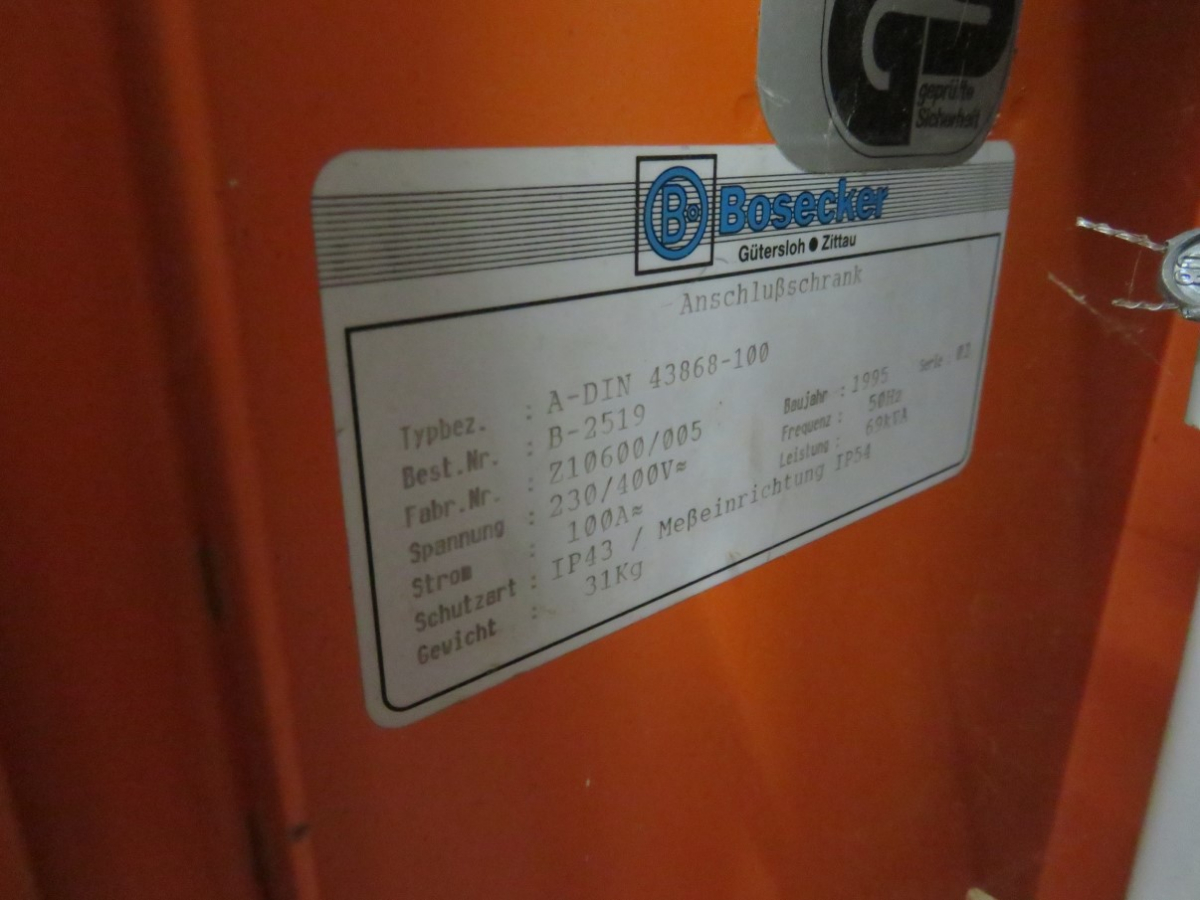 1 Baustromverteiler, Fabr. Bosecker, Typ A-DIN 43868-100, Fabr.-Nr. Z10600 / 005, 69 kVA, Schutzart IP43, Baujahr 1995, Gesamtgewicht 31 kg