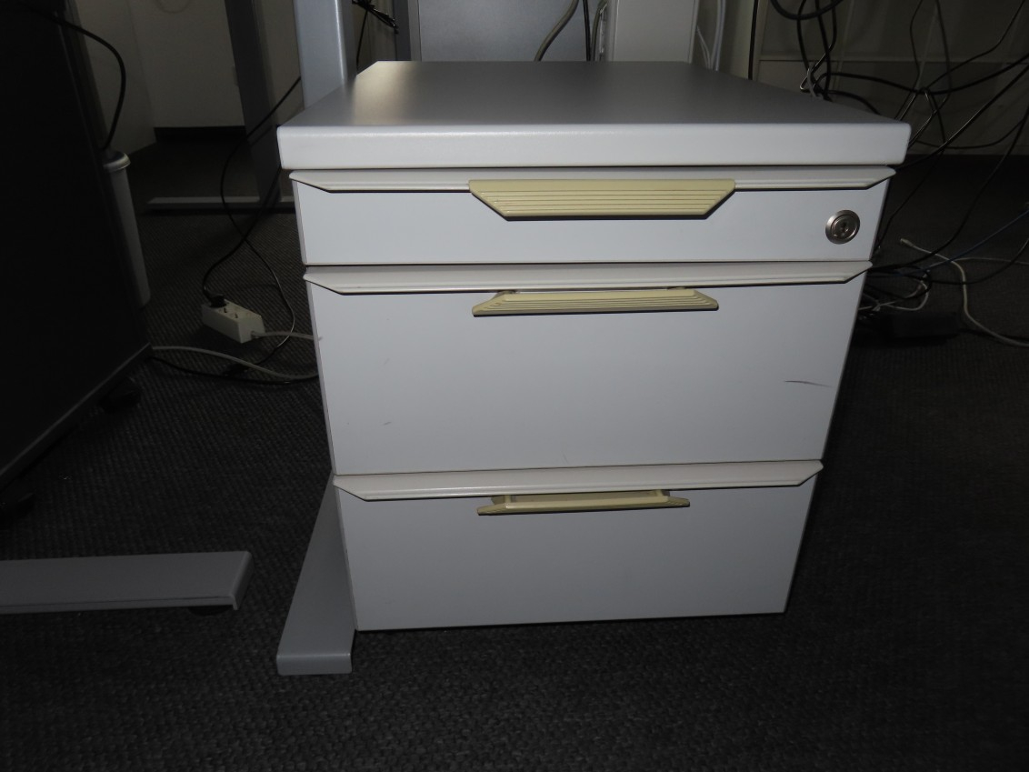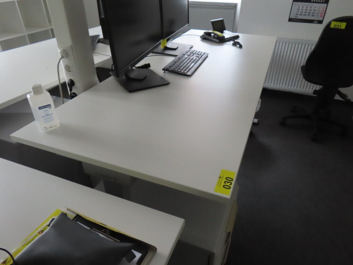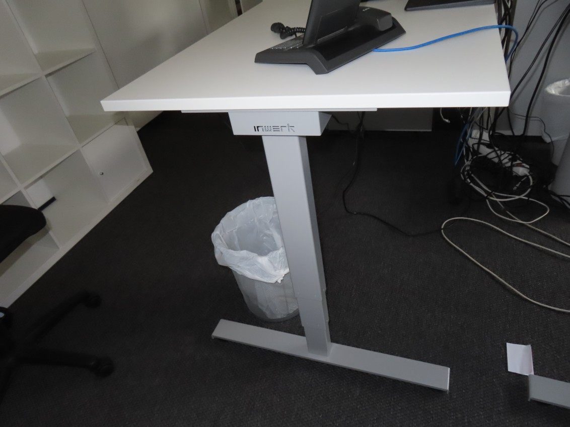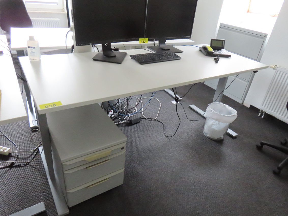 1 Schreibtisch, Fabr. Inwerk, ca. 0,80 x 2 m, Kunststoff grau, elektrisch höhenverstellbar, mit Bürocontainer, 3 Auszüge