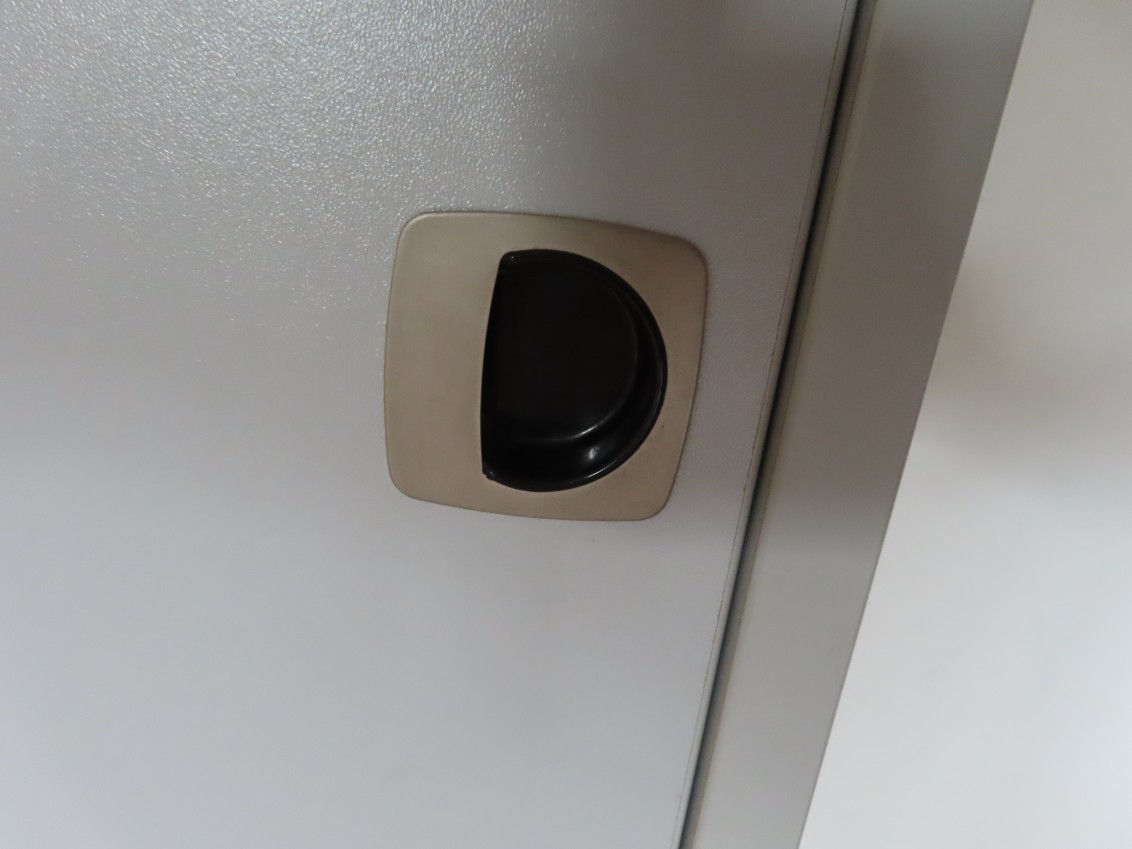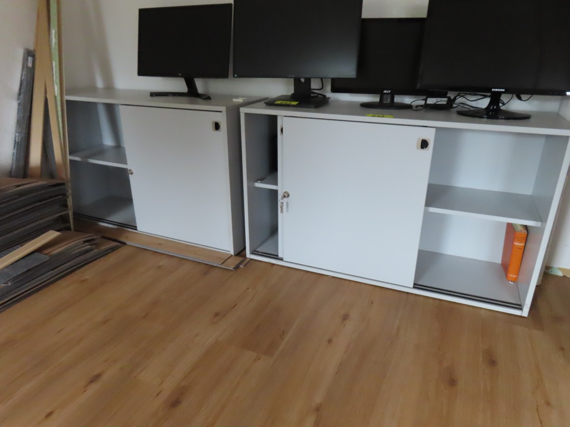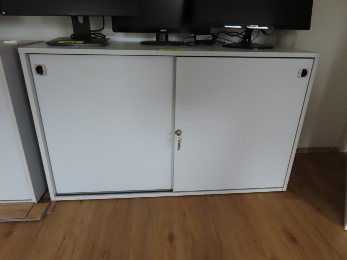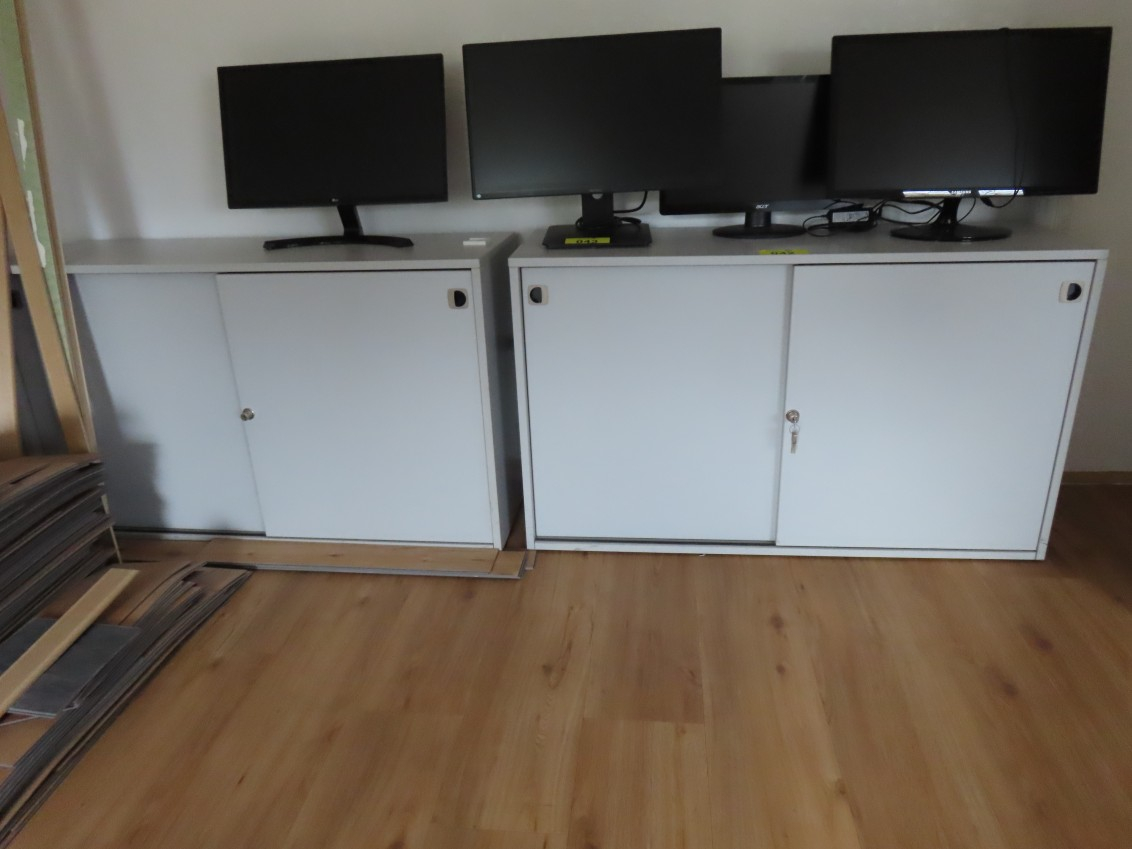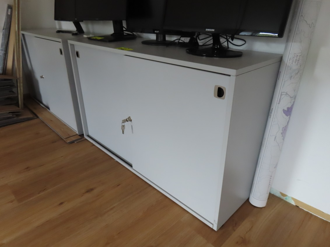 2 Sideboardschränke, Kunststoff grau, jeweils ca. 0,80 m x 1 m, mit Schiebetüren, Kanten leicht verschlissen