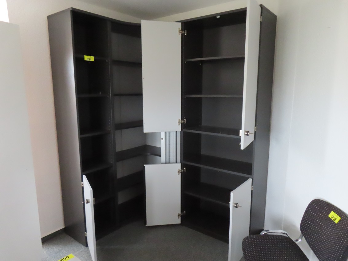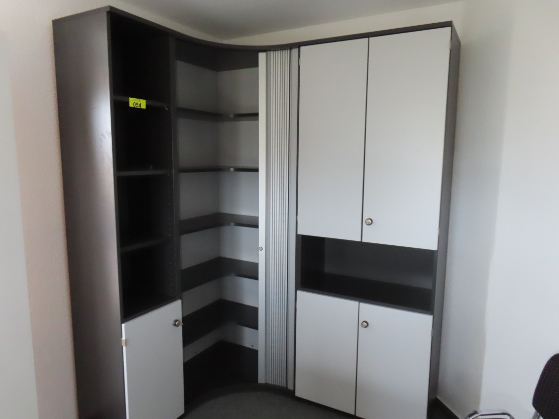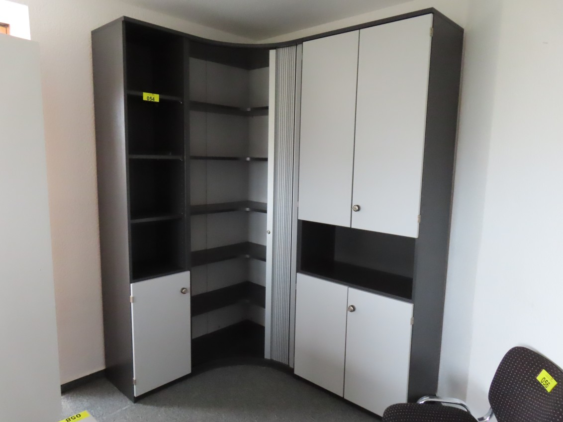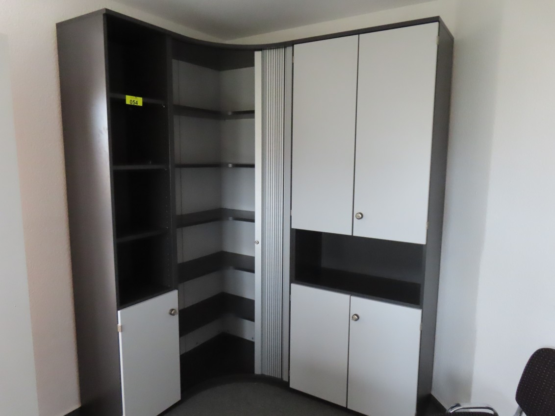 1 Akten-Eckschrank, bestehend aus: 1 Regalschrank, 2 m x 1 m, 4-türig, 1 Eckschrank, 2 m x 1 m, viertelrund, mit Rollotür, 1 Akten-/Regalschrank, ca. 2 m x 0,40 m, 1-türig, anthrazit/grau