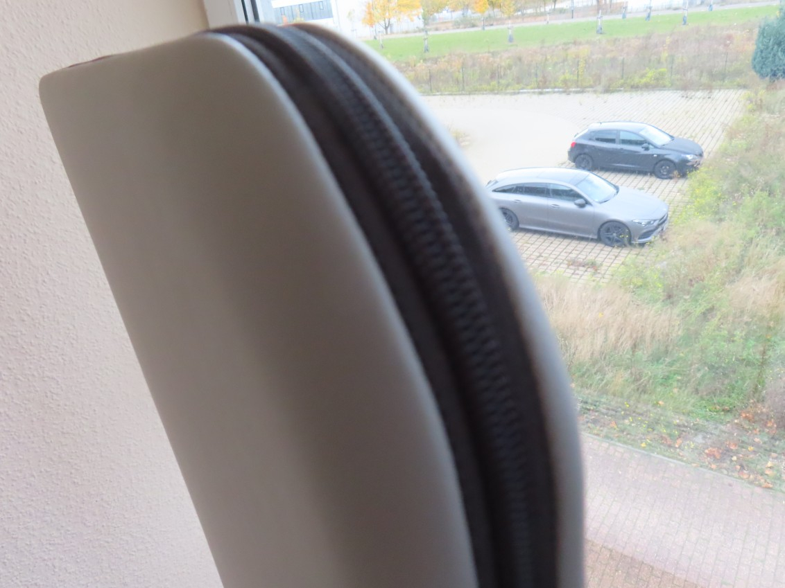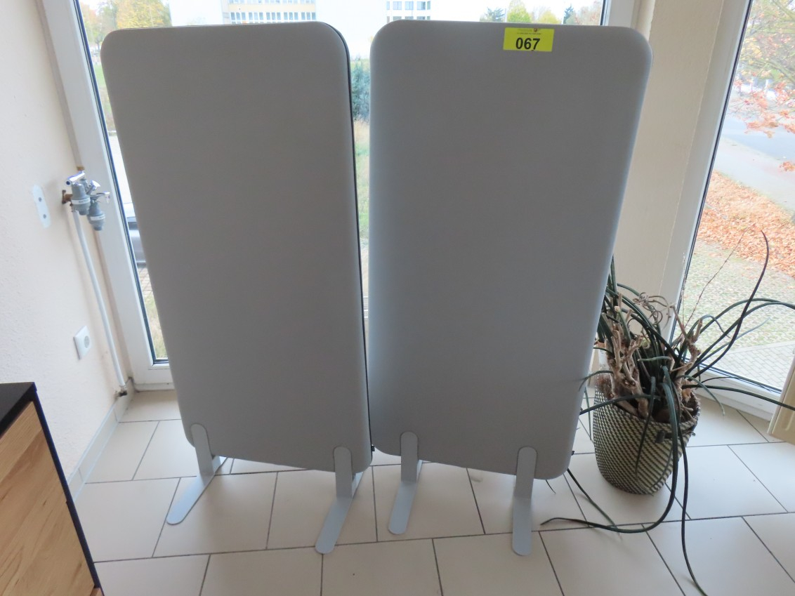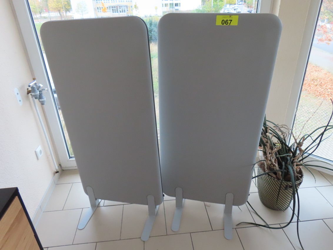 2 Akustikpaneele, Fabr. .mdd, jeweils ca. 1,20 m x 0,80 m, Leder hellgrau, mit Dekor-Reißverschluss und Ständer
