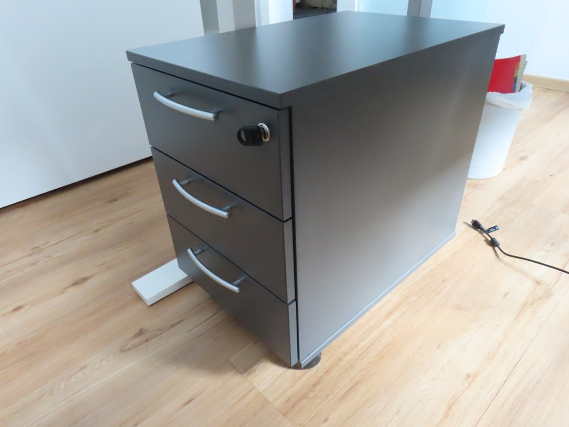 1 Eckschreibtisch, elektrisch höhenverstellbar, Kunststoff weiß, ca. 1,80 m x 2,40 m, mit 1 Rollcontainer, anthrazit, 3 Auszüge