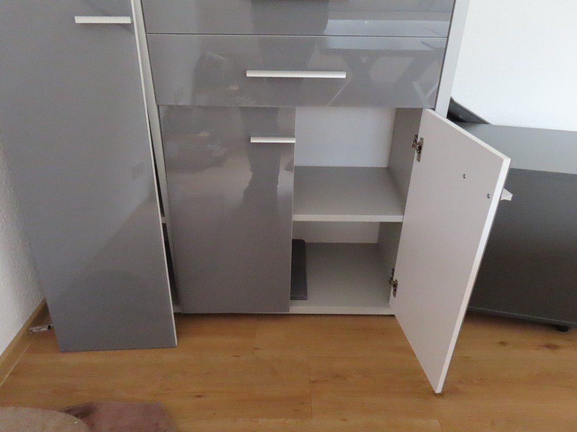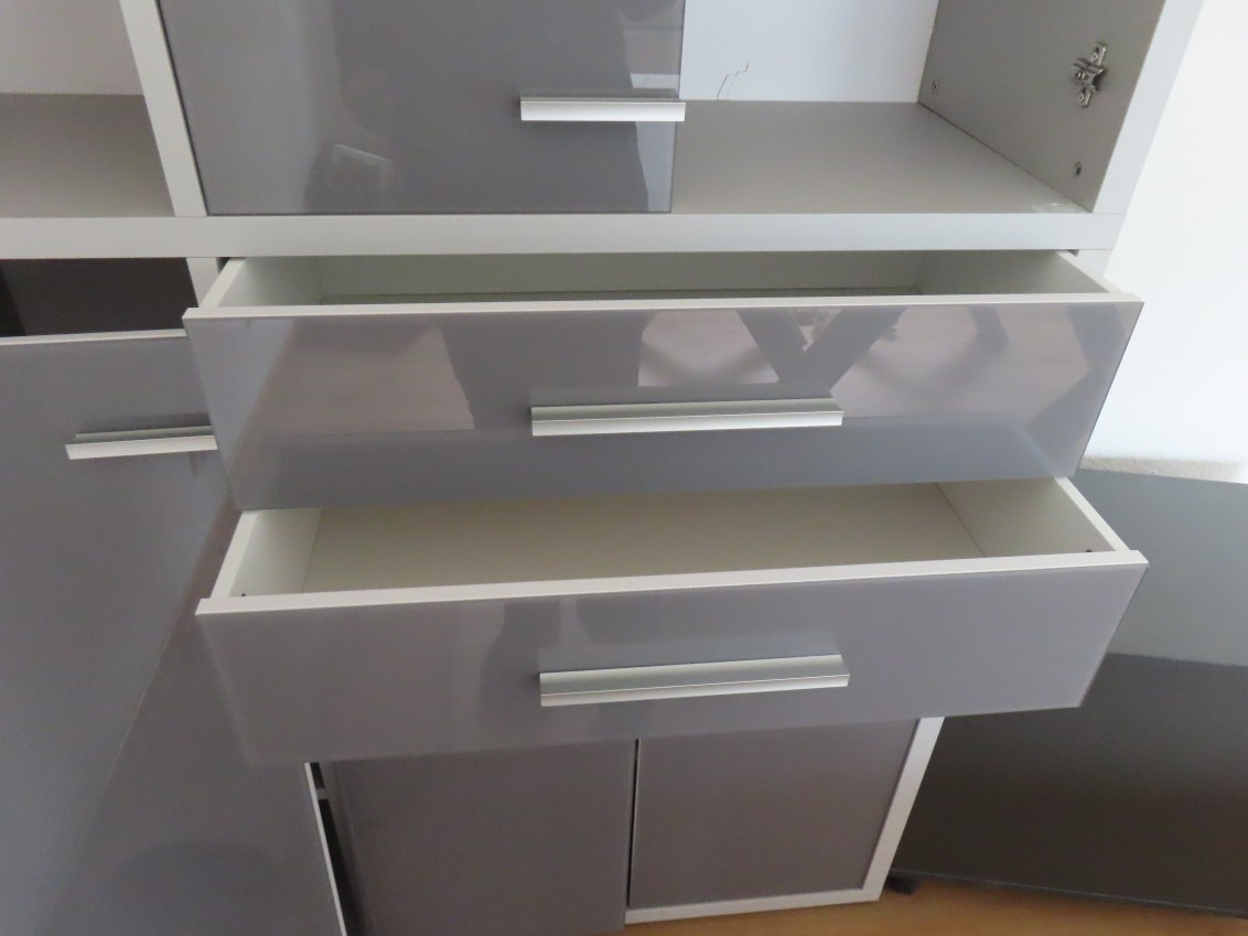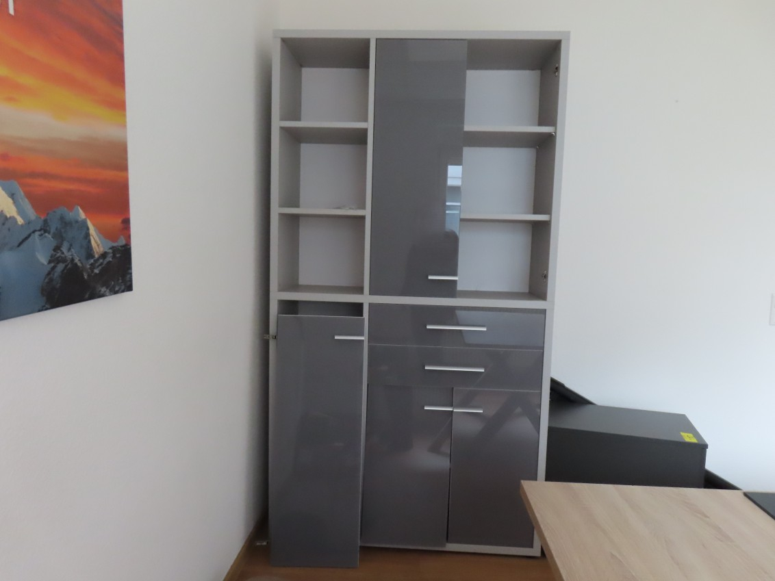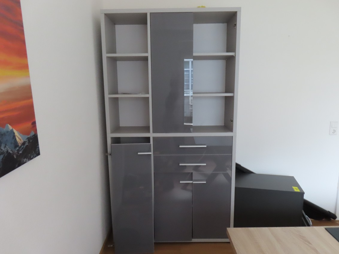 1 Aktenschrank, hellgrau, Front Glas Graphit lackiert, ca.: 2 m x 1,20 m, mit 6 Regalfächern, 4 Drehtüren und 2 Auszügen