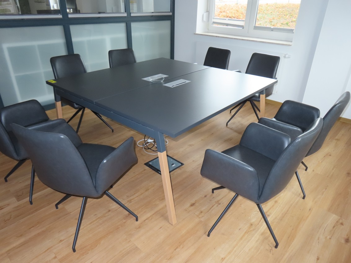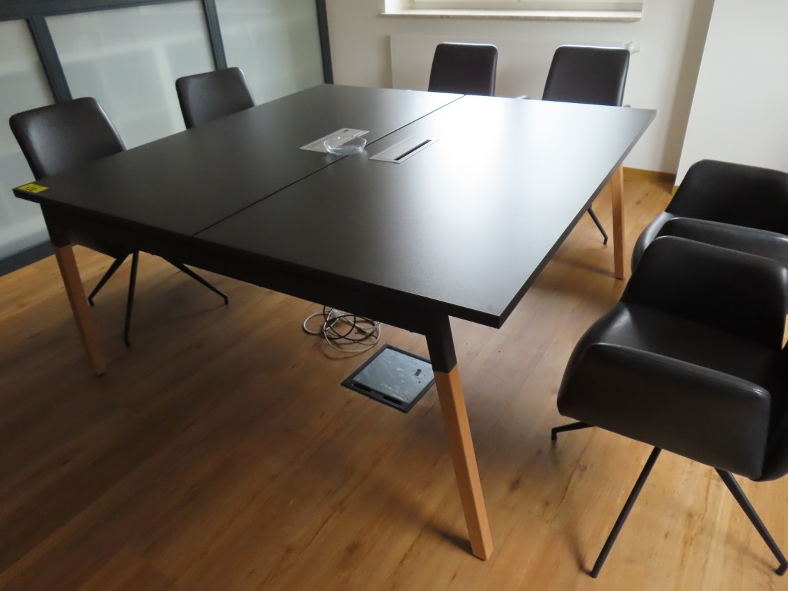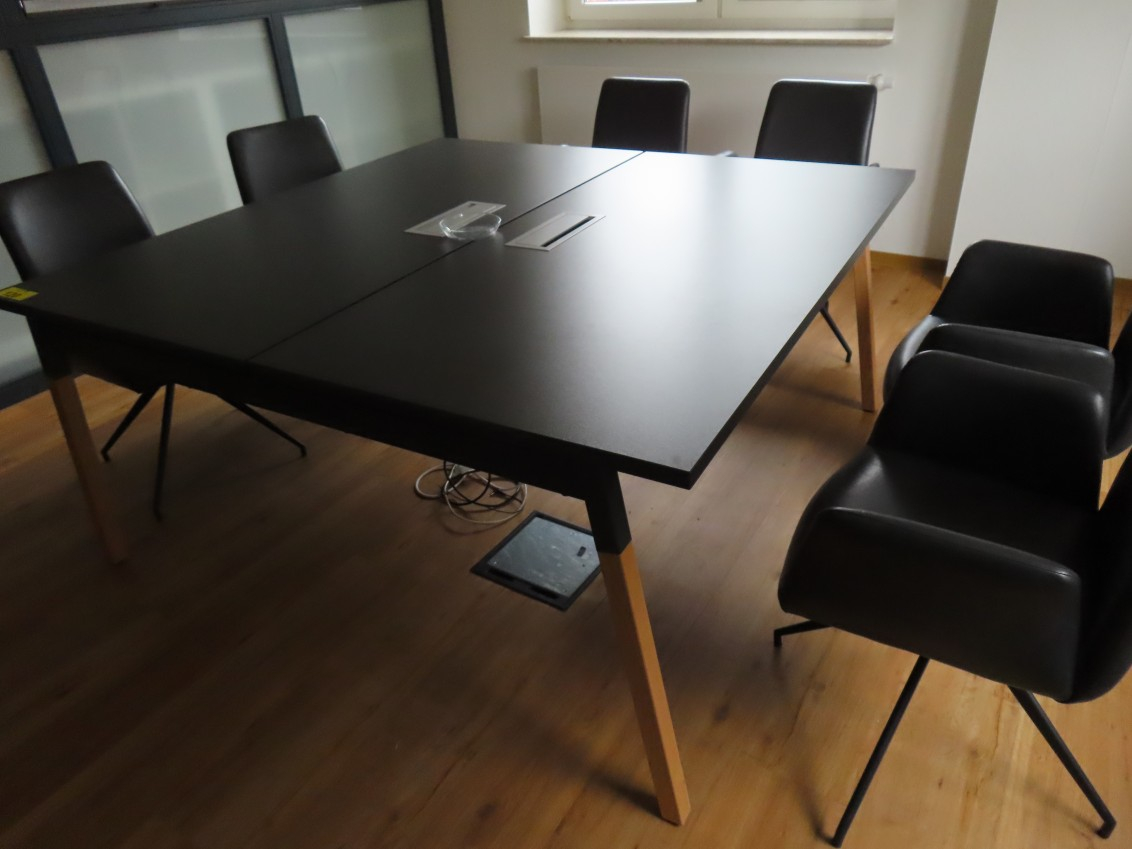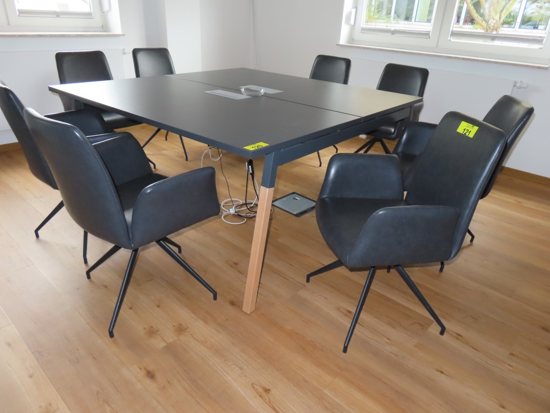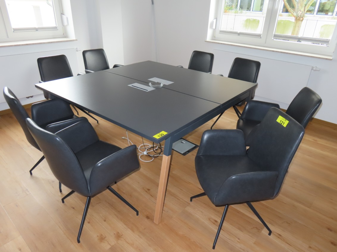 1 Konferenztisch/Gruppenarbeitstisch, Arbeitsplatte Melamin, anthrazit, mit Kabeldurchlass, Gestell Esche, ca. 2 m x 2 m, geteilte Tischplatte mit 8 Drehstühle mit Armlehnen, Fabr. Actona Company, braun (Pos. 121)