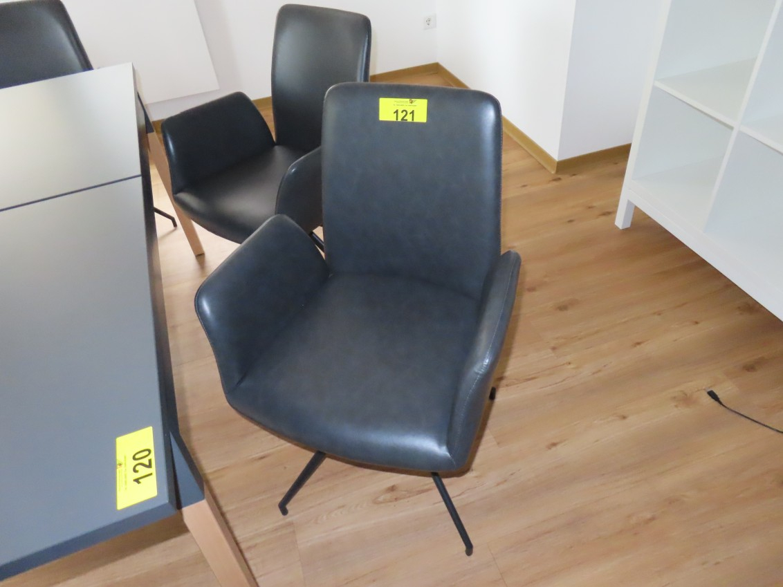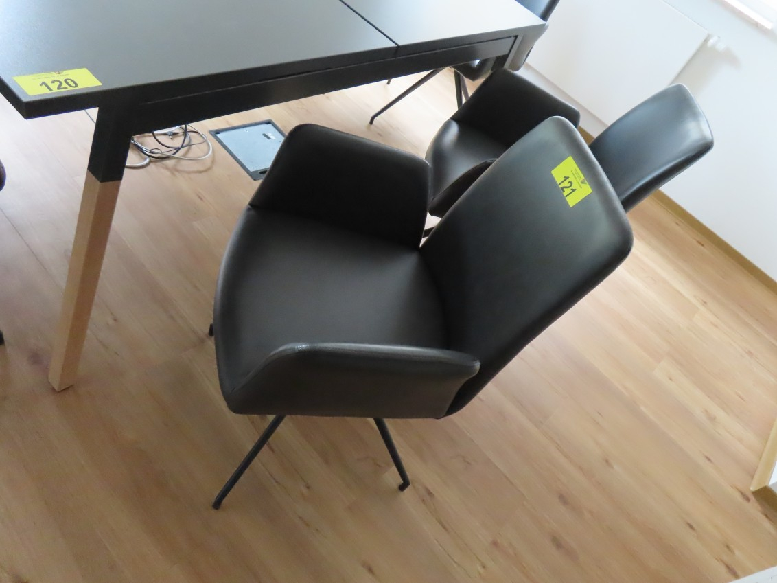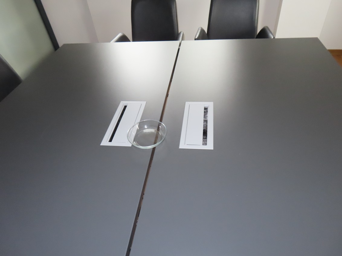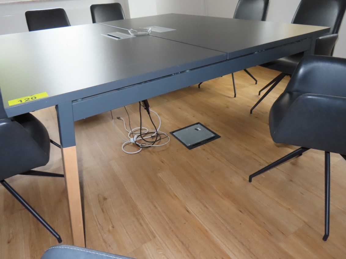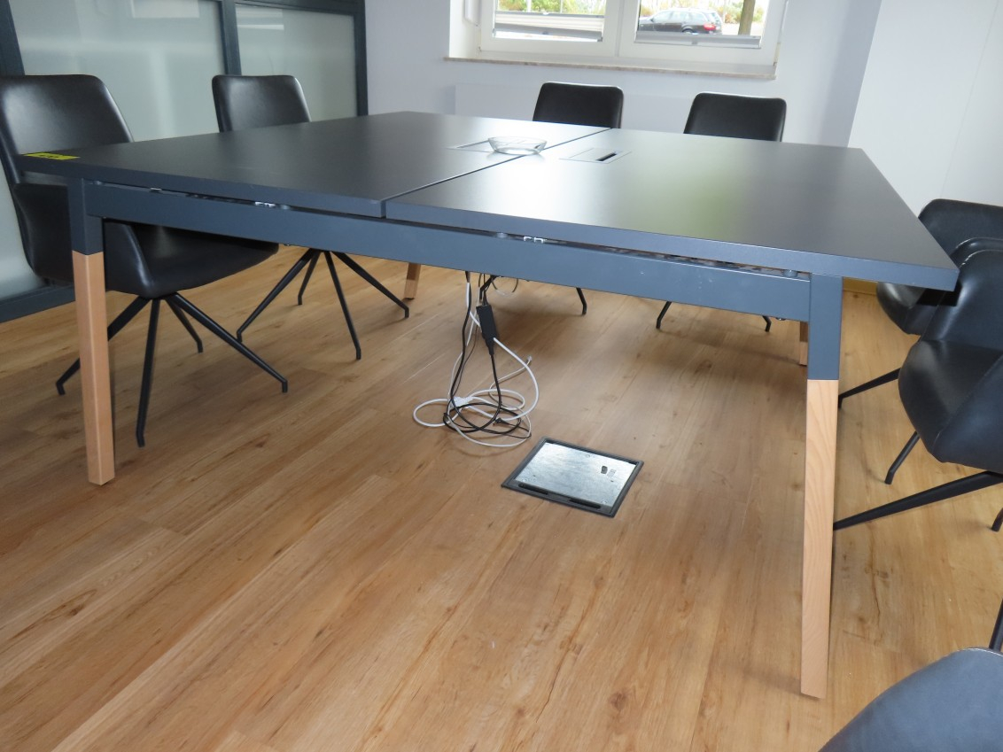 1 Konferenztisch/Gruppenarbeitstisch, Arbeitsplatte Melamin, anthrazit, mit Kabeldurchlass, Gestell Esche, ca. 2 m x 2 m, geteilte Tischplatte mit 8 Drehstühle mit Armlehnen, Fabr. Actona Company, braun (Pos. 121)