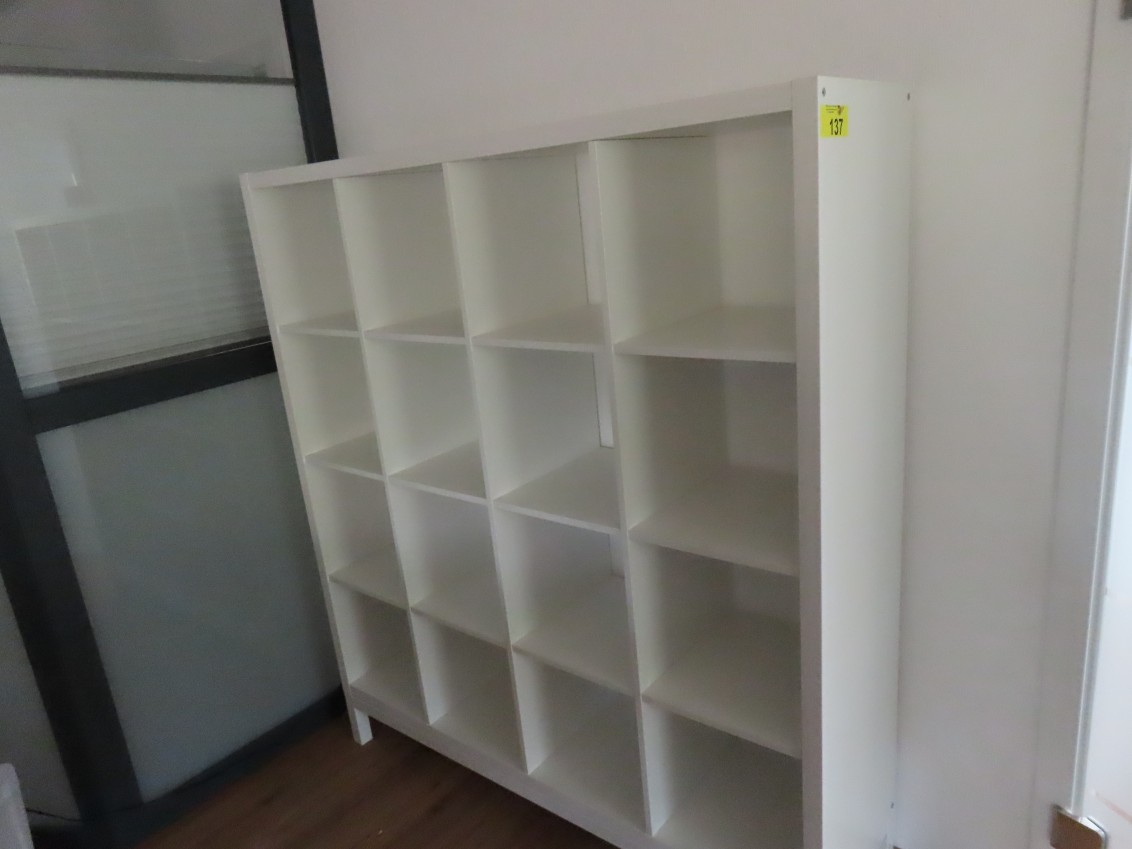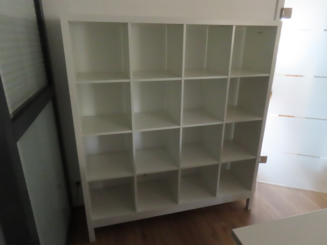 1 Regal, IKEA KALLAX, ca. 1,50 m x 1,50 m, weiß, mit Untergestell