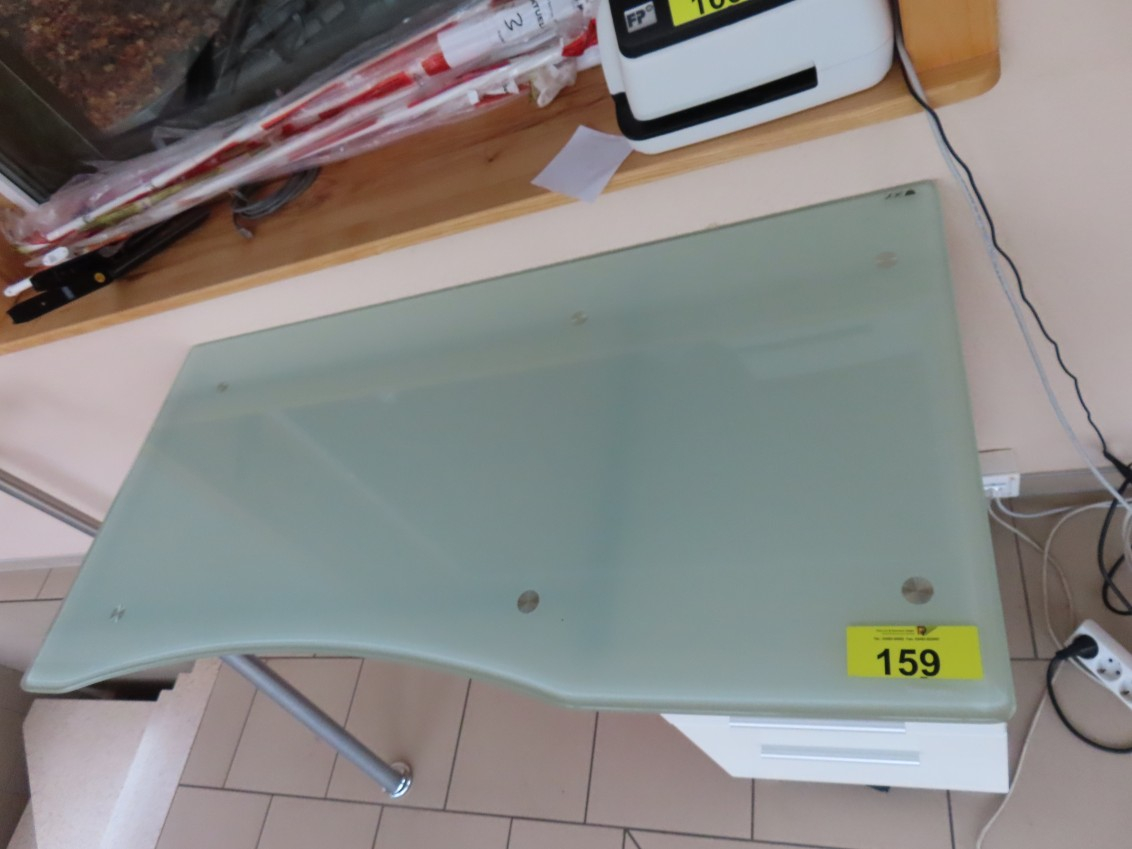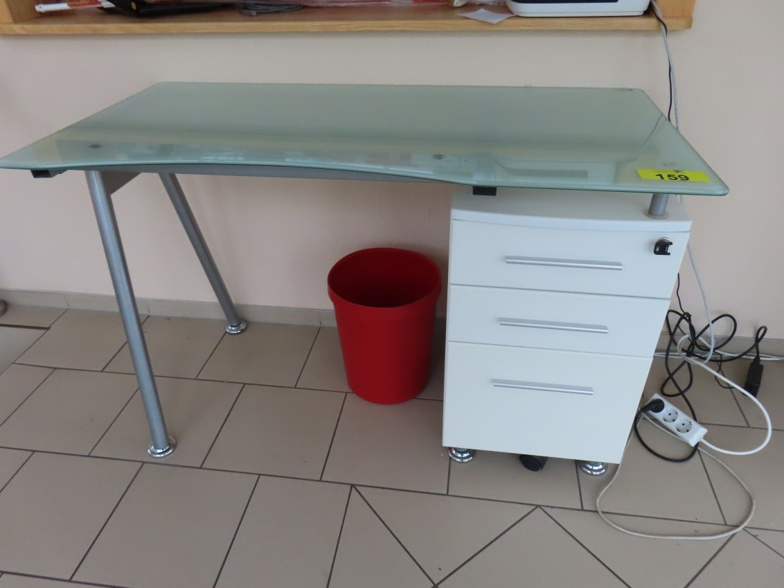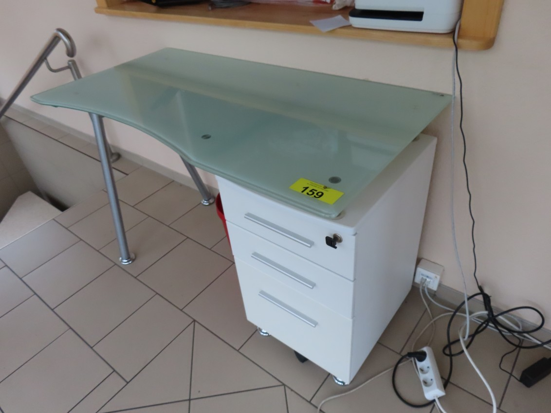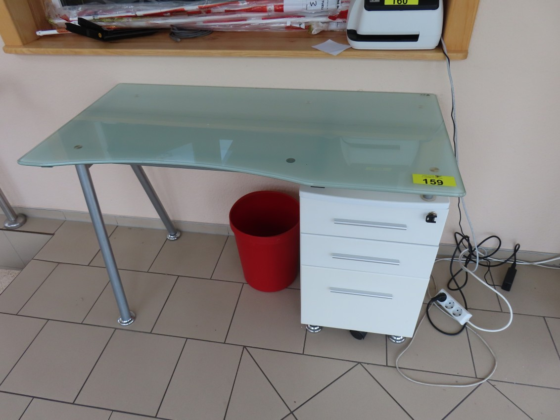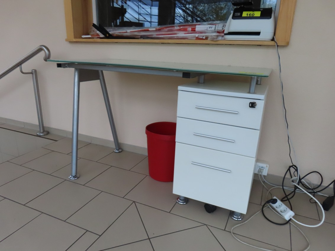 1 Tisch mit angebautem Bürocontainer rechts, 3 Auszüge, weiß, Glasoberfläche, ca. 0,60 m x 1,20 m