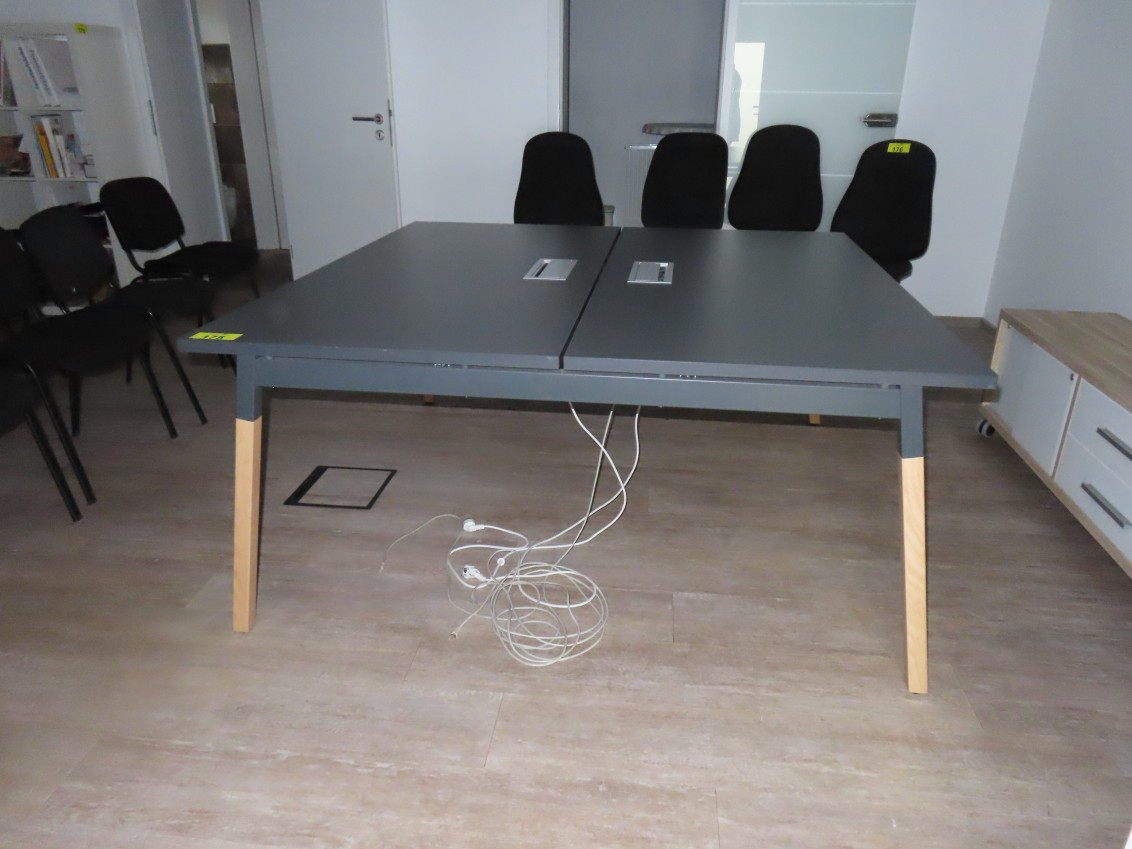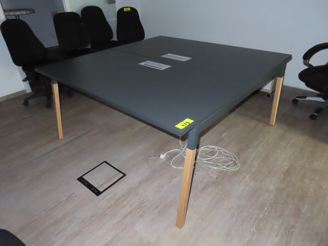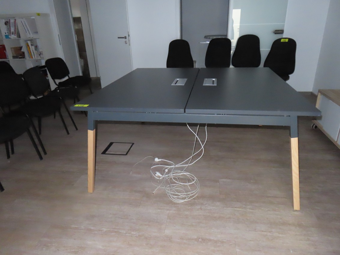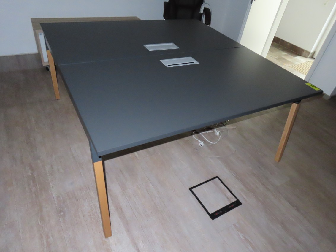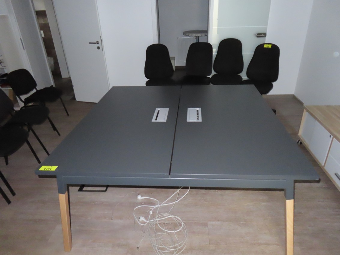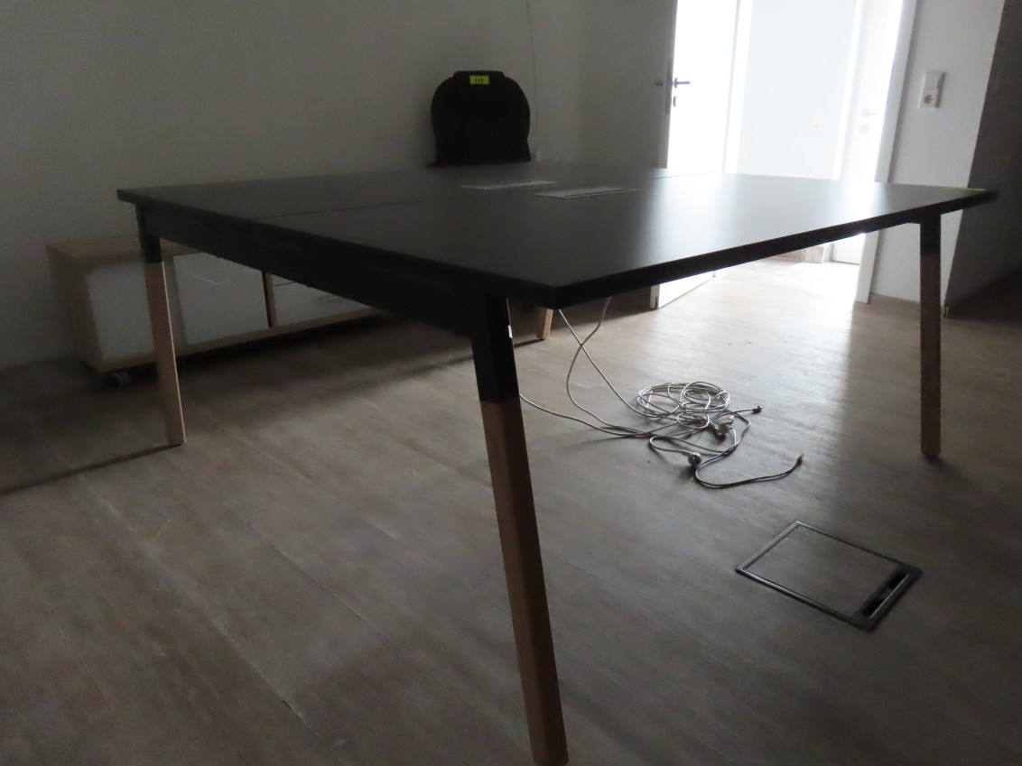 1 Konferenztisch/Gruppenarbeitstisch, Arbeitsplatte Melamin, anthrazit, mit Kabeldurchlass, Gestell Esche, ca. 1,60 m x 1,60 m, geteilte Tischplatte