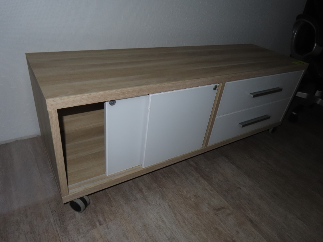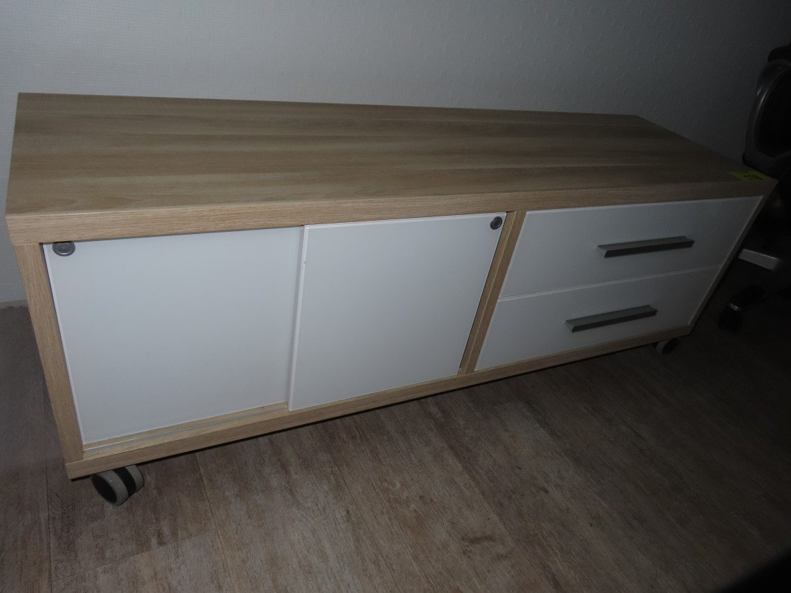 1 Garderoben-Sideboard, ca. 0,40 m x 1,60 m, mit 2 Auszügen und 2 Schiebetüren, hochglanz weiß/Eiche, rollbar