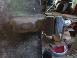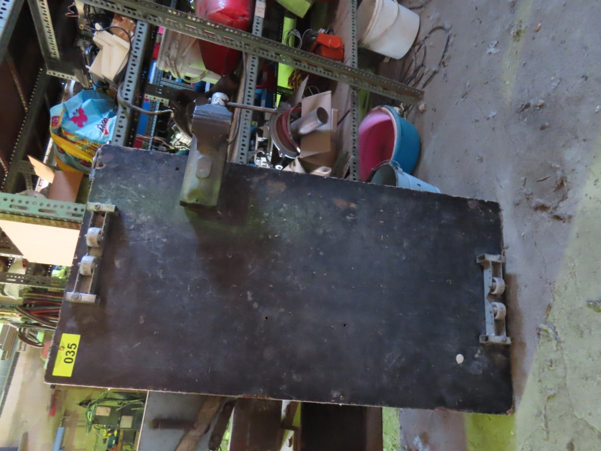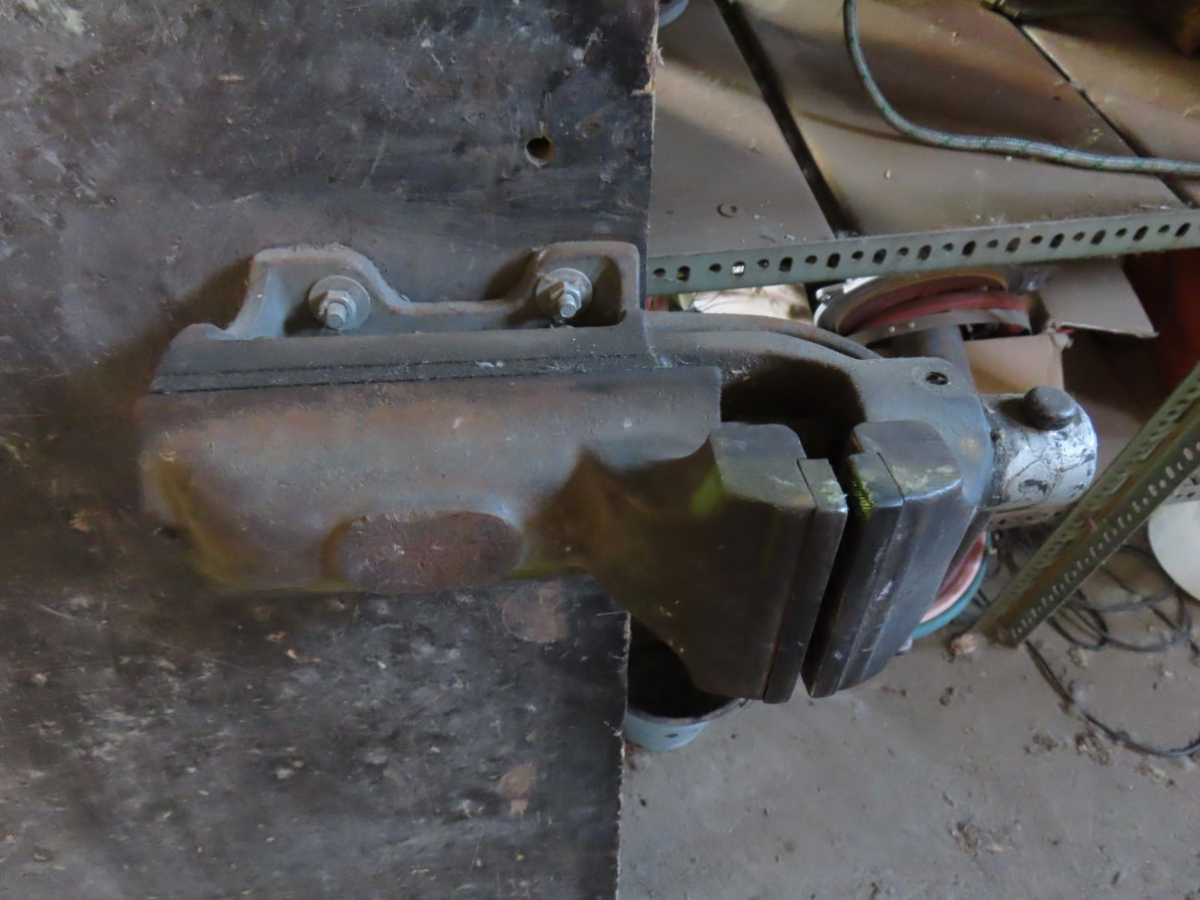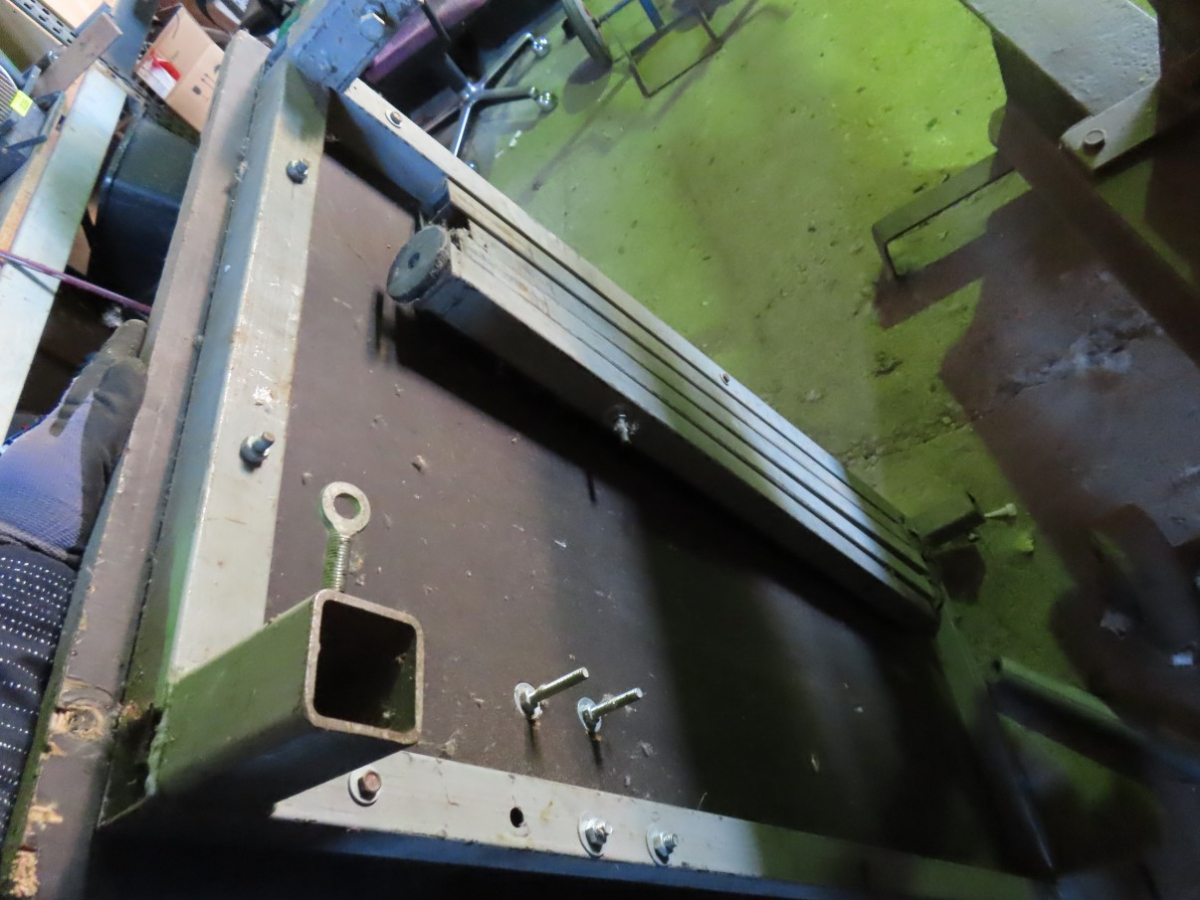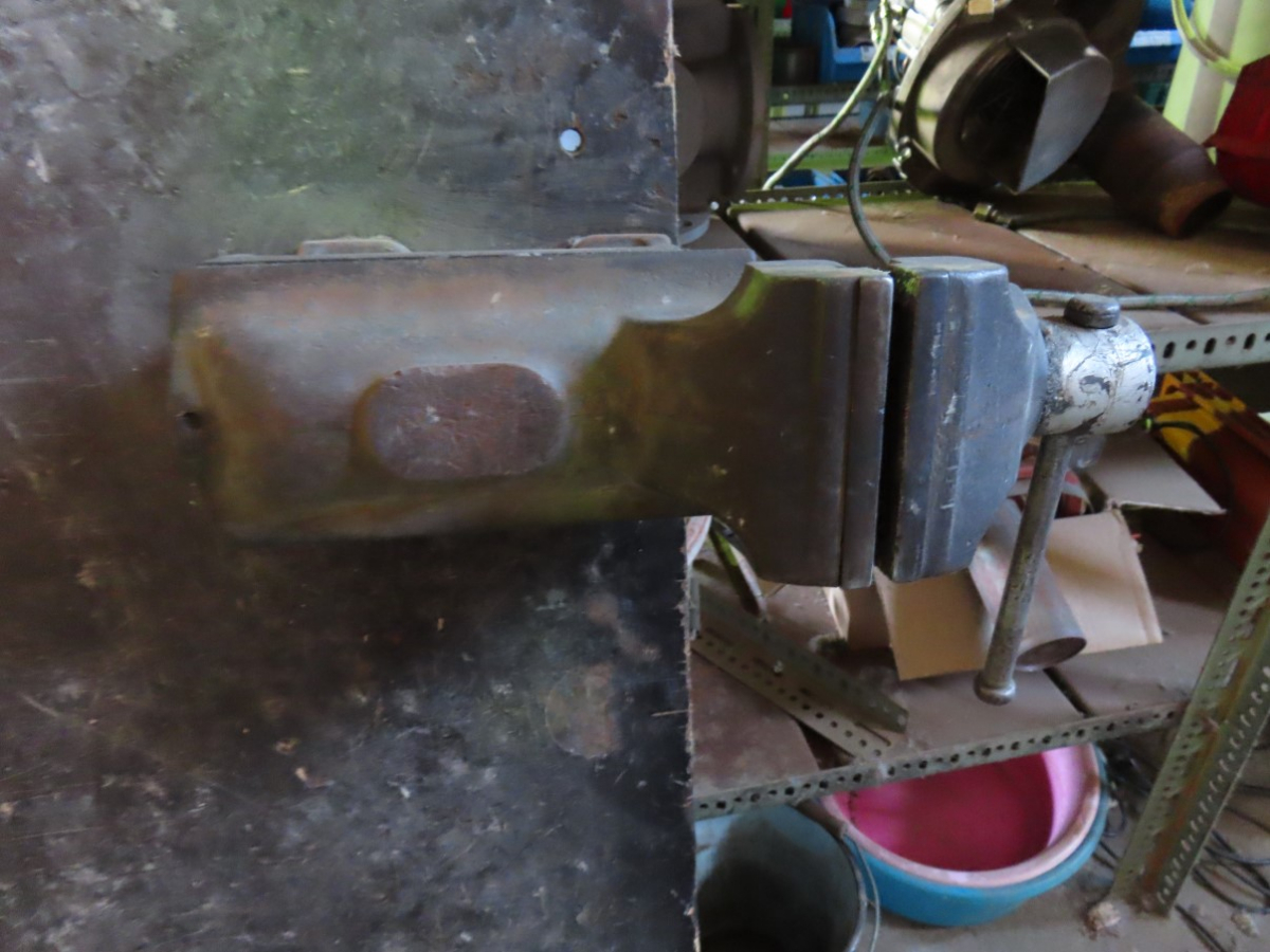 1 mobile Werkbank mit klappbaren Untergestell und 1 aufmontiertem Schraubstock, Tischplatte stark gebraucht