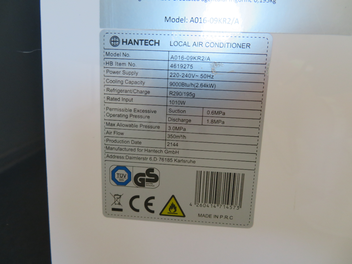 mobile Klimagerät, Fabr. Hantech, Typ A016-09KR2/A, Serien-Nr. 4619275, 240 V, Kältemittel R290, geeignet für Raumgröße bis 26 m², ohne Abluftschlauch und Fernbedienung