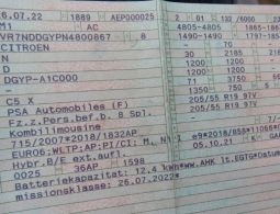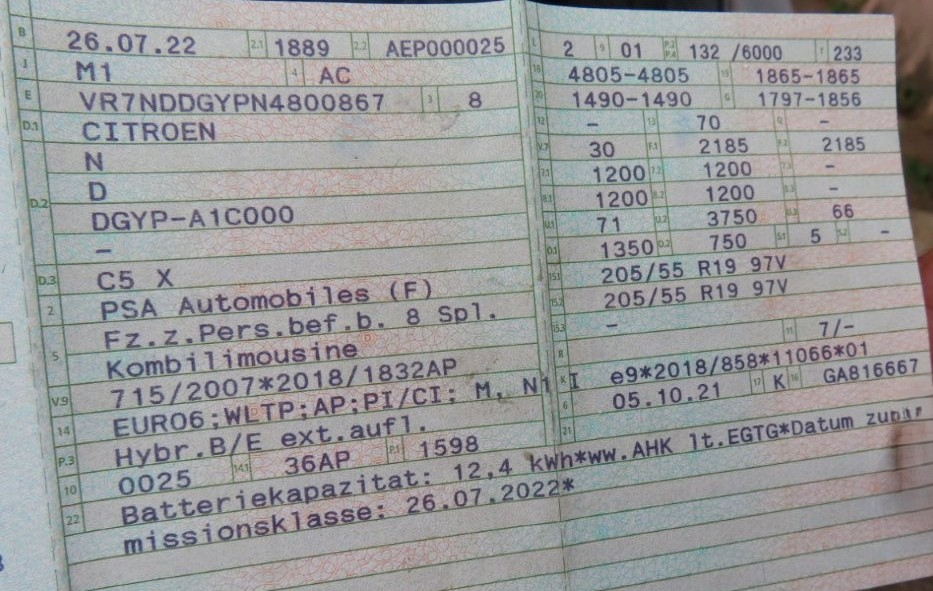1 PKW, Fabr. Citroën, Typ C5X, Ident-Nr. VR7NDDGYPN4800867, Erstzulassung 26.07.2022, 132 kW, Hybrid Benzin/Elektro, 12,4 kWh Batteriekapazität, 1598 cm³, Automatikgetriebe, Tacho-Stand ca. 77.264 km, TÜV bis 07/2025, Delle mit Lackkratzer Beifahrertür