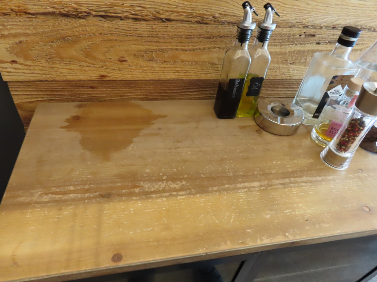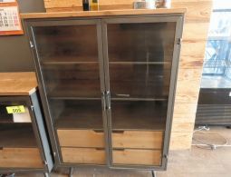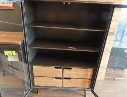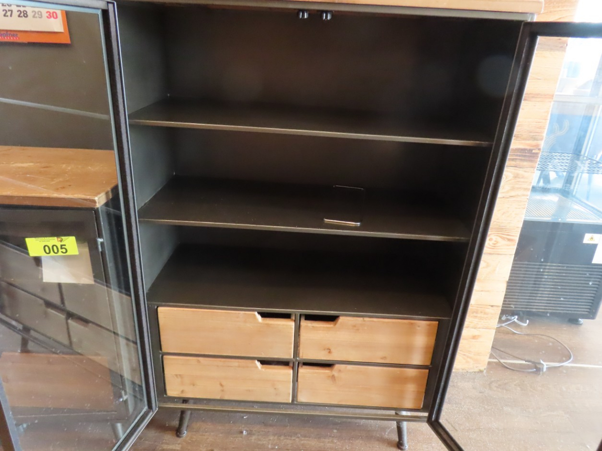 1 Highboardschrank/Industrial Look, mit Glasflügeltüren und 4 Auszügen, Holz, 1,18 m hoch x 0,80 m breit x 0,40 m tief, Metallgestell mit Holzablagefläche, Oberfläche leicht verschmutzt