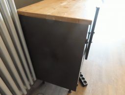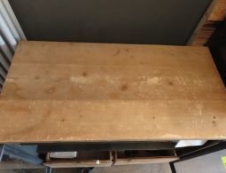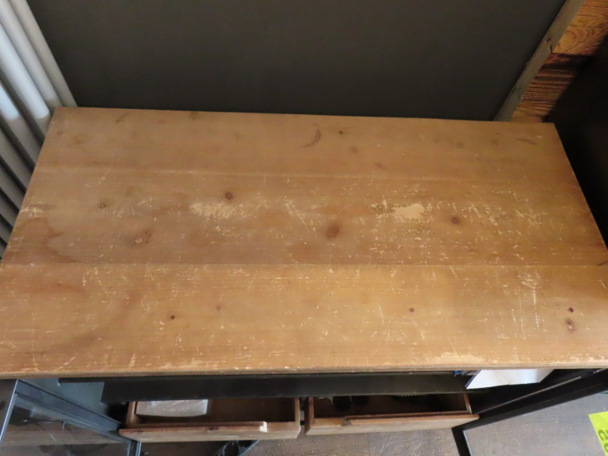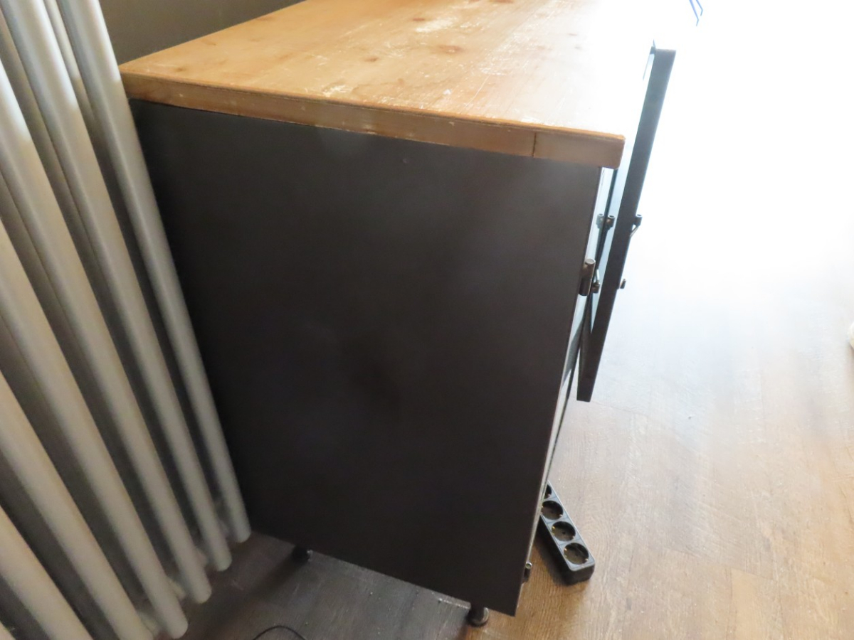 1 Sideboardschrank/Industrial Look mit Glasflügeltüren und 2 Auszügen, 0,80 m breit x 0,40 m tief x 0,80 m hoch, Metallgestell mit Holzablagefläche, Oberfläche leicht verschmutzt
