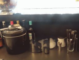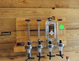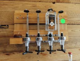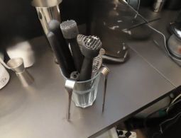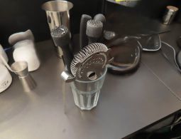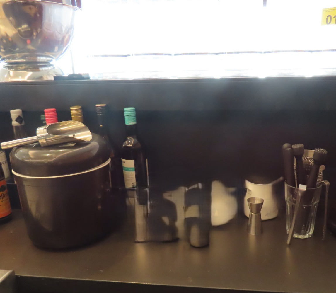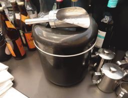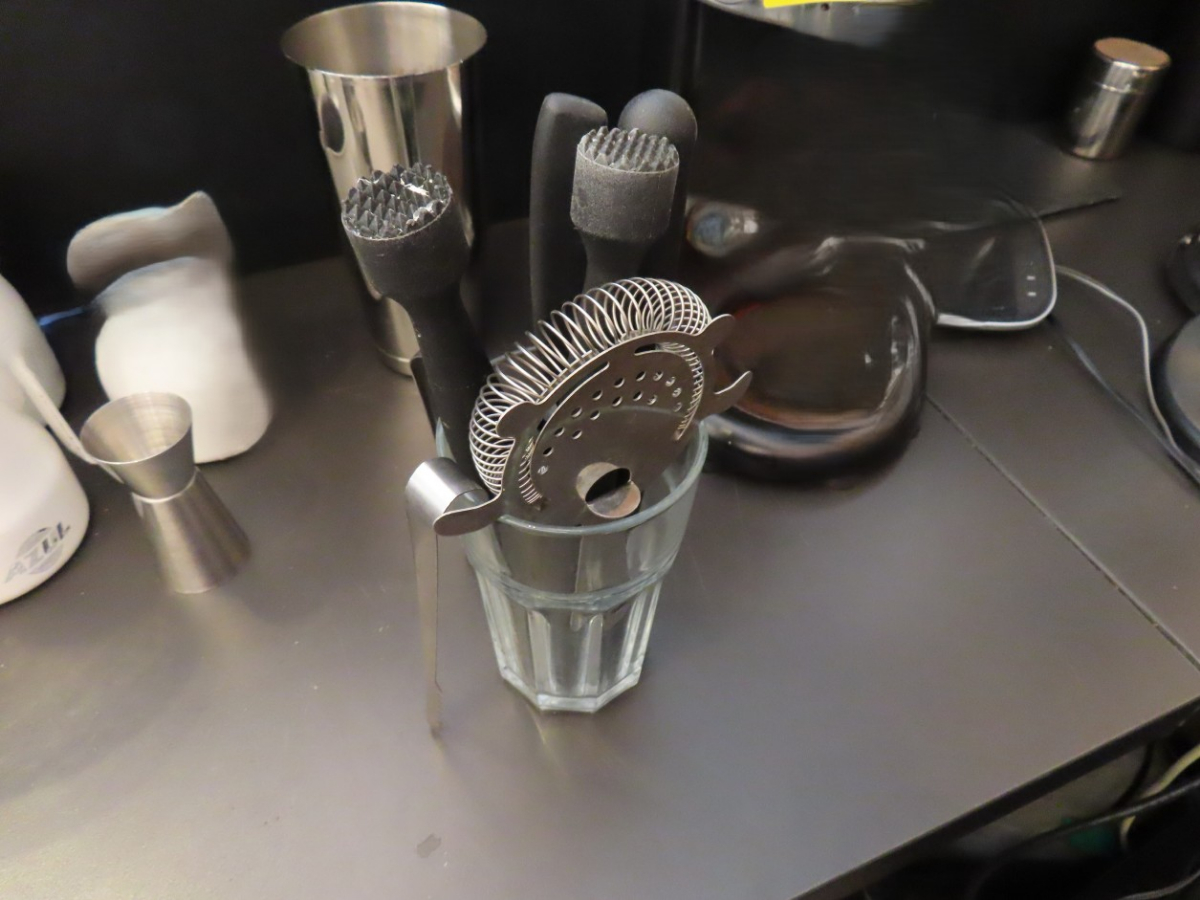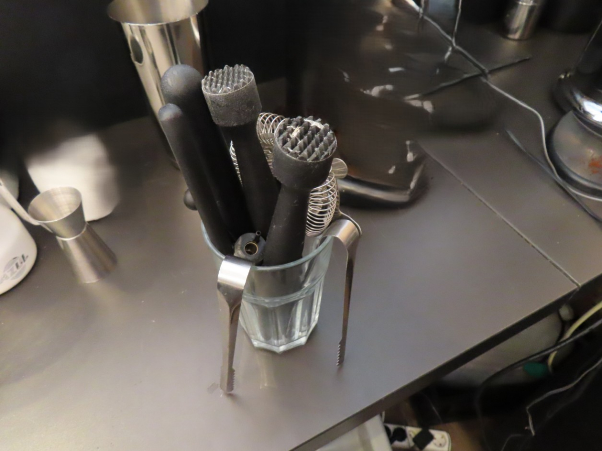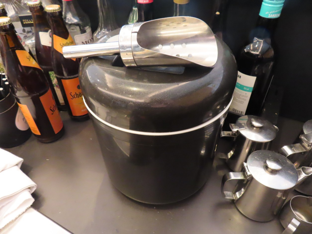 1 Bar-Equipment-Set, bestehend aus:1 Mixbecher ohne Deckel, 1 Eiseimer, Fabr. Fuchs, Eisschaufel, Eiszange, Barsieb/Strainer, Stößel, Barmaß, 4 Flaschenhalter mit Ausgießer, wandmontiert