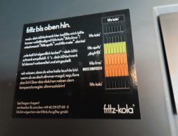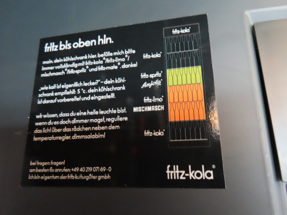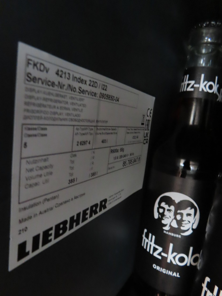 1 Getränkekühlschrank, Fabr. Liebherr, Typ 28297 4, Bruttoinhalt: 403 Liter, Nettoinhalt: 385 Liter, R600a, Aufschrift: Fritz-Kola