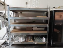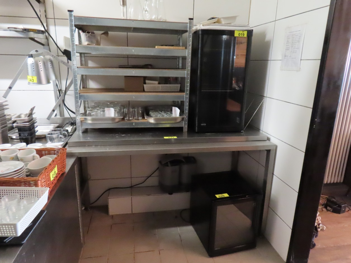 1 Edelstahl-Tisch mit separater Edelstahl-Platte, 1,60 m breit x 0,74 m tief, und Steckregal, ca. 0,80 m hoch x 1 m breit, (ohne Inhalt) Eigenbau, Tischgestell hinten gekürzt