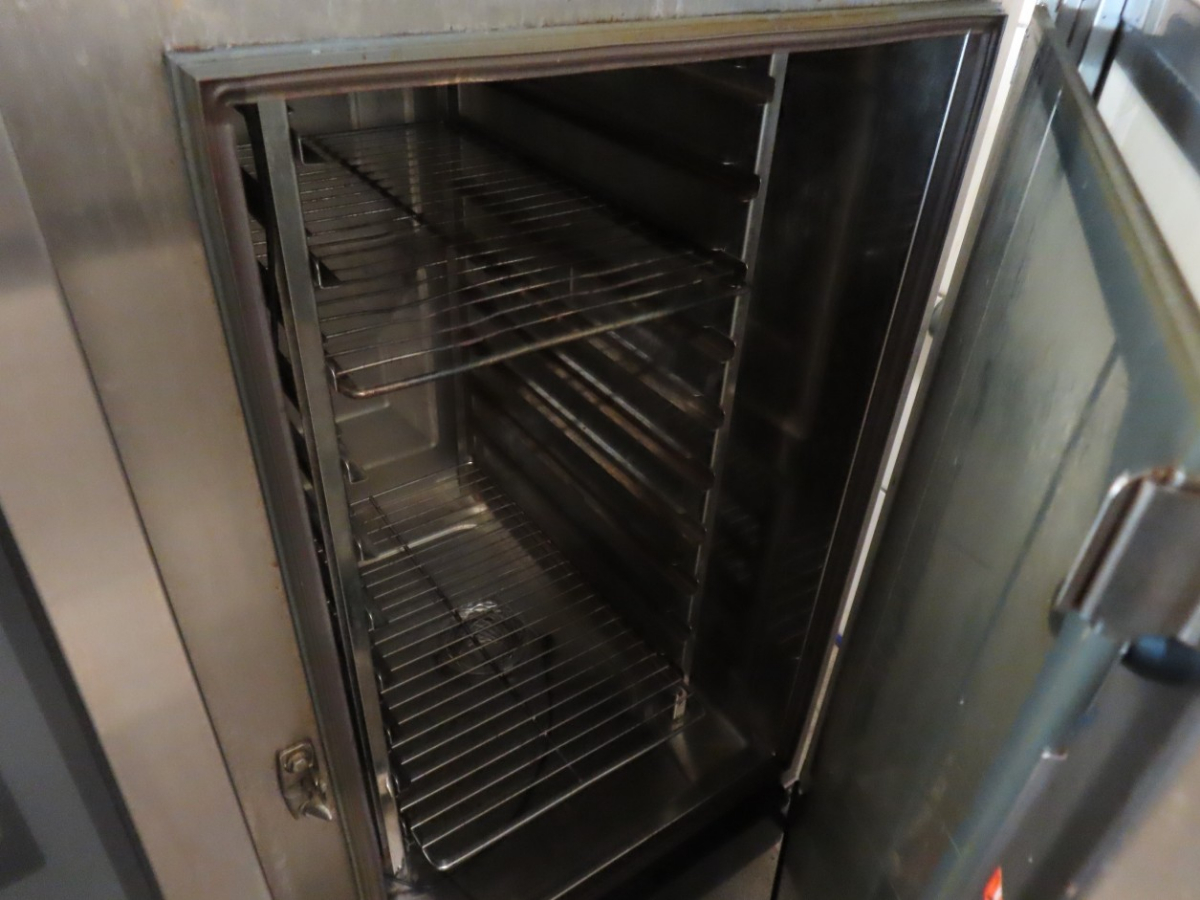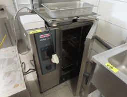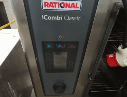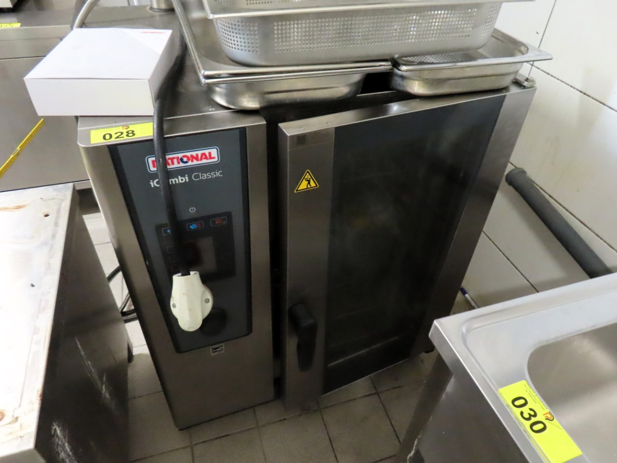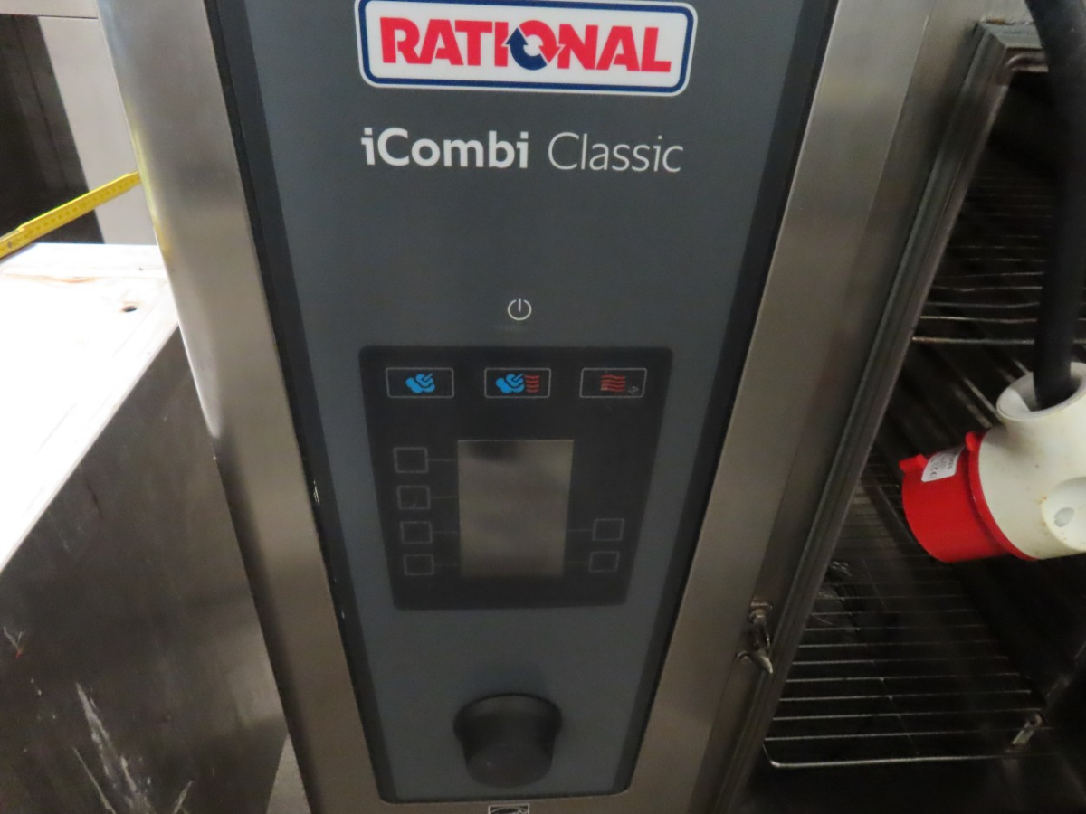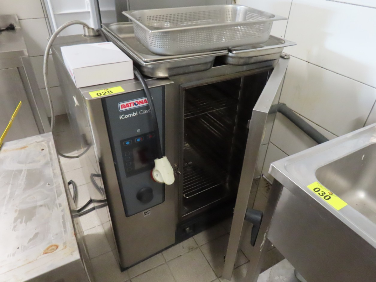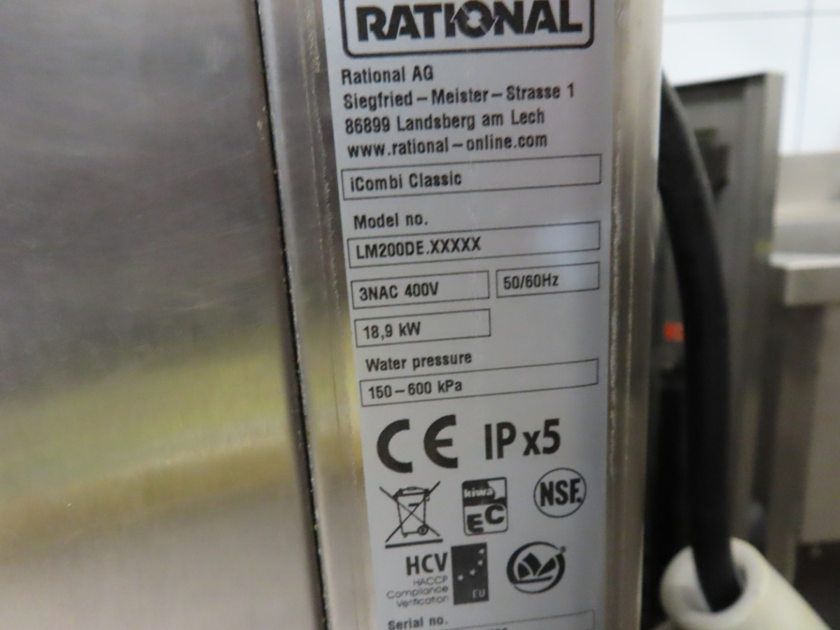 1 Kombidämpfer, Fabr. Rational, Typ iCombi Classic 10 x GN 1/1 Fassungsvermögen, Nr. LM200DE.XXXXX, 18,9 kW, mit Edelstahl-Untergestell und 6 GN-Behältern inklusive 2 Stück mit Lochung
