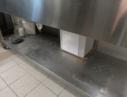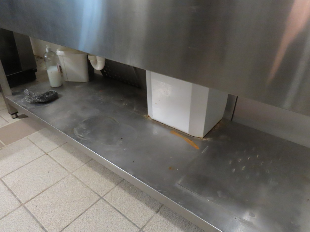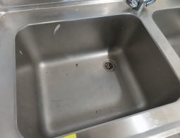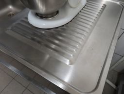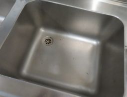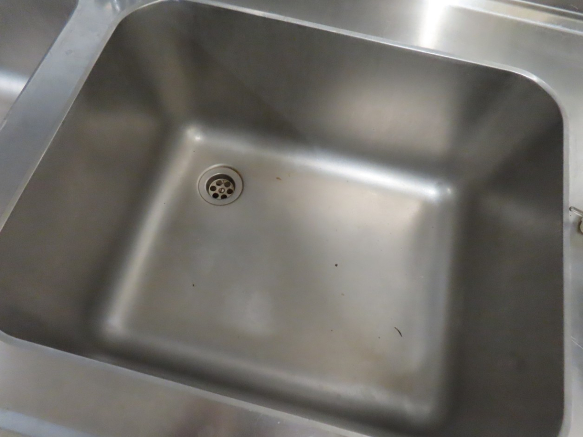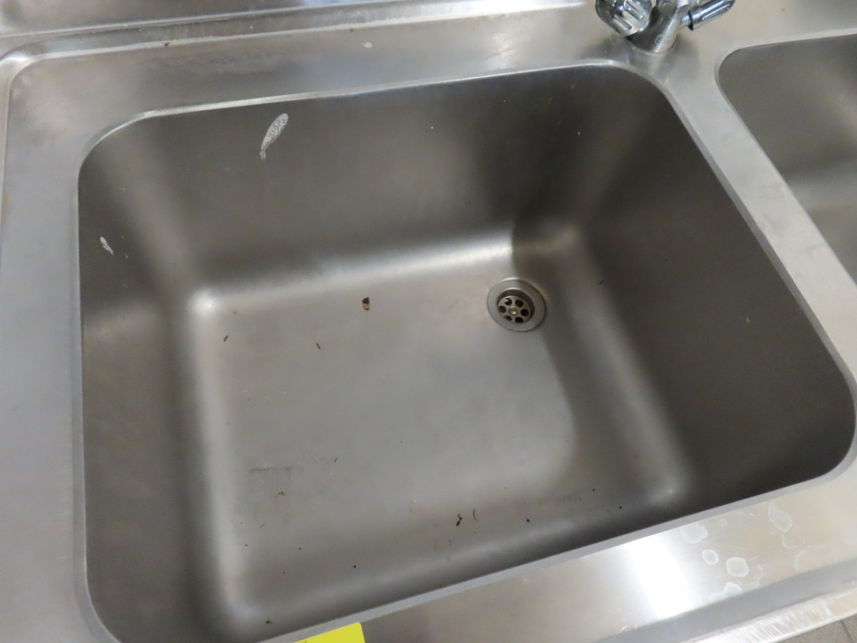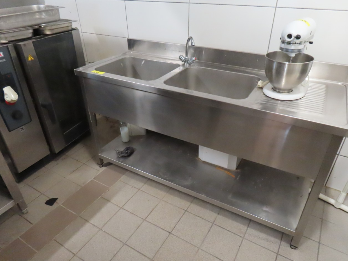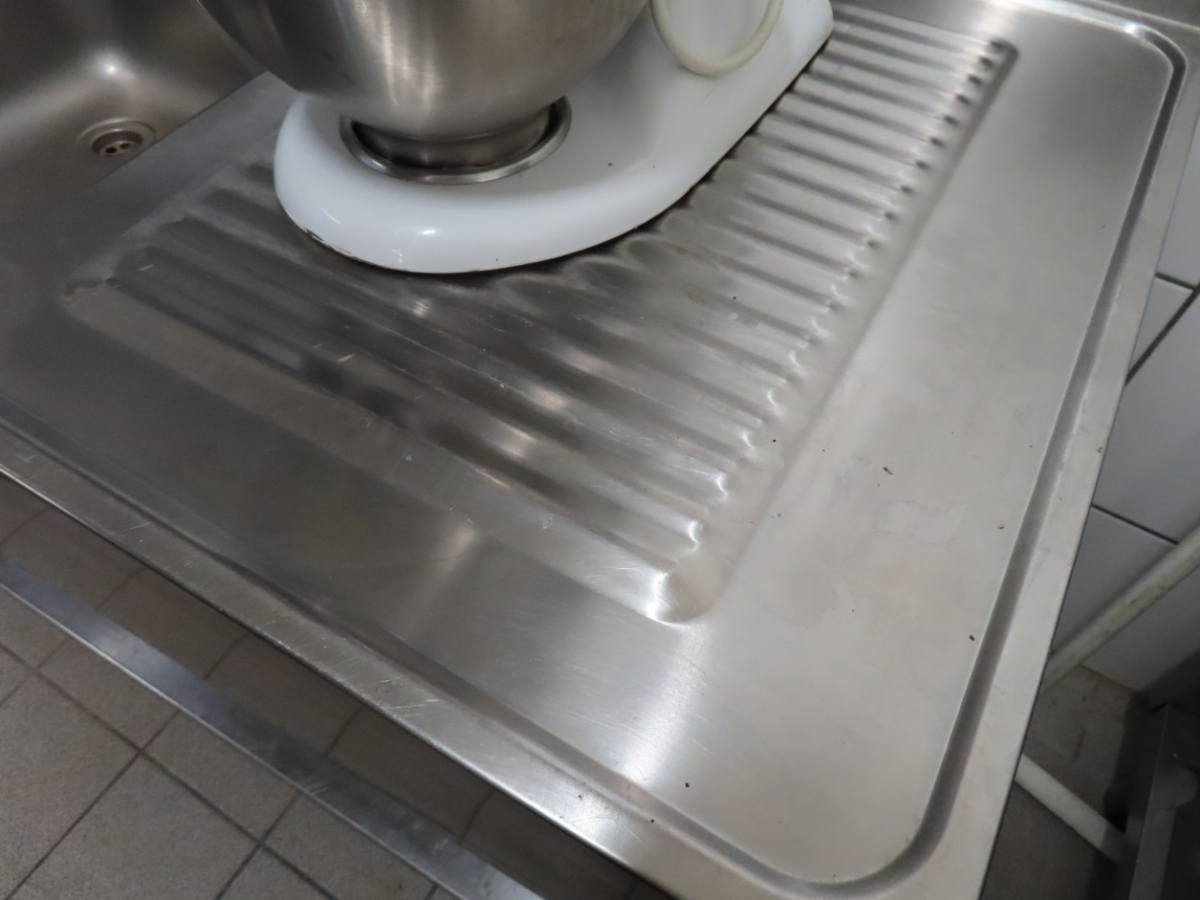 1 Edelstahl-Spültisch mit 2 Spülbecken, Ablauf sowie Ablage und Aufkantung, ca. 1,60 m breit x 0,59 m tief