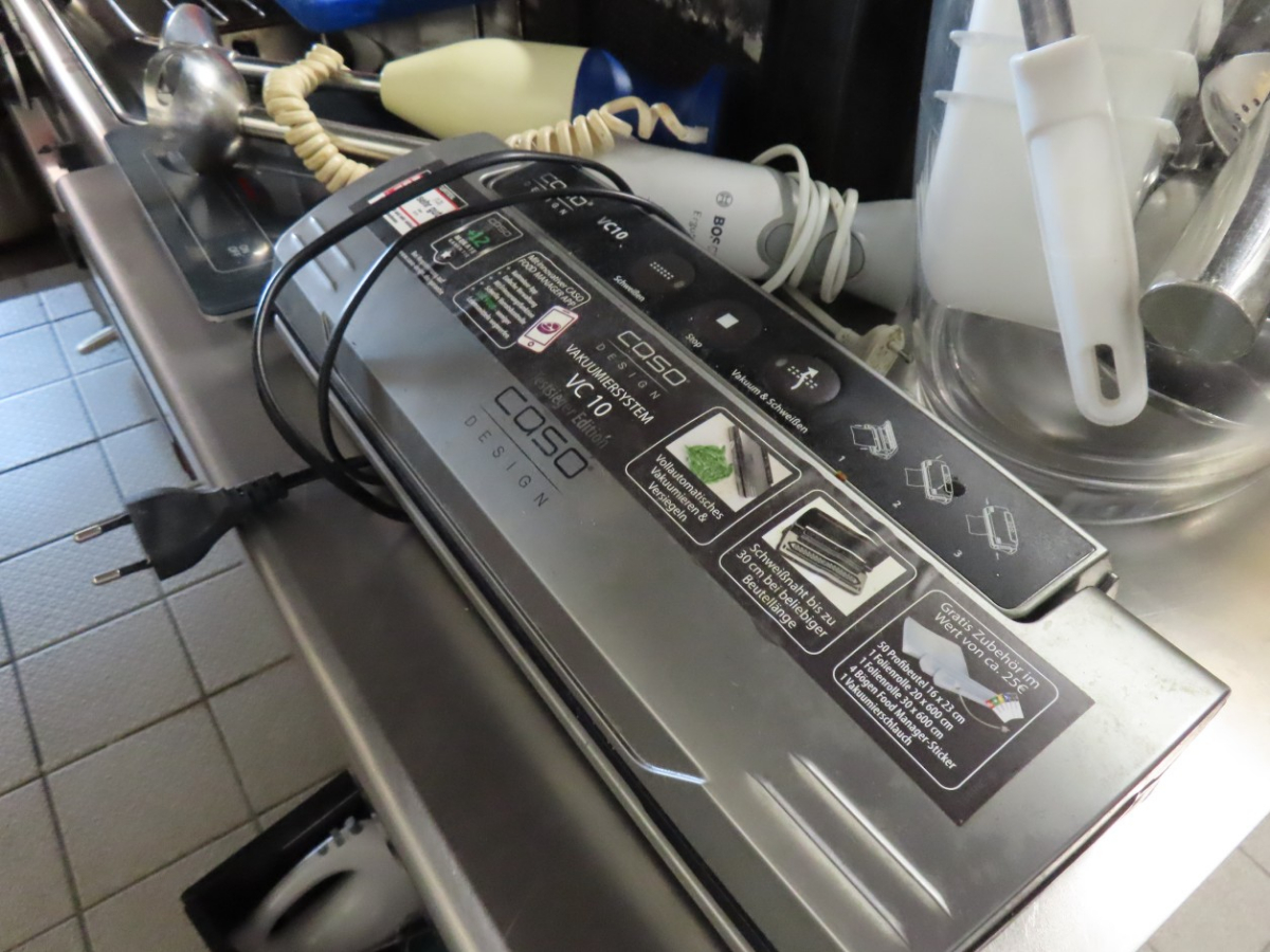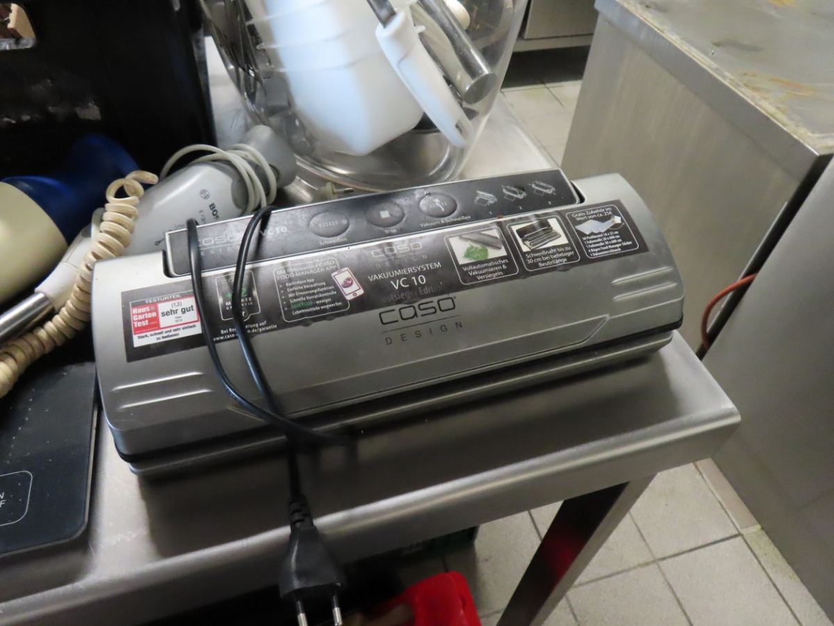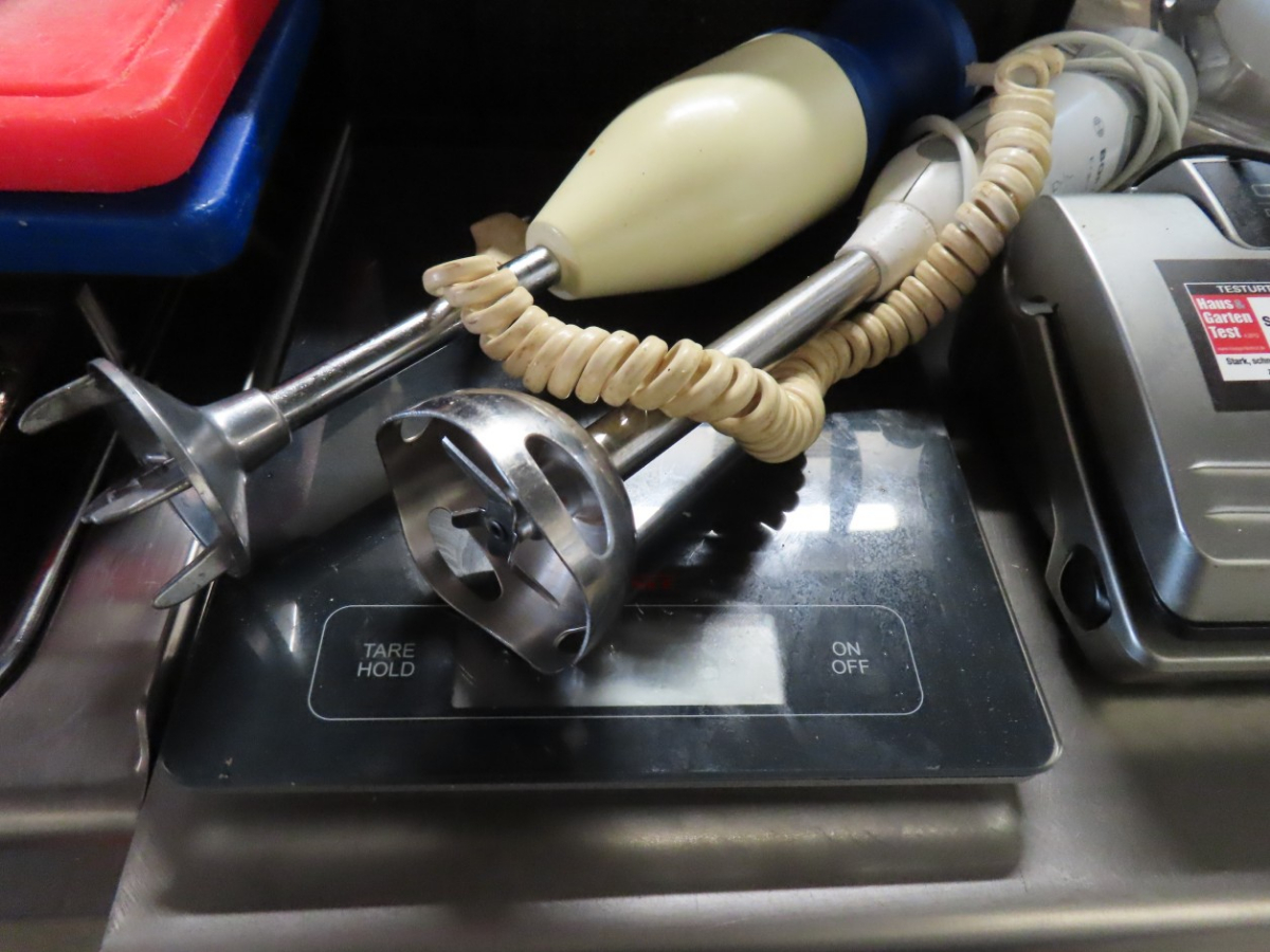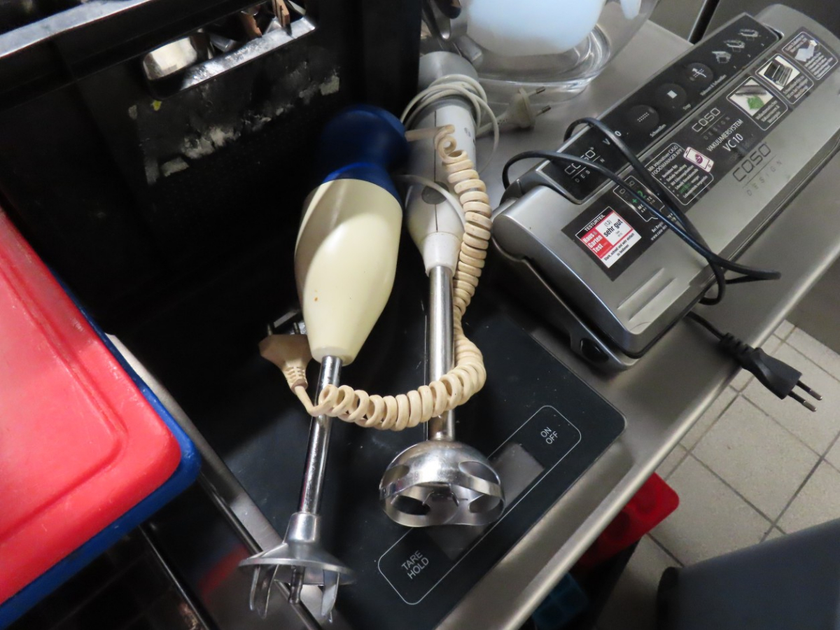 1 Posten Küchenutensilien, bestehend aus: Schaumkellen, Löffeln, Dosenöffnern, Stampfern, Schneebesen, Zangen, Kellen, Pfannenwendern, Handmixern, Küchenwaagen, Vakuumiergerät, Fabr. Caso, Typ VC 10, Schneidebrettern, Sahne-Siphon, Fabr. iSi, Eiswürfelbereiter, Kuchenrolle, Handmixer, Messbechern, etc.