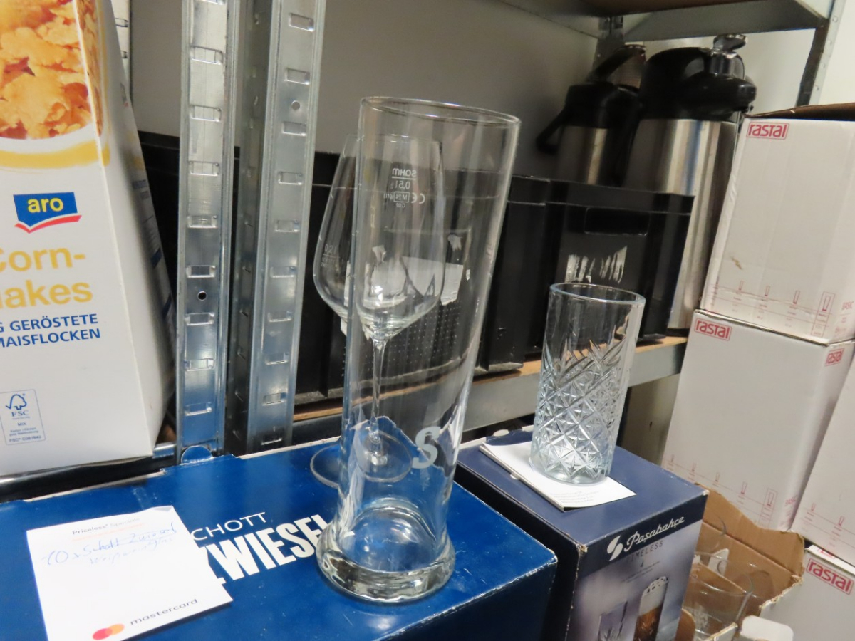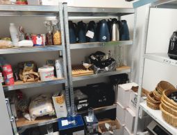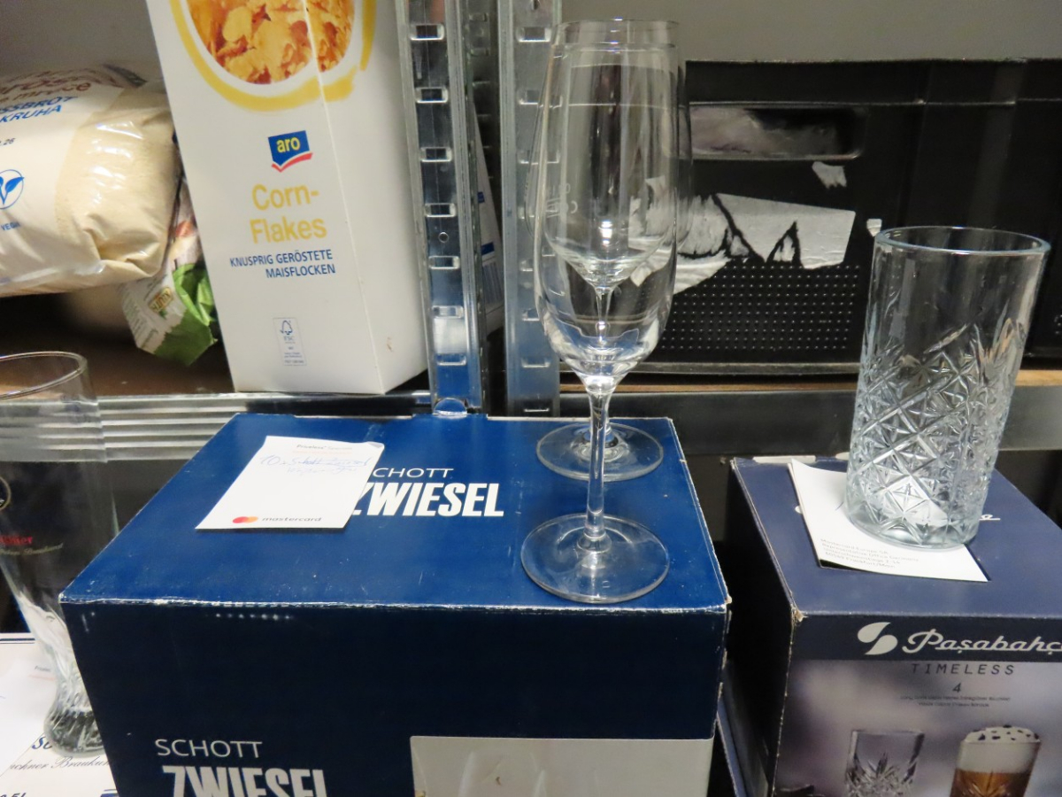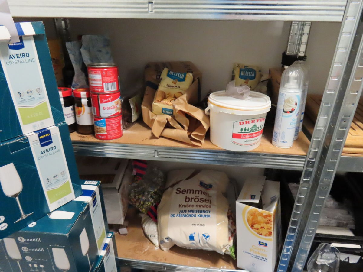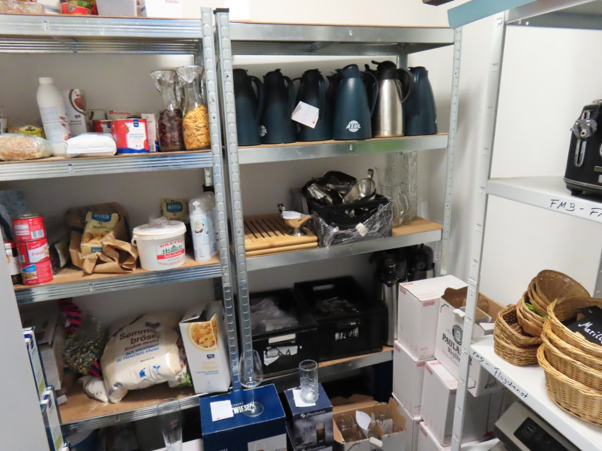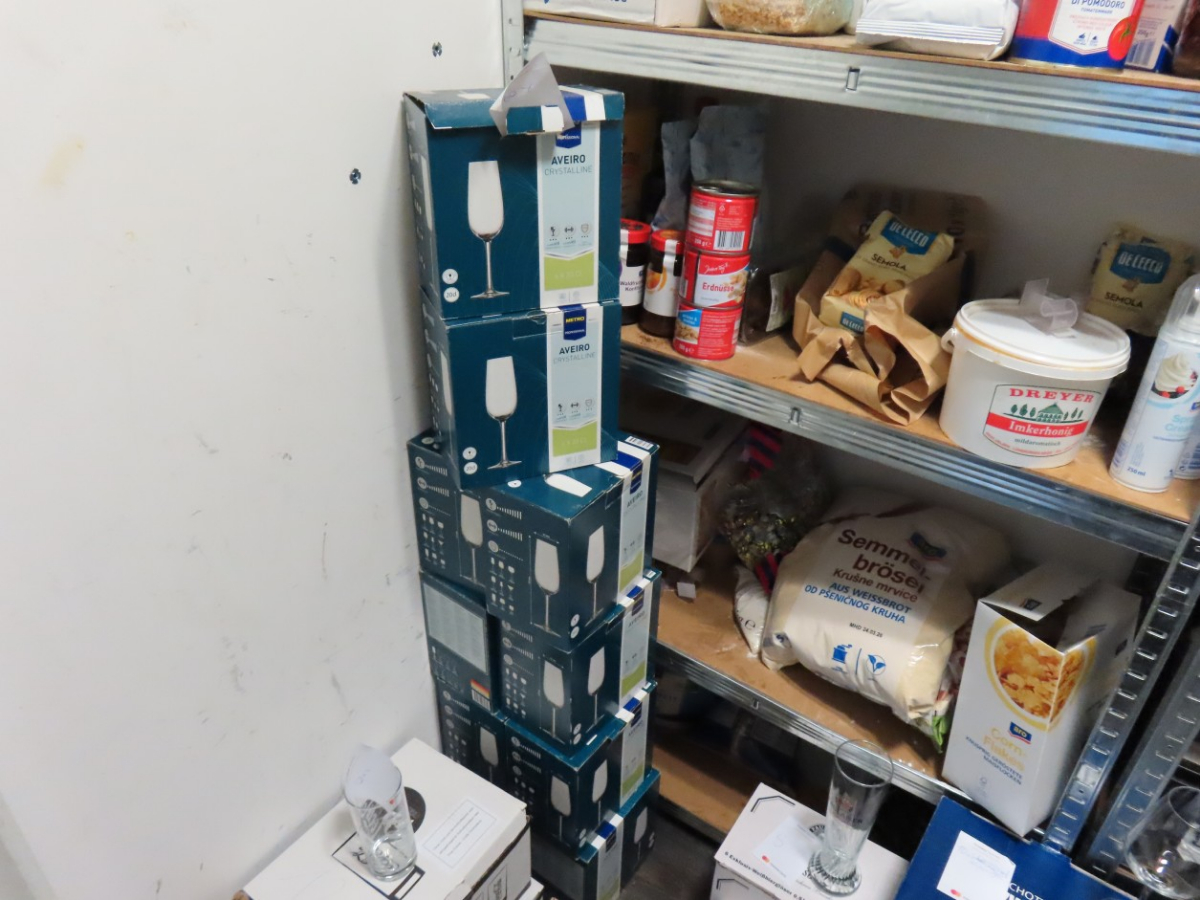 1 Rauminhalt, bestehend aus: 3 Steckregalen, Metall, mit Inhalt: 5 Cafing-Tischgeräte, 6 x Brennpaste, 1 elektrischer Insektenvernichter, Metall, 2 Toaster, Fabr. Westinghouse (4 Slice Toaster), Backpapier, Servietten, Kaffeefilter, diverse Servierkörbe, Catering-Beschriftungsschilder, 26 Spiral-Eierbecher, 2 Induktions-Kochfelder, Fabr. Metro, 1 elektrischer Suppentopf, 1 Heiß-Getränkeautomat, Fabr. Clatronic, EKA 3338, 25 Liter, 1 Posten Gläser, 179 Stück (32 Paulaner Weißbiergläser im Karton, 24 Wassergläser, Aufschrift: Vaihinger, 12 Longdrinkgläsern Pasabahce Timeless 52800 450ml Clear, 10 Weißweingläser, Fabr. Schott Zwiesel, 5 Weißbiergläser Paulaner, 6 Mehrzweckgläser, Aufschrift: Schweppes 0,2 l, 24 Coca-Cola Gläser, 6 Gläser Aufschrift: S, 60 Sektgläser Metro Aveiro Crystalline professional 20 cl), 14 Thermoskannen, Aufschrift: Azul Cafe, 20 Saucieren, Edelstahl, diverses Besteck, bestehend aus: Löffeln, Gabeln, Messern, 3 Pumpkannen Aufschrift: Tchibo, 1 Posten Lebensmittel (Semmelbrösel, Erdnüsse, Tomaten in Dosen, Sahne, Soßenbinder, Kakaopulver, Backpulver, Gelatine, etc.) zum Teil größten Teil angebrochen