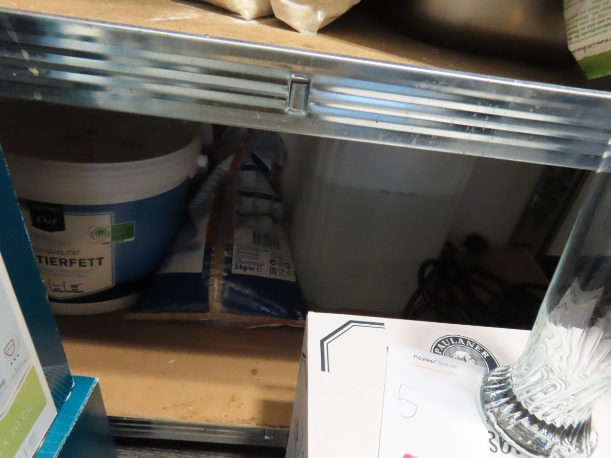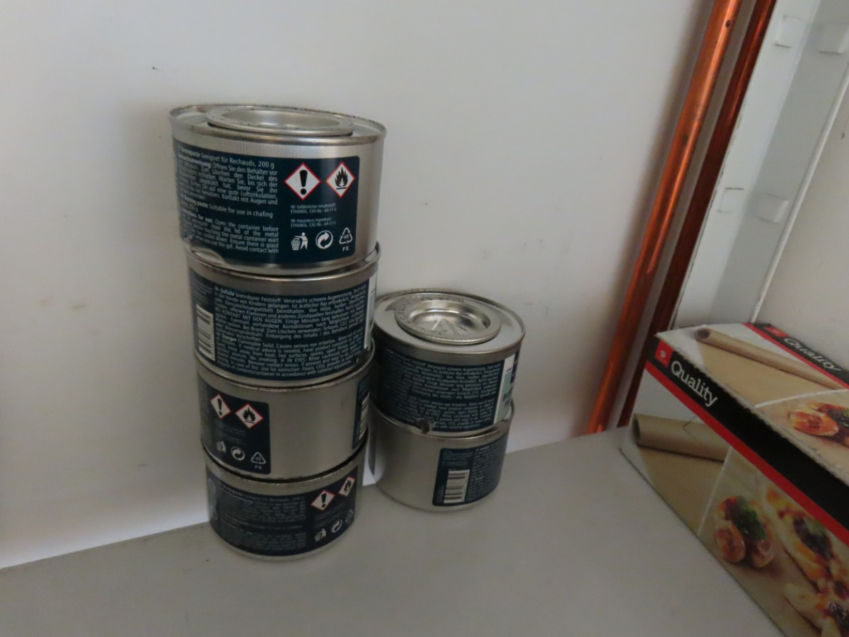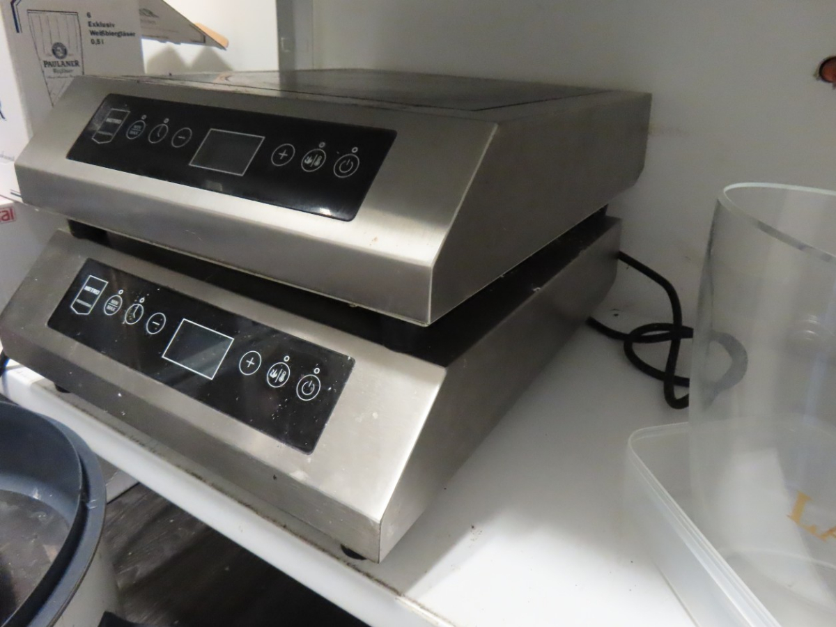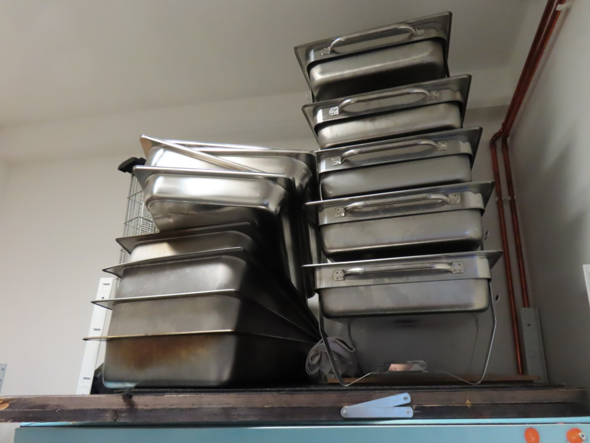 1 Rauminhalt, bestehend aus: 3 Steckregalen, Metall, mit Inhalt: 5 Cafing-Tischgeräte, 6 x Brennpaste, 1 elektrischer Insektenvernichter, Metall, 2 Toaster, Fabr. Westinghouse (4 Slice Toaster), Backpapier, Servietten, Kaffeefilter, diverse Servierkörbe, Catering-Beschriftungsschilder, 26 Spiral-Eierbecher, 2 Induktions-Kochfelder, Fabr. Metro, 1 elektrischer Suppentopf, 1 Heiß-Getränkeautomat, Fabr. Clatronic, EKA 3338, 25 Liter, 1 Posten Gläser, 179 Stück (32 Paulaner Weißbiergläser im Karton, 24 Wassergläser, Aufschrift: Vaihinger, 12 Longdrinkgläsern Pasabahce Timeless 52800 450ml Clear, 10 Weißweingläser, Fabr. Schott Zwiesel, 5 Weißbiergläser Paulaner, 6 Mehrzweckgläser, Aufschrift: Schweppes 0,2 l, 24 Coca-Cola Gläser, 6 Gläser Aufschrift: S, 60 Sektgläser Metro Aveiro Crystalline professional 20 cl), 14 Thermoskannen, Aufschrift: Azul Cafe, 20 Saucieren, Edelstahl, diverses Besteck, bestehend aus: Löffeln, Gabeln, Messern, 3 Pumpkannen Aufschrift: Tchibo, 1 Posten Lebensmittel (Semmelbrösel, Erdnüsse, Tomaten in Dosen, Sahne, Soßenbinder, Kakaopulver, Backpulver, Gelatine, etc.) zum Teil größten Teil angebrochen