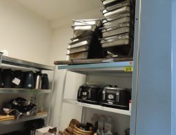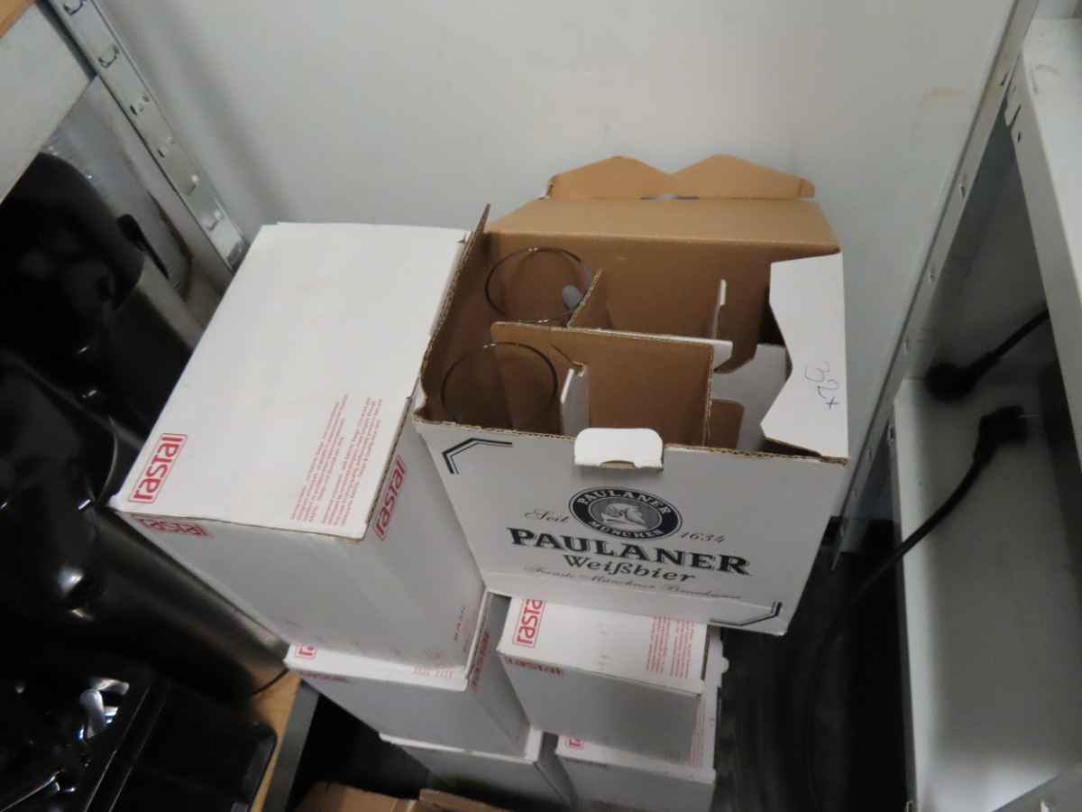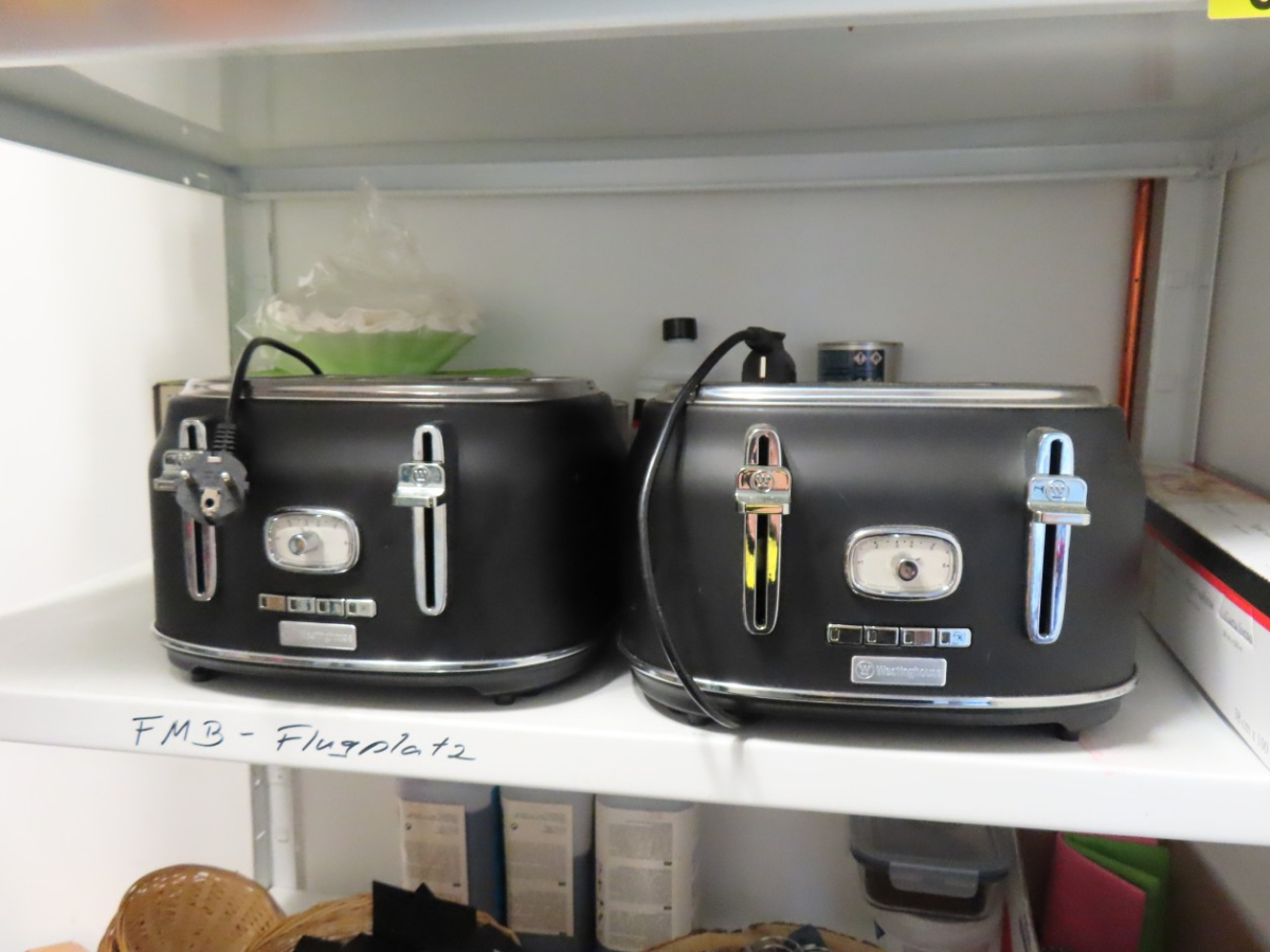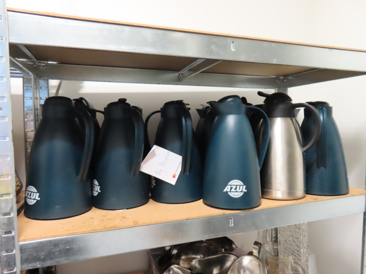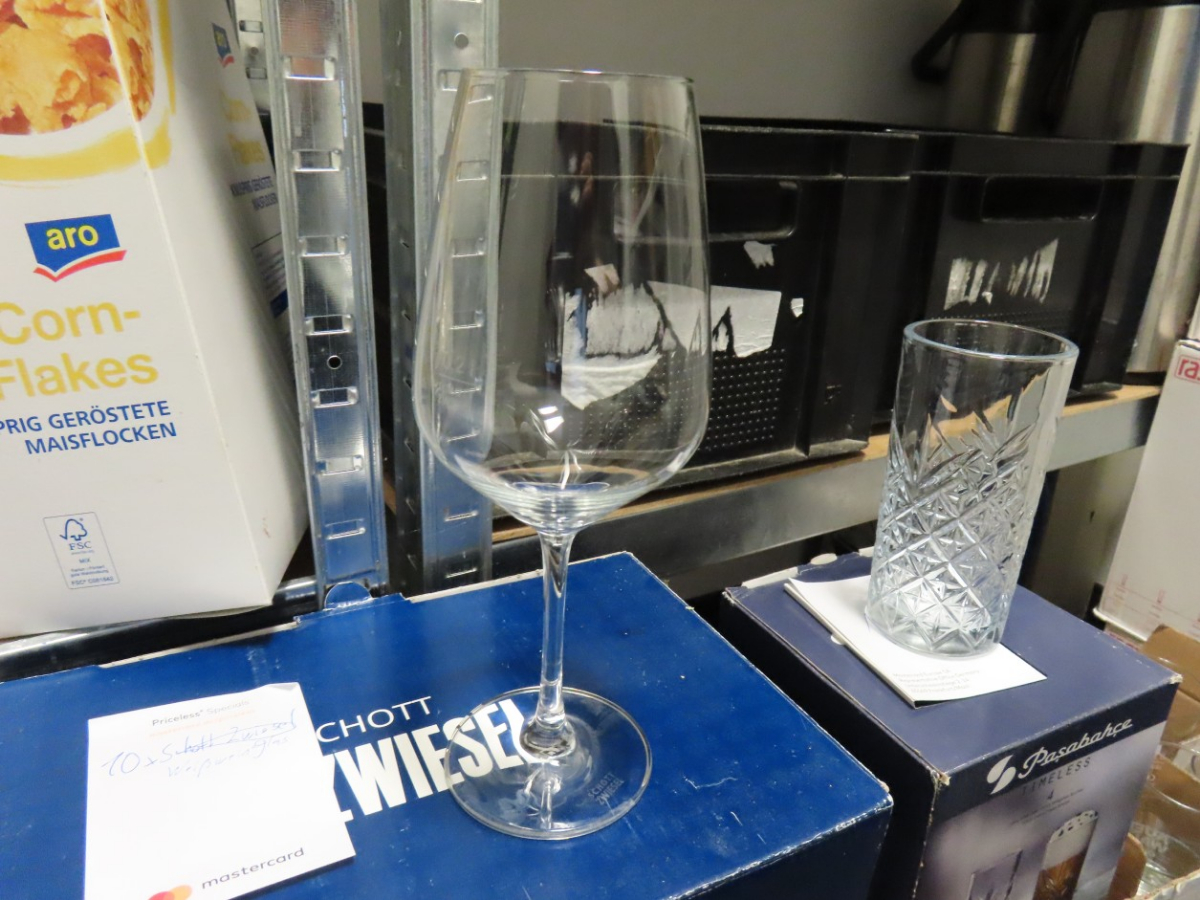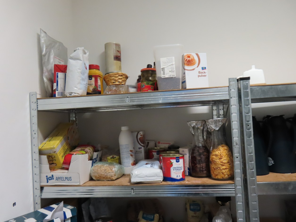 1 Rauminhalt, bestehend aus: 3 Steckregalen, Metall, mit Inhalt: 5 Cafing-Tischgeräte, 6 x Brennpaste, 1 elektrischer Insektenvernichter, Metall, 2 Toaster, Fabr. Westinghouse (4 Slice Toaster), Backpapier, Servietten, Kaffeefilter, diverse Servierkörbe, Catering-Beschriftungsschilder, 26 Spiral-Eierbecher, 2 Induktions-Kochfelder, Fabr. Metro, 1 elektrischer Suppentopf, 1 Heiß-Getränkeautomat, Fabr. Clatronic, EKA 3338, 25 Liter, 1 Posten Gläser, 179 Stück (32 Paulaner Weißbiergläser im Karton, 24 Wassergläser, Aufschrift: Vaihinger, 12 Longdrinkgläsern Pasabahce Timeless 52800 450ml Clear, 10 Weißweingläser, Fabr. Schott Zwiesel, 5 Weißbiergläser Paulaner, 6 Mehrzweckgläser, Aufschrift: Schweppes 0,2 l, 24 Coca-Cola Gläser, 6 Gläser Aufschrift: S, 60 Sektgläser Metro Aveiro Crystalline professional 20 cl), 14 Thermoskannen, Aufschrift: Azul Cafe, 20 Saucieren, Edelstahl, diverses Besteck, bestehend aus: Löffeln, Gabeln, Messern, 3 Pumpkannen Aufschrift: Tchibo, 1 Posten Lebensmittel (Semmelbrösel, Erdnüsse, Tomaten in Dosen, Sahne, Soßenbinder, Kakaopulver, Backpulver, Gelatine, etc.) zum Teil größten Teil angebrochen