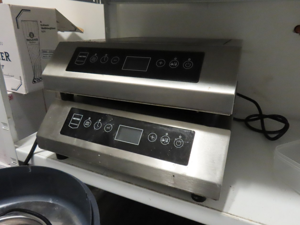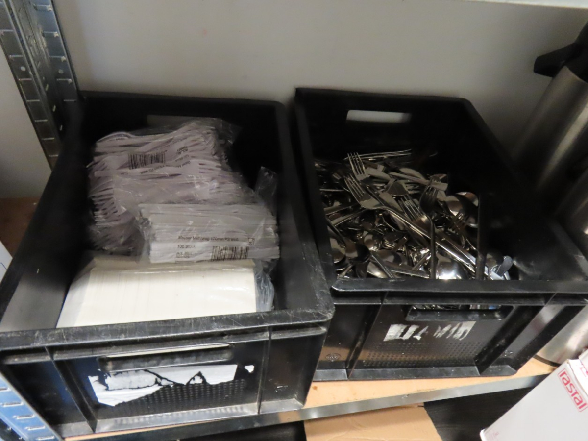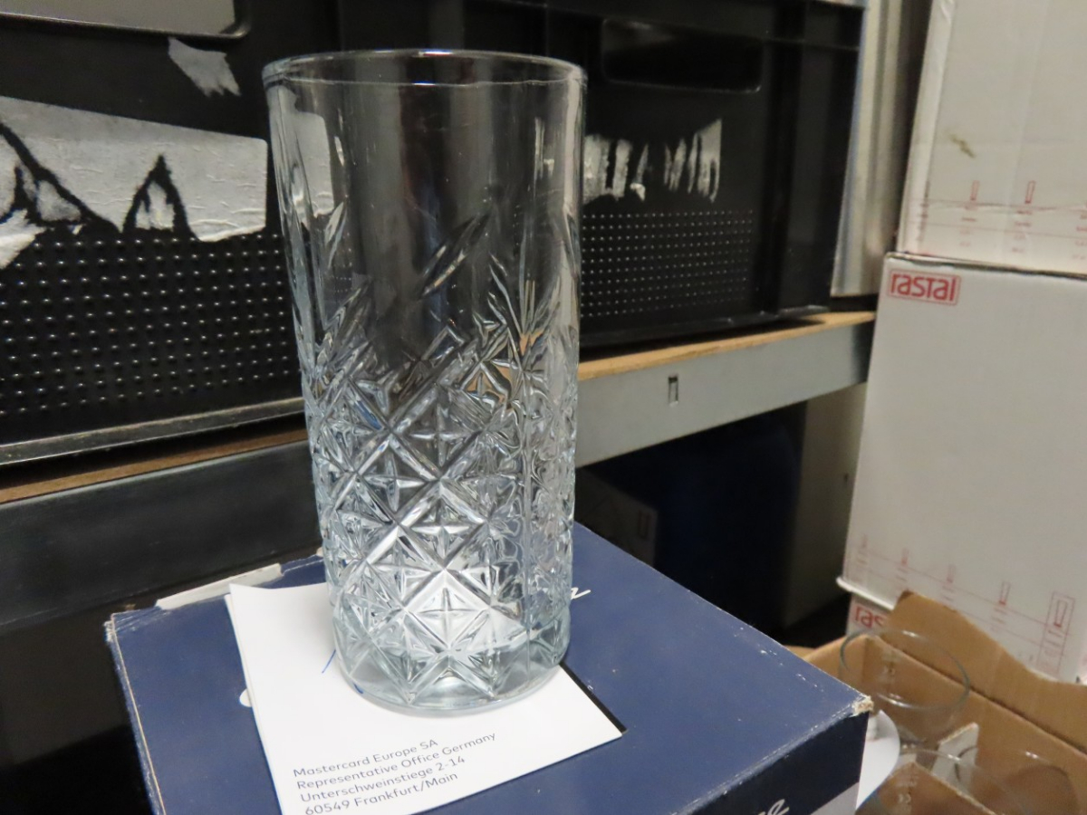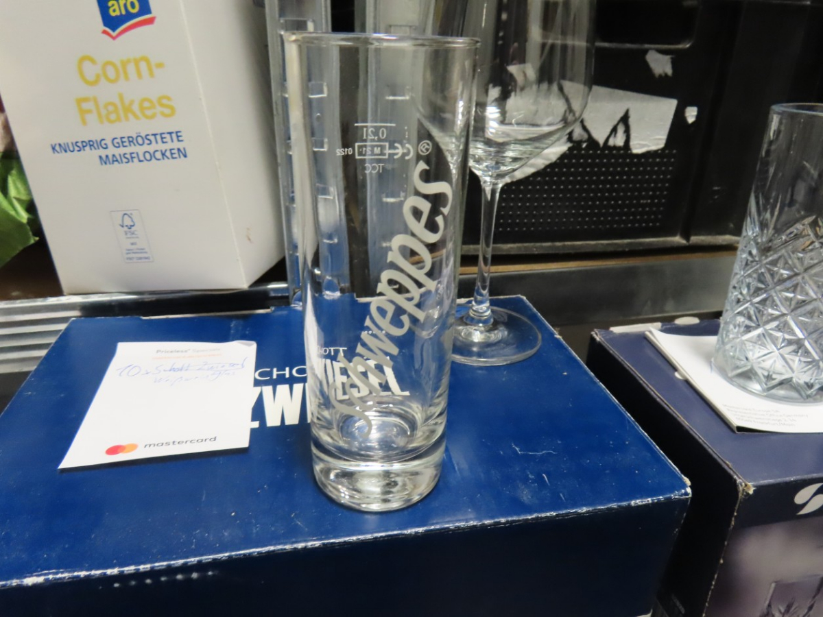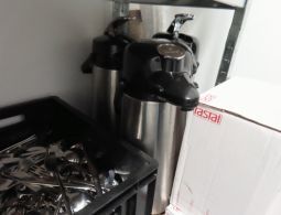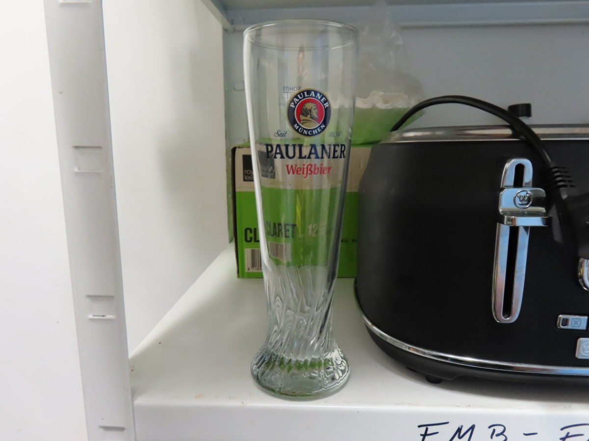 1 Rauminhalt, bestehend aus: 3 Steckregalen, Metall, mit Inhalt: 5 Cafing-Tischgeräte, 6 x Brennpaste, 1 elektrischer Insektenvernichter, Metall, 2 Toaster, Fabr. Westinghouse (4 Slice Toaster), Backpapier, Servietten, Kaffeefilter, diverse Servierkörbe, Catering-Beschriftungsschilder, 26 Spiral-Eierbecher, 2 Induktions-Kochfelder, Fabr. Metro, 1 elektrischer Suppentopf, 1 Heiß-Getränkeautomat, Fabr. Clatronic, EKA 3338, 25 Liter, 1 Posten Gläser, 179 Stück (32 Paulaner Weißbiergläser im Karton, 24 Wassergläser, Aufschrift: Vaihinger, 12 Longdrinkgläsern Pasabahce Timeless 52800 450ml Clear, 10 Weißweingläser, Fabr. Schott Zwiesel, 5 Weißbiergläser Paulaner, 6 Mehrzweckgläser, Aufschrift: Schweppes 0,2 l, 24 Coca-Cola Gläser, 6 Gläser Aufschrift: S, 60 Sektgläser Metro Aveiro Crystalline professional 20 cl), 14 Thermoskannen, Aufschrift: Azul Cafe, 20 Saucieren, Edelstahl, diverses Besteck, bestehend aus: Löffeln, Gabeln, Messern, 3 Pumpkannen Aufschrift: Tchibo, 1 Posten Lebensmittel (Semmelbrösel, Erdnüsse, Tomaten in Dosen, Sahne, Soßenbinder, Kakaopulver, Backpulver, Gelatine, etc.) zum Teil größten Teil angebrochen