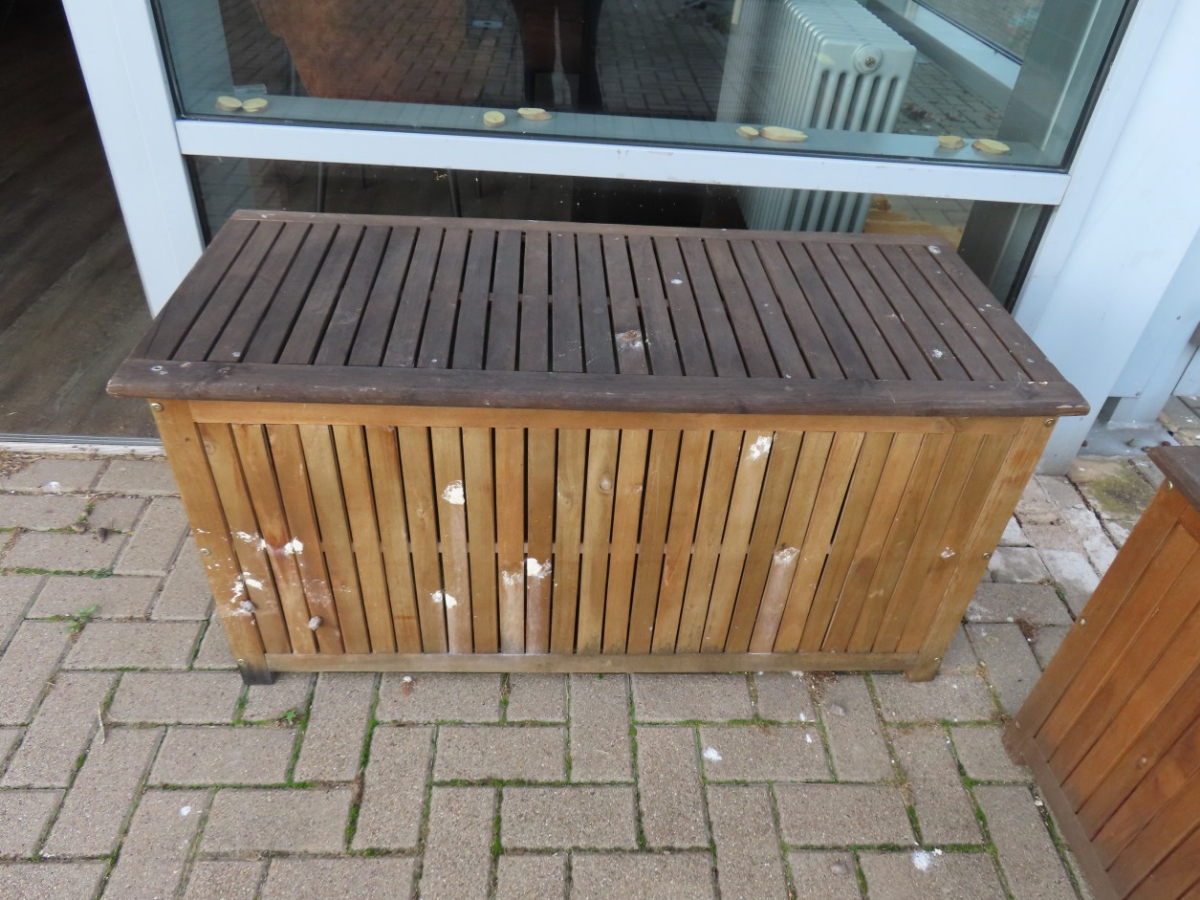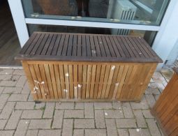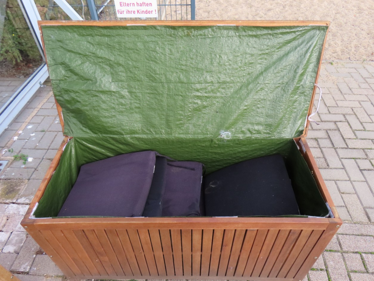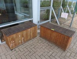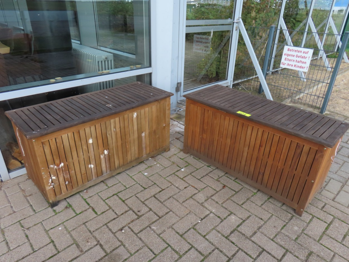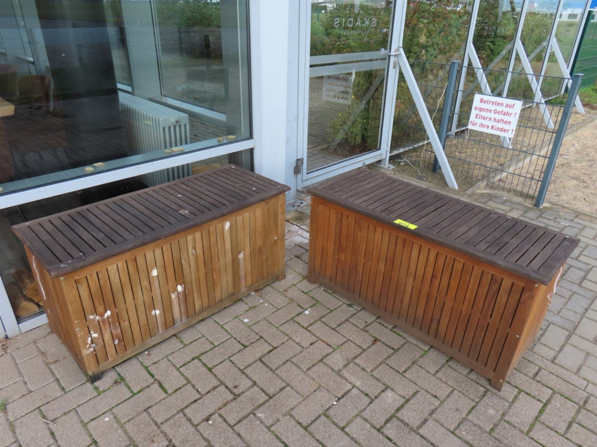 2 Kissenboxen, Holz, mit Deckel, ca. 0,50 m x 1,10 m, mit diversen Sitzkissen, zum Teil verschlissen