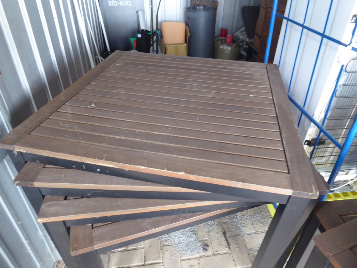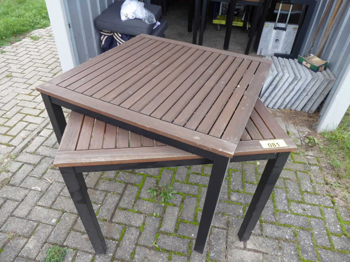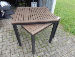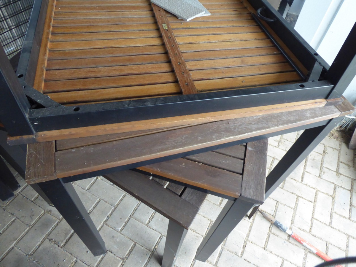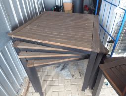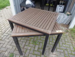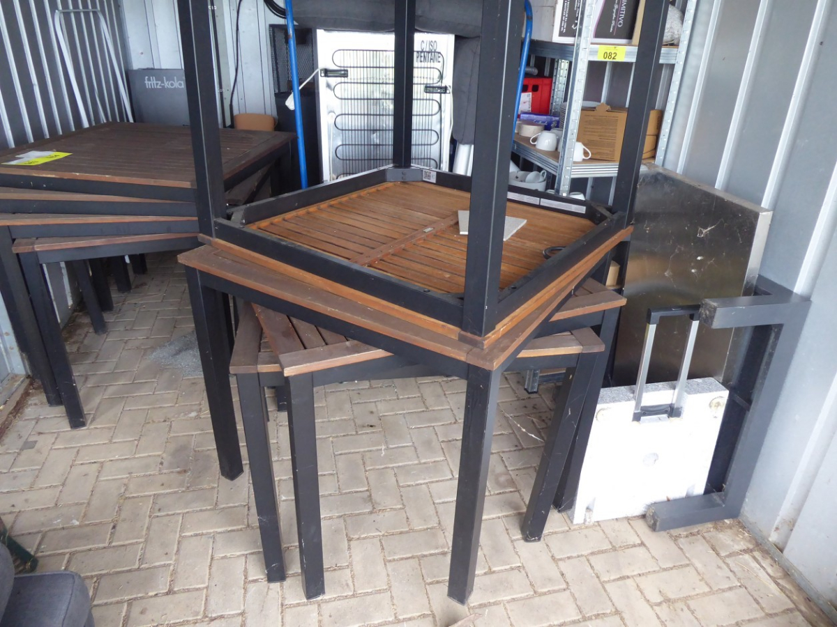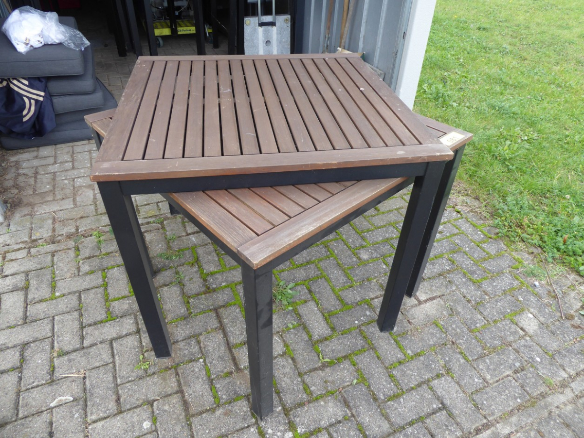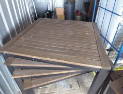 1 Posten Outdoor-Tische, Lamellen-Tischplatte Holzoptik, Gestell schwarz, Fabr. Metro, 10 Stück, á 0,90 m x 0,90 m x Höhe 0,75 m