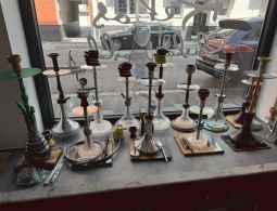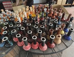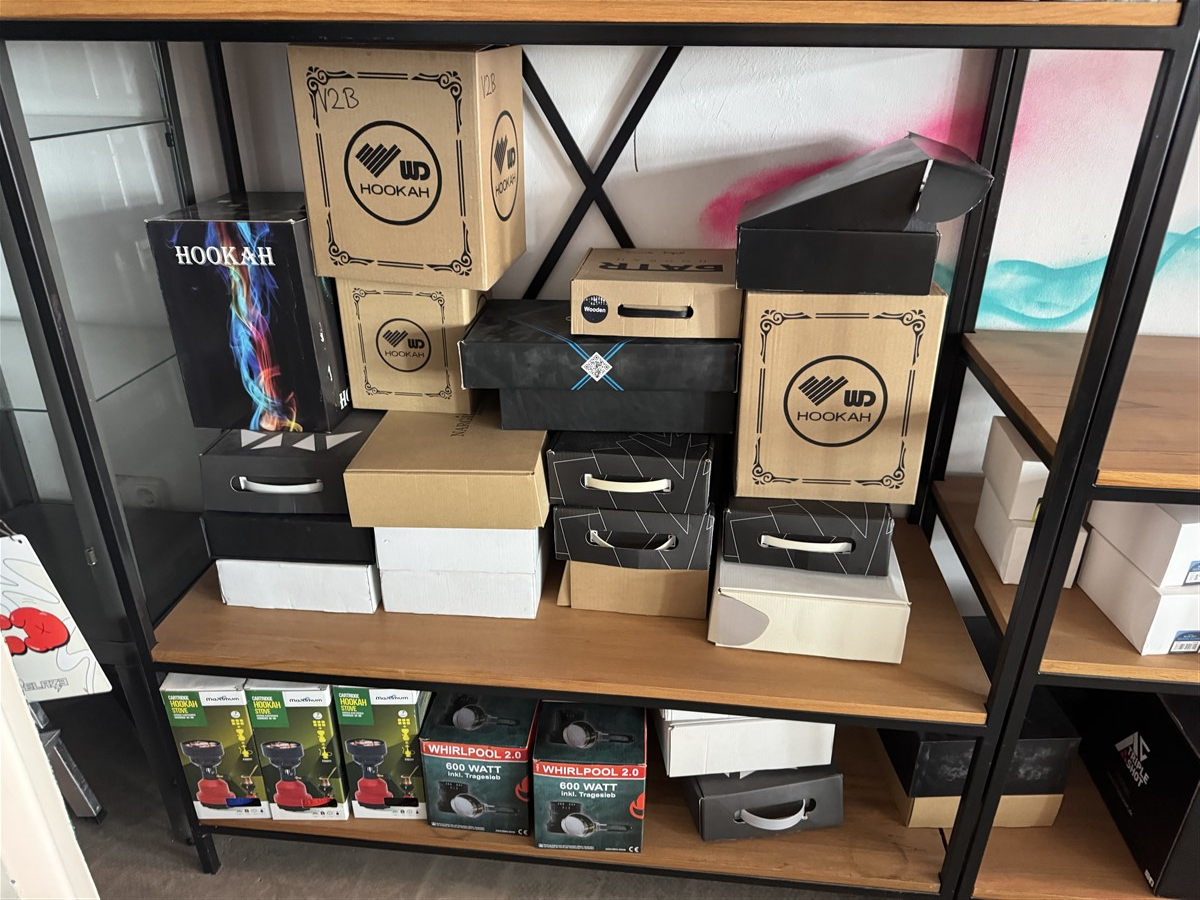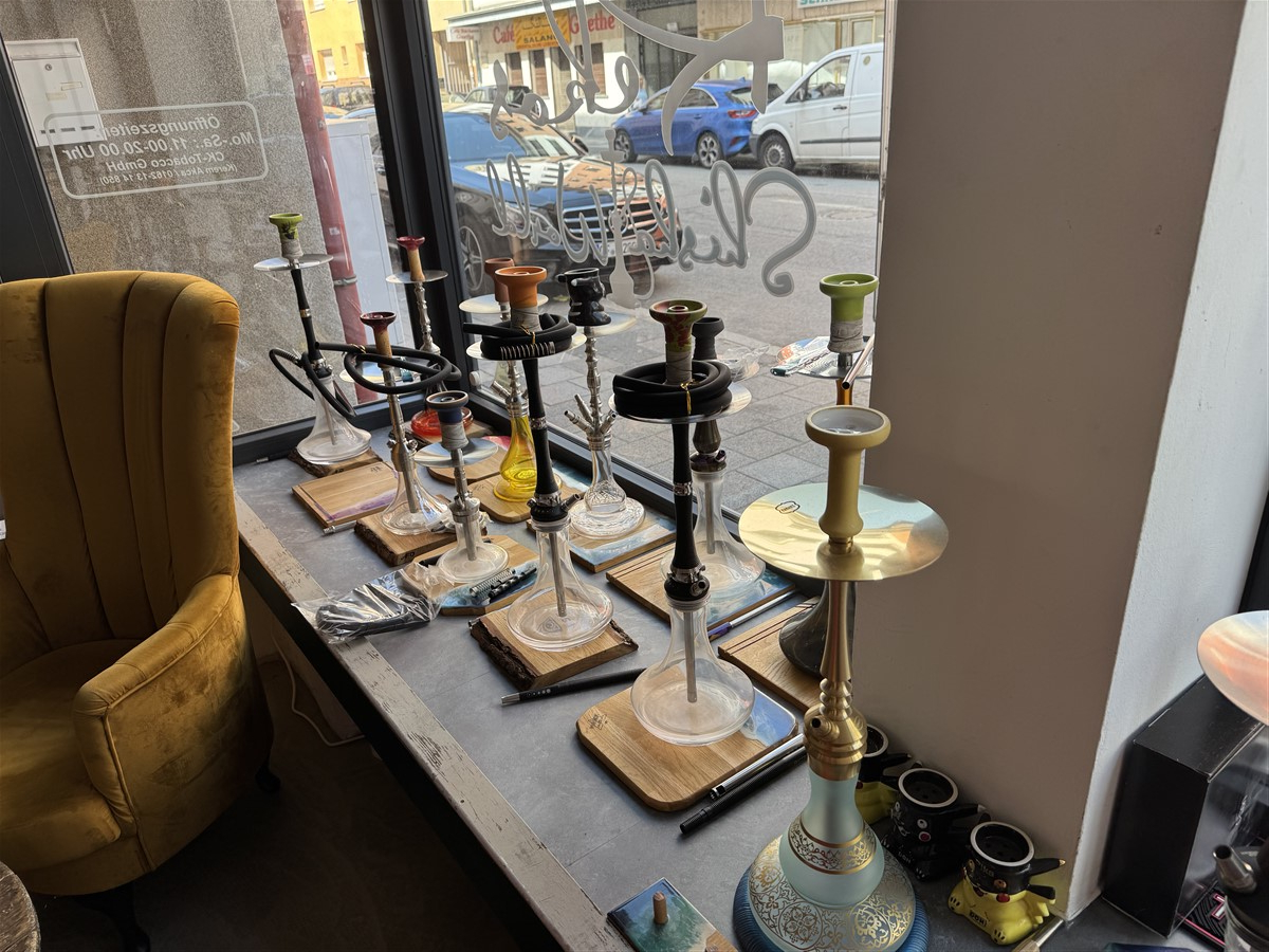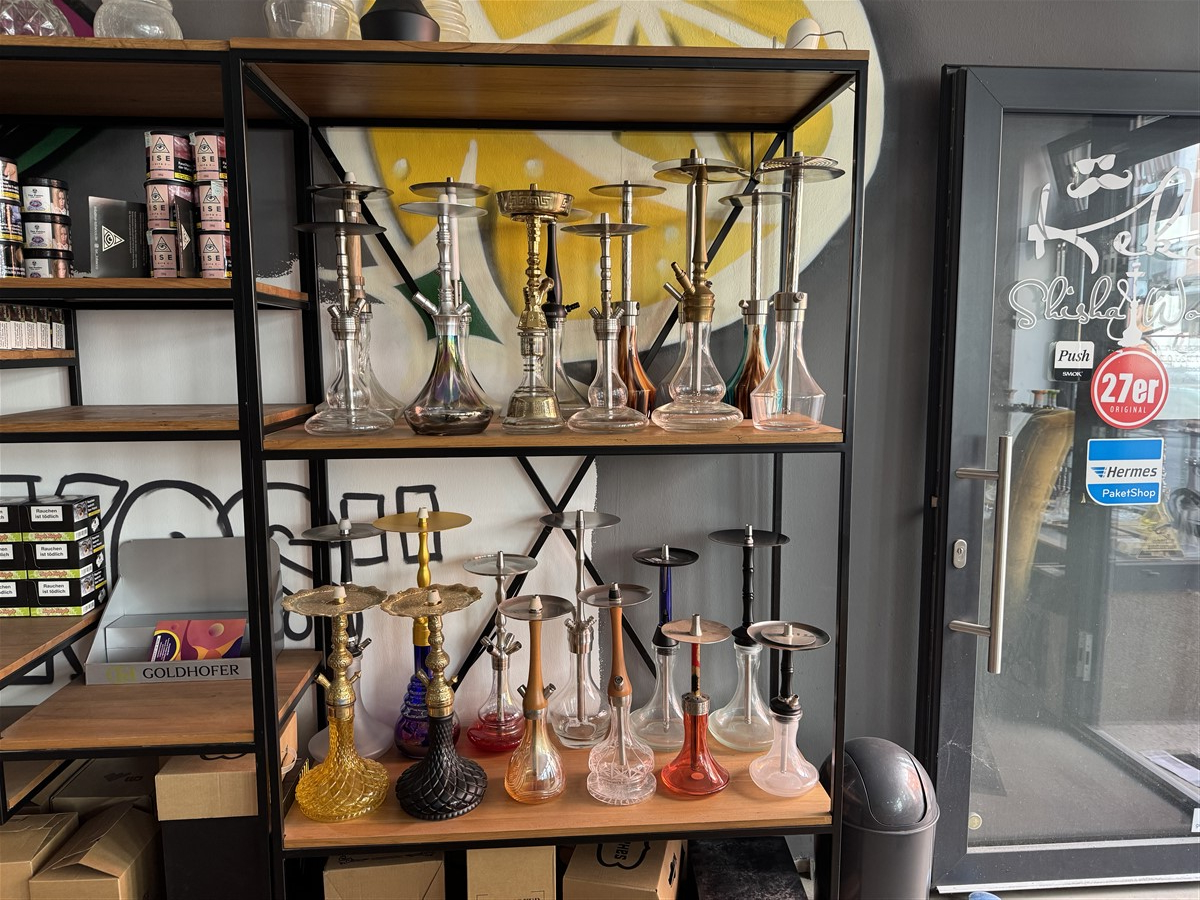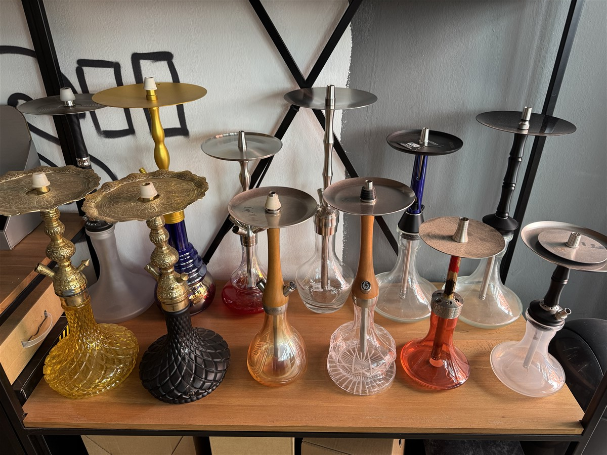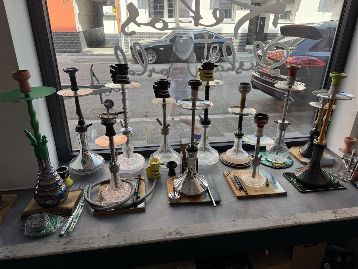 1 Wasserpfeifen - Shishas, aufgebaut, verschiedene Varianten ca. 60 Stück, Bowl/Vasen für Wasserpfeifen ca.16 Stück, Tonköpfe für Wasserpfeifen ca. 300 Stück, Molassefänger, Glas ca. 39 Stück, Windschutz: Fabr: TWO FACE, ca. 21 Stück, weitere Kleinteile: Kohlenzangen, BT-Lautsprecher, Mundstücke