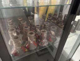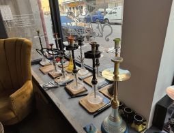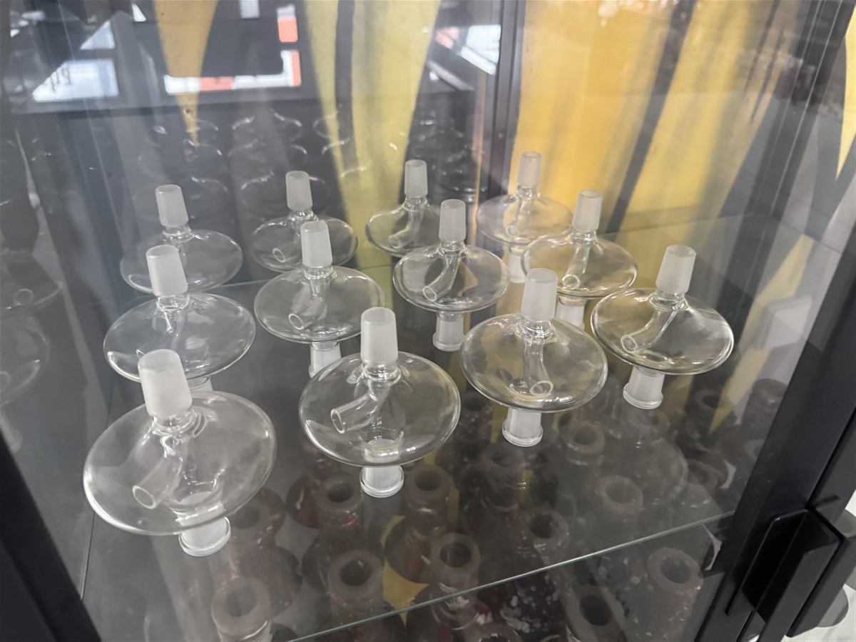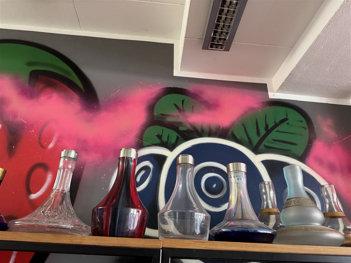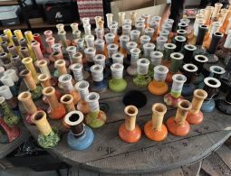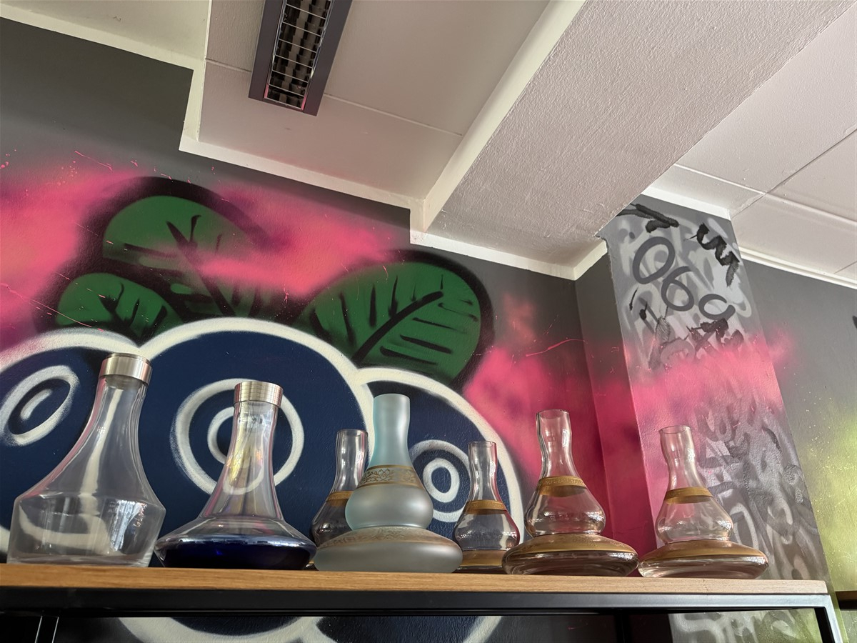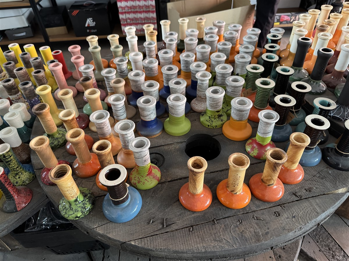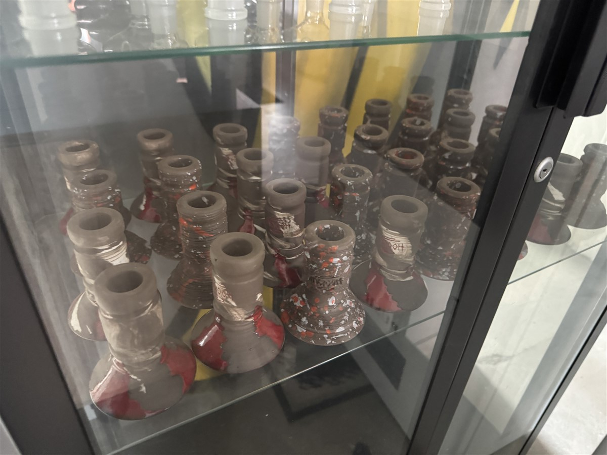1 Wasserpfeifen - Shishas, aufgebaut, verschiedene Varianten ca. 60 Stück, Bowl/Vasen für Wasserpfeifen ca.16 Stück, Tonköpfe für Wasserpfeifen ca. 300 Stück, Molassefänger, Glas ca. 39 Stück, Windschutz: Fabr: TWO FACE, ca. 21 Stück, weitere Kleinteile: Kohlenzangen, BT-Lautsprecher, Mundstücke