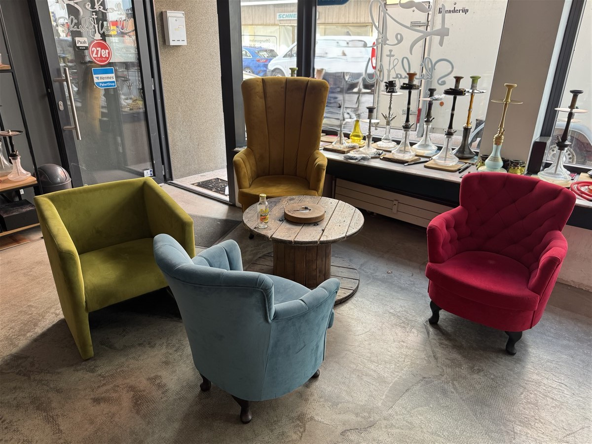 1 Sitzgruppe, 4 Sessel, verschiedene Designs, verschiedene Farben, Beistelltisch/Kabeltrommel