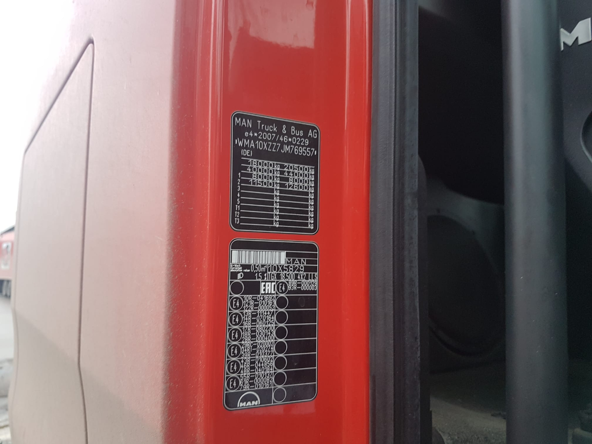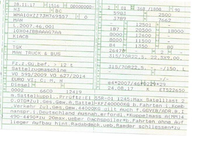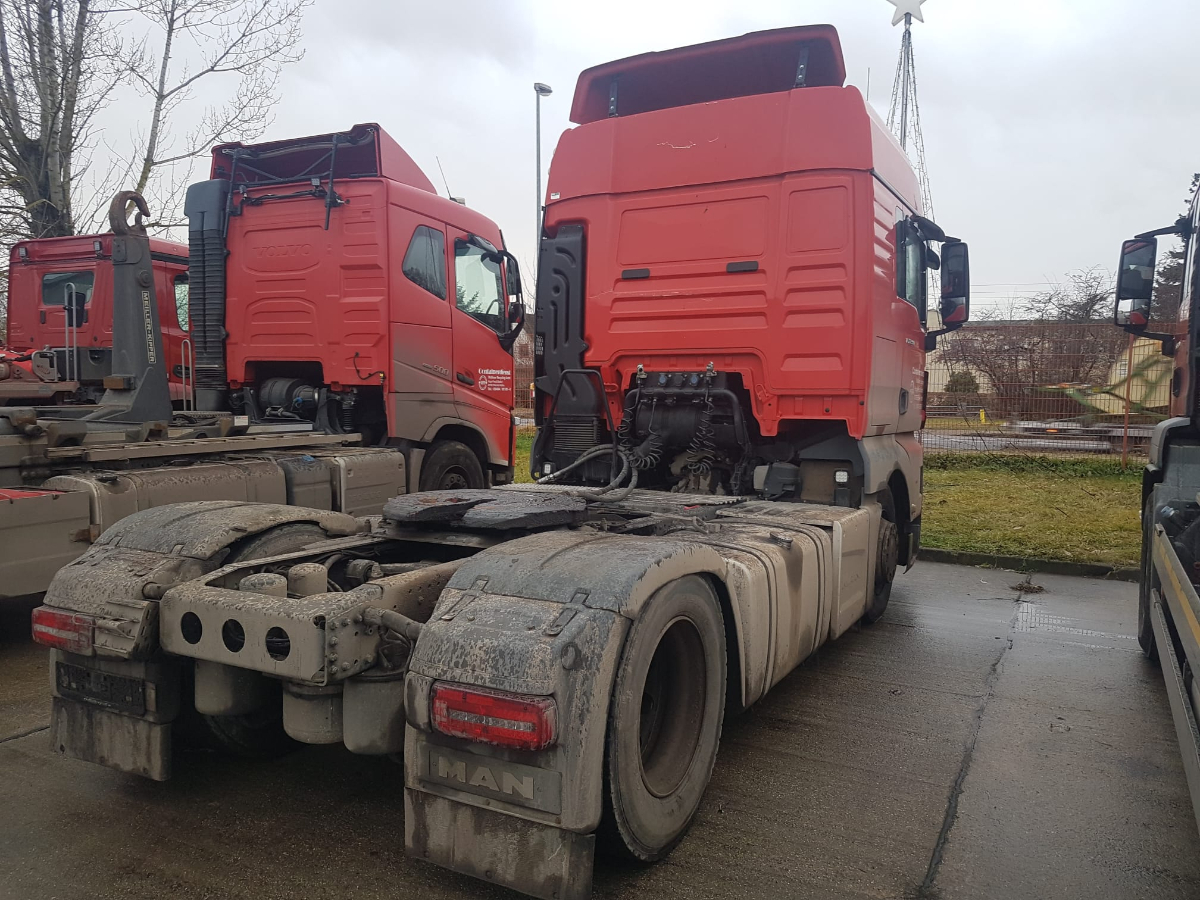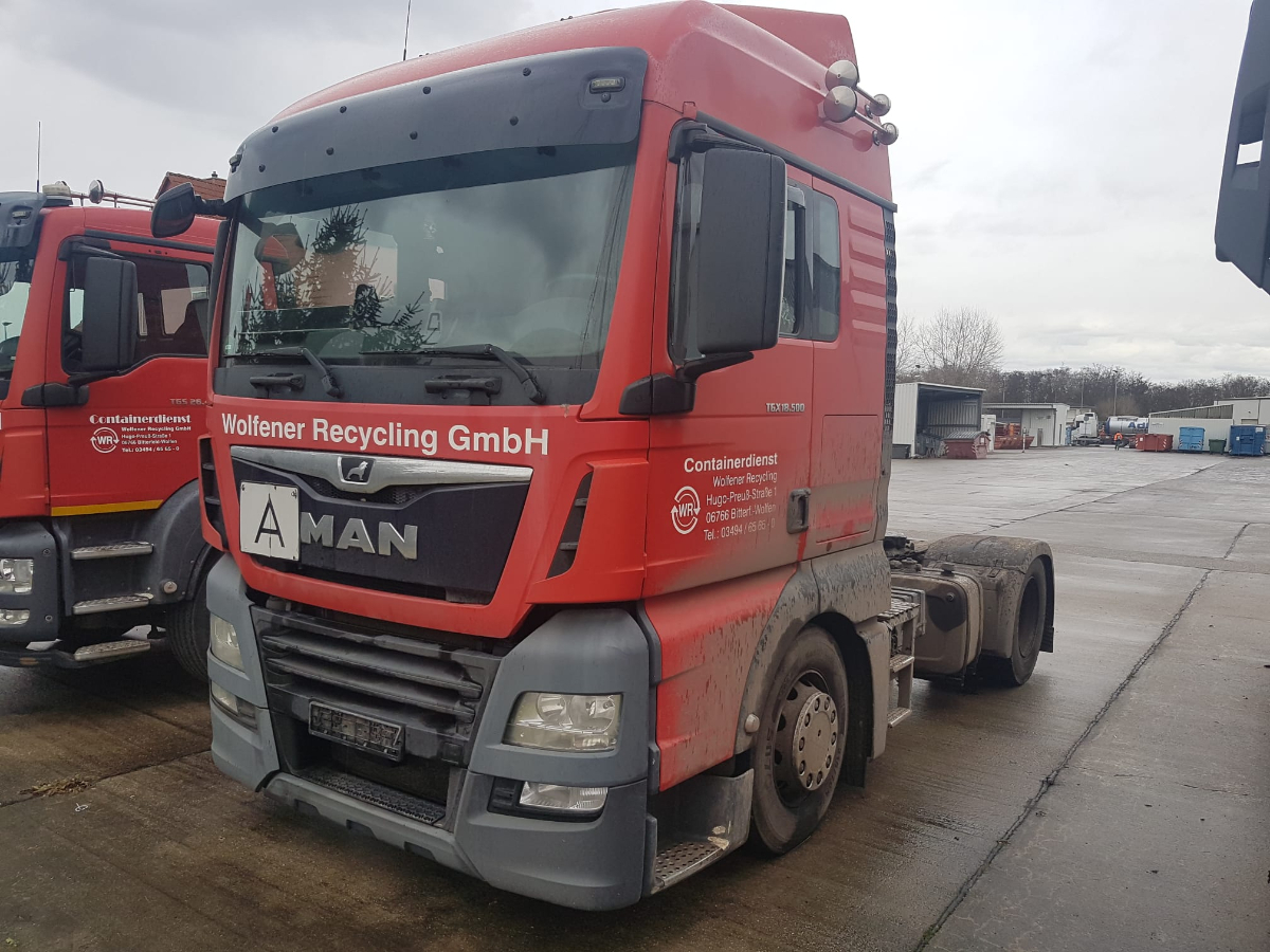 Sattelzugmaschine, Fabr. MAN, Typ TGX 18.500 4x2 LLS, Ident-Nr. WMA10XZZ7JM769557, Erstzulassung: 28.11.2017, Tachostand: 513.439 km, Leistung: 368 kW, Hubraum: 12.419 ccm, zulässiges Gesamtgewicht: 18.000 kg, nächste HU 11/2025, Zustand: Ecke vorne rechts leicht beschädigt, Radabdeckung hinten links und rechts leicht beschädigt
