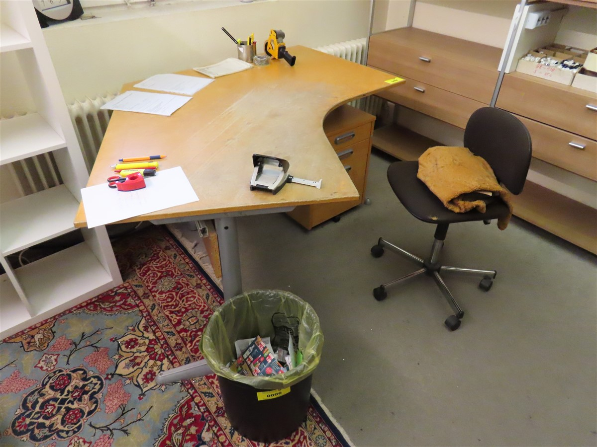 1 Eckschreibtisch, klein, Holzoptik, verschlissen, und 1 x Bürocontainer, rollbar, mit 3 Schubfächern sowie 1 x Bürodrehstuhl, Stoffbezug braun