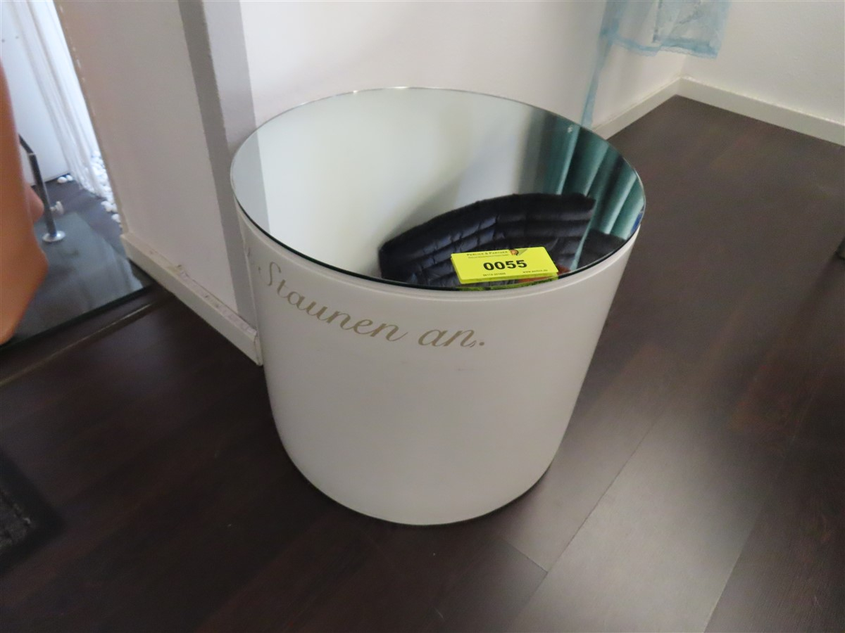 1 Ausstellungstisch, mit Spiegelplatte, Werbeaufschrift